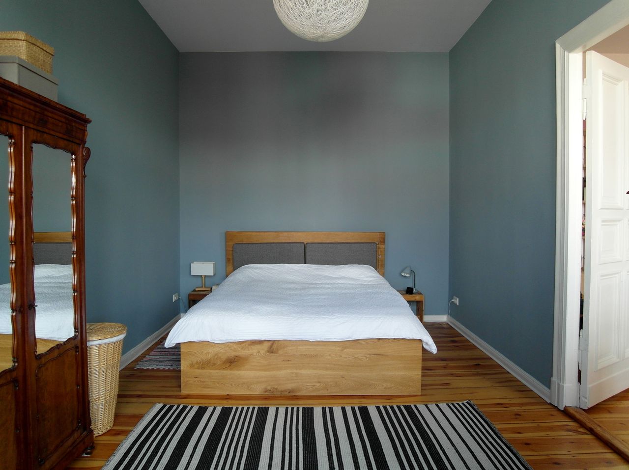 Jedes Zimmer hat farblich gestaltete Wände. Küche: mintgrün (eine Wand), Wohnzimmer: hellgrau (komplett), Arbeitszimmer: rosé (eine Wand), Schlafzimmer: taubenblau (komplett), Flur: dunkelblauer Sockel.