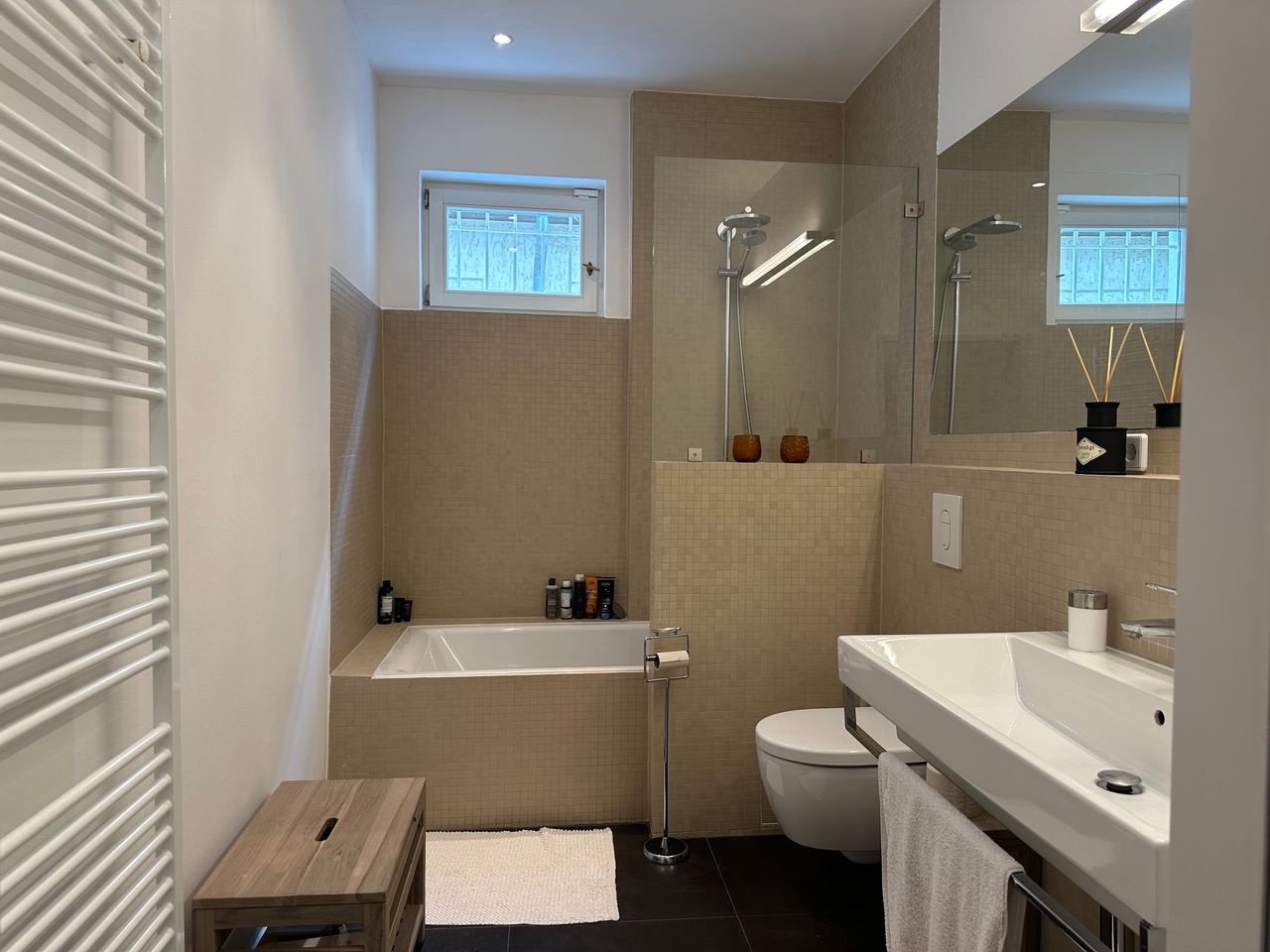 • Badezimmer: Das luxuriöse Badezimmer ist vollständig aus Marmor gefertigt und bietet eine elegante Kulisse.