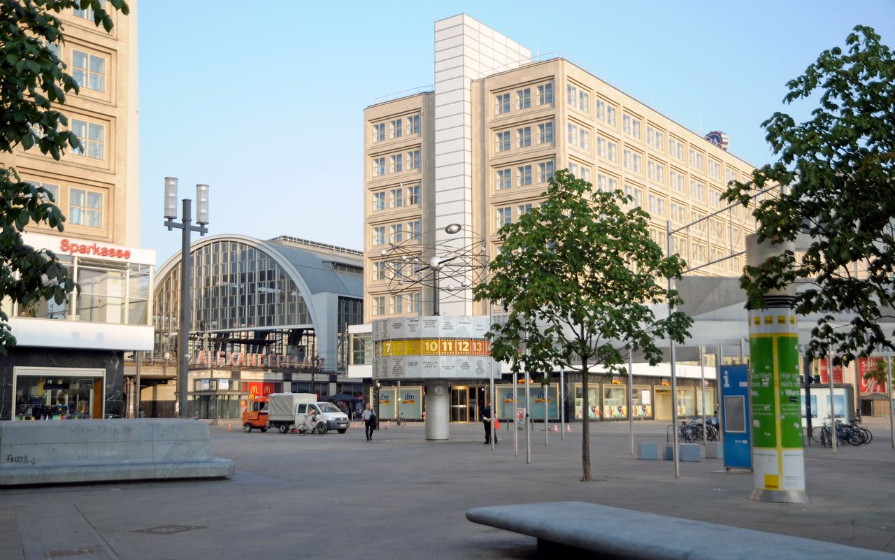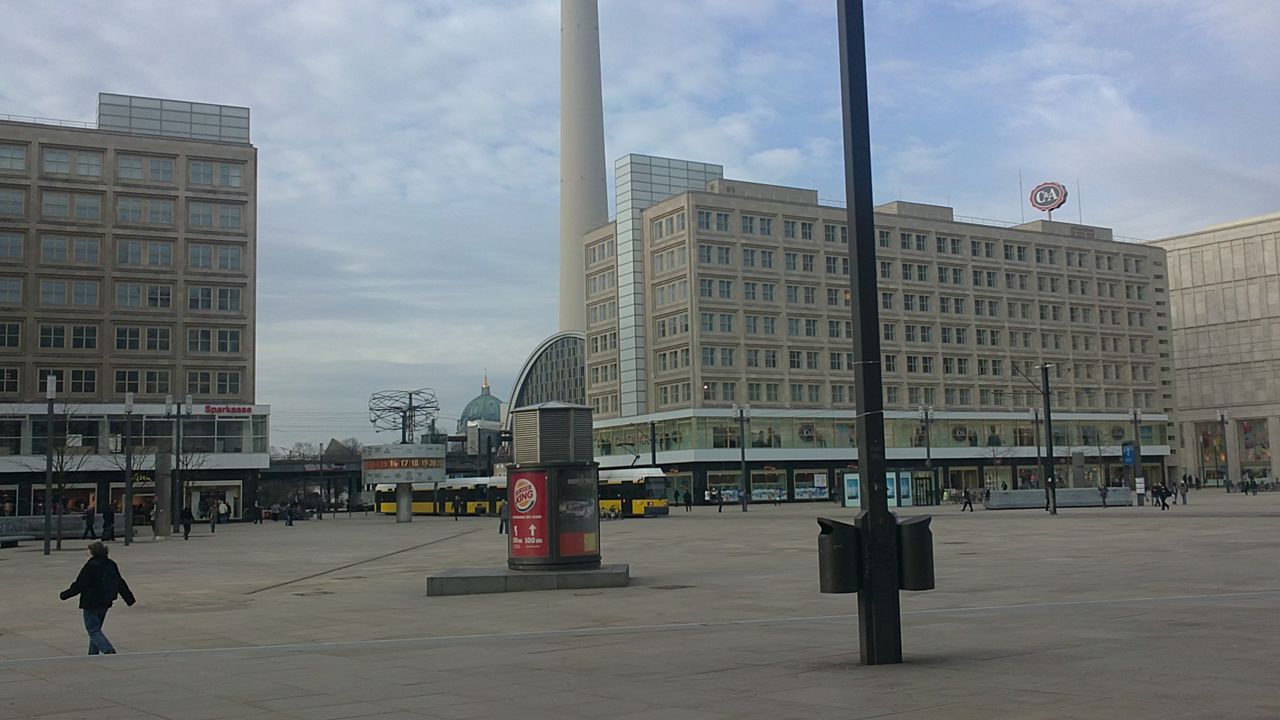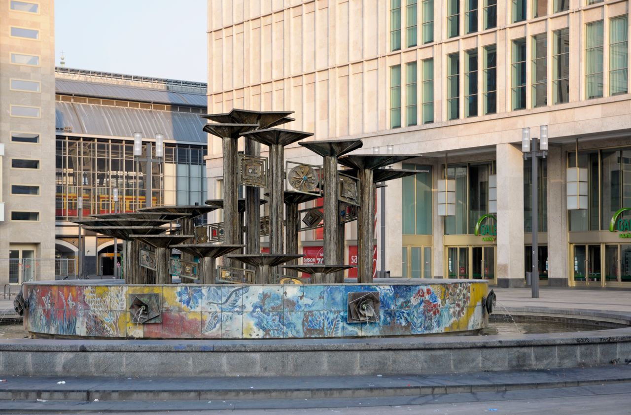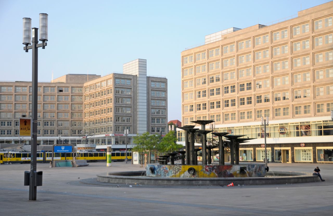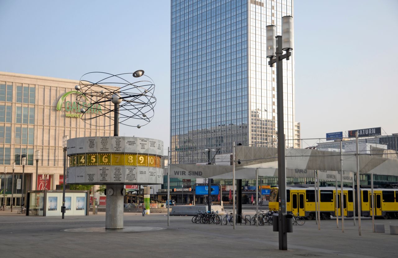 Moderne sozialistische Bauten, kein Grün, Kaufhäuser, bunte Reklameschilder, Imbissbuden, diverse Cafés, Weltzeituhr, Straßenbahn