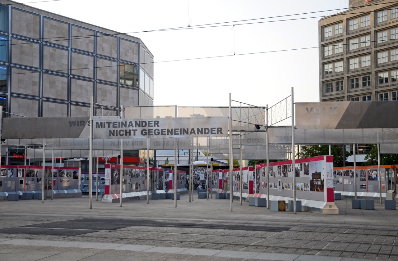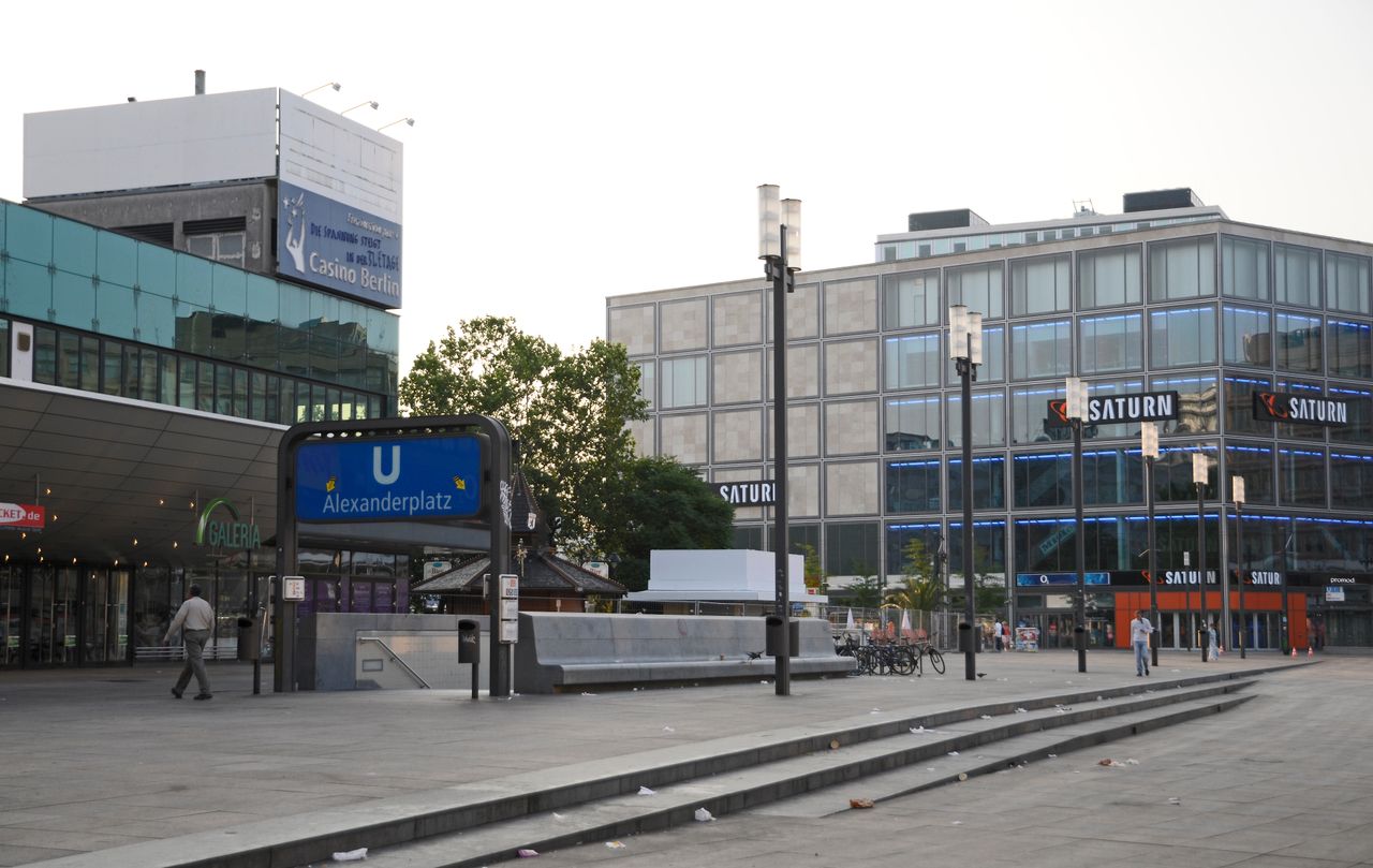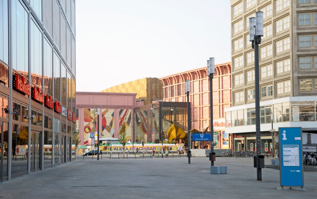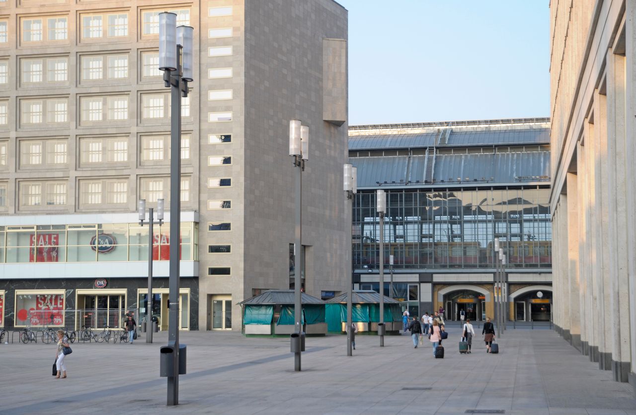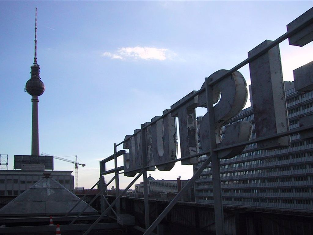 Moderne sozialistische Bauten, kein Grün, Kaufhäuser, bunte Reklameschilder, Imbissbuden, diverse Cafés, Weltzeituhr, Straßenbahn