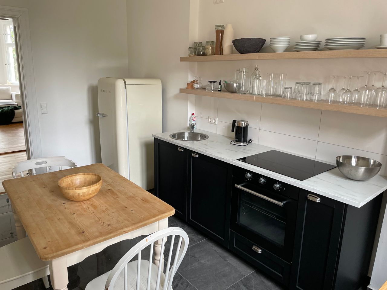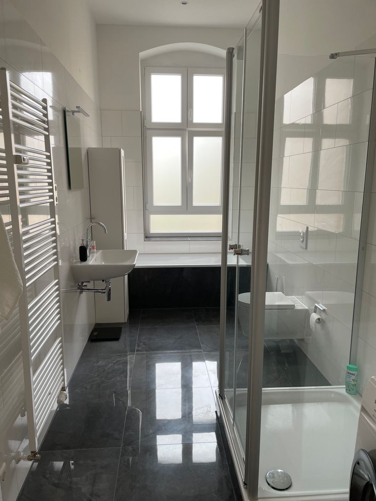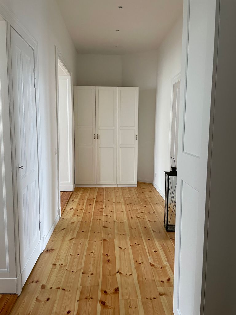 Genieße den Charme einer frisch renovierten Altbauwohnung mit hellen Räumen, hohen Decken und wunderschönem Stuck. Die Wohnung ist 85m2 groß. Neben einem hellen Wohnzimmer gibt es ein großes Schlafzimmer. Wohn- und Schlafzimmer sind mit großen Flügeltüren verbunden. Die Wohnung ist ein Erstbezug nach Luxusrenovierung. Die Einrichtung ist hochwertig und neu.