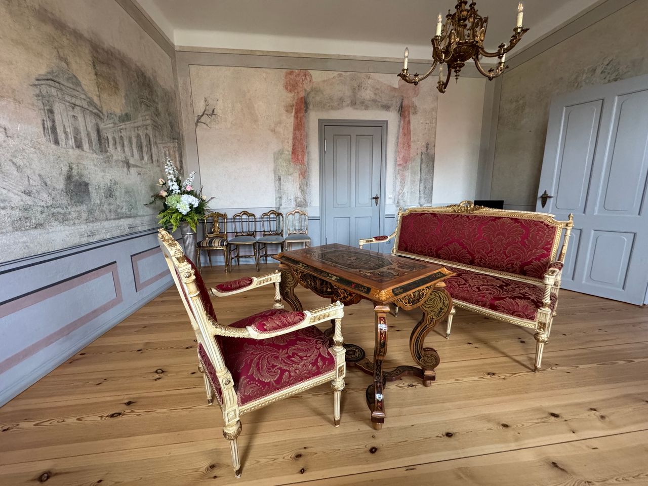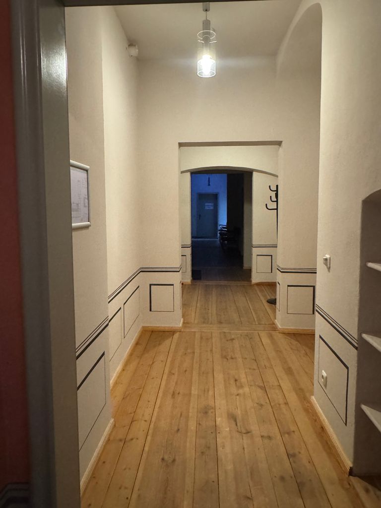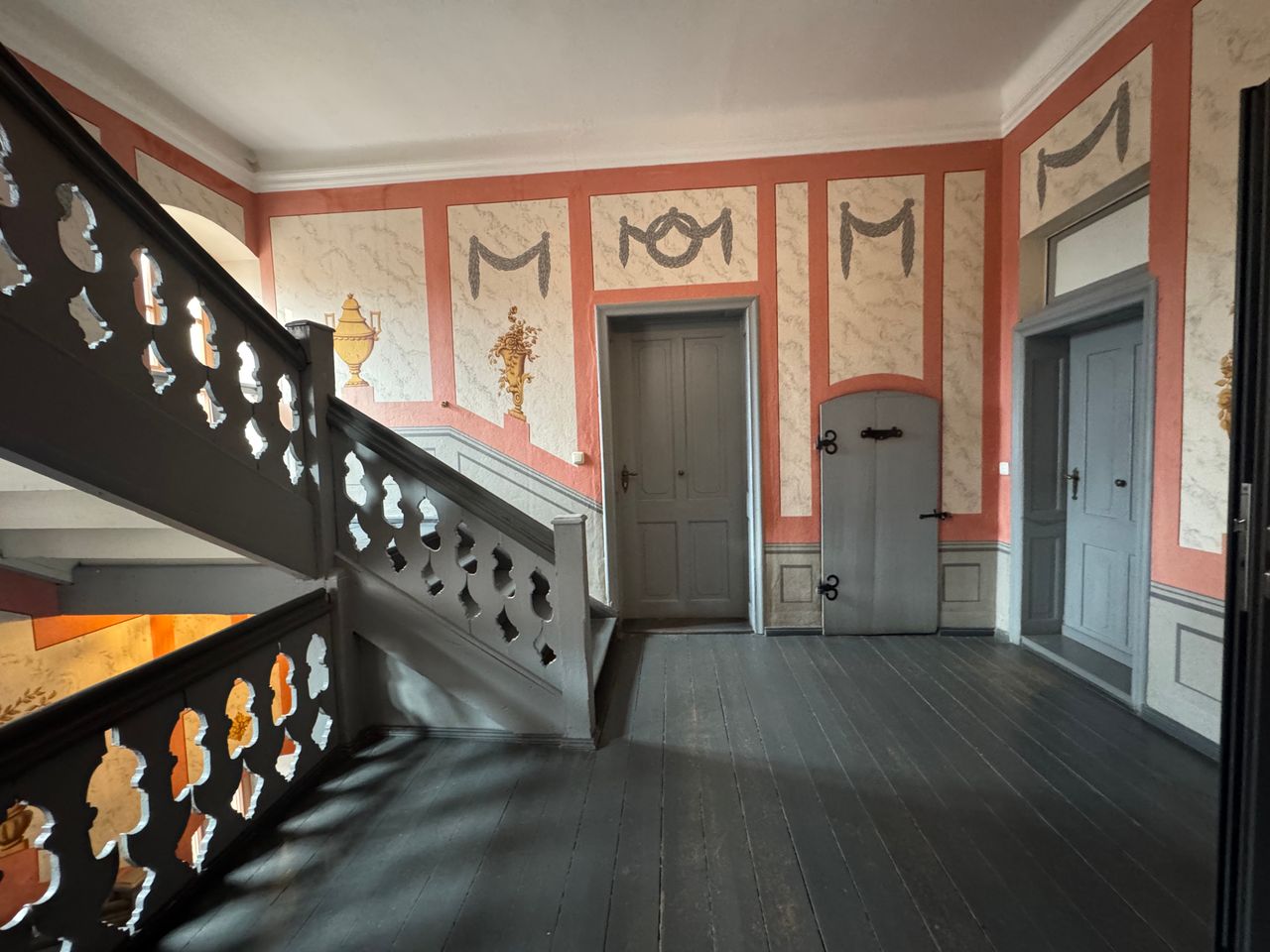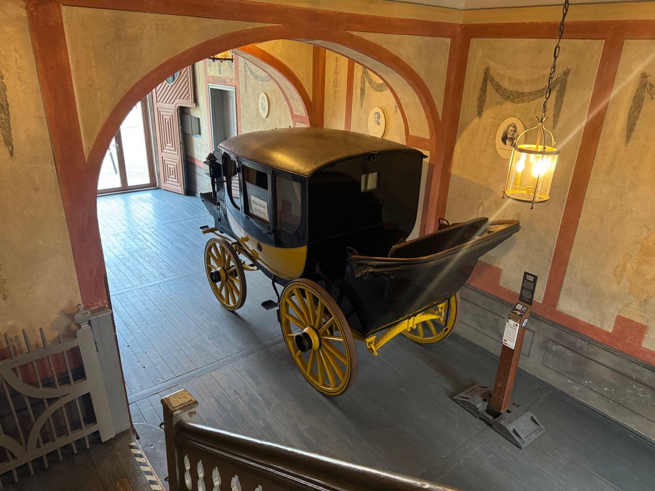 Im Innern des Gebäudes sind Wandmalereien mit klassizistischen Motiven in mehreren Farbschichten erhalten und sorgfältig restauriert. Links der Durchfahrt befand sich das "Expeditionszimmer", rechts die "Passagierstube", wie die Schriftzüge über den Türen ausweisen.