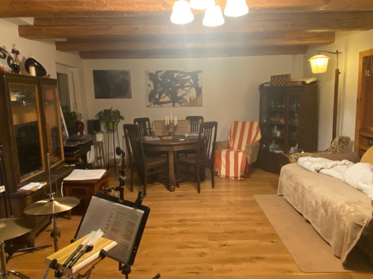 - großes ca. 36qm Wohnzimmer, alte Möbel,Fußboden im Erdgeschoss: Eichenparkettdielung,