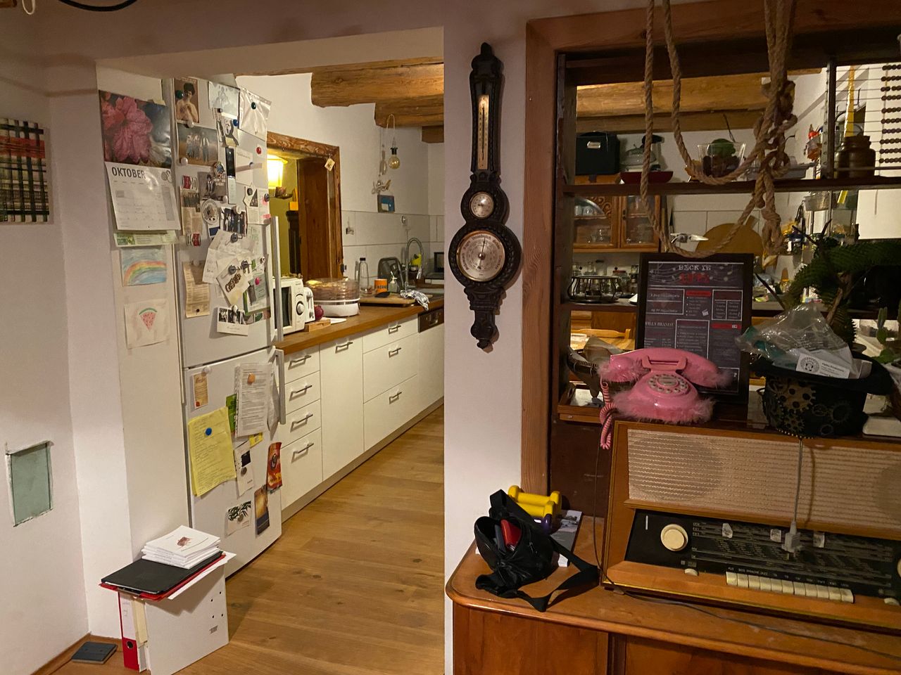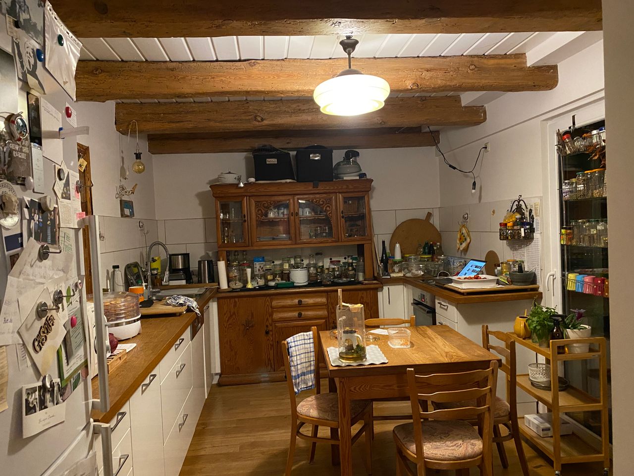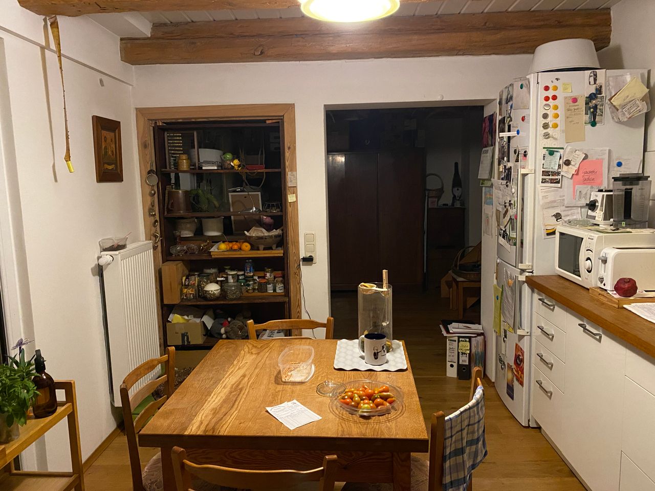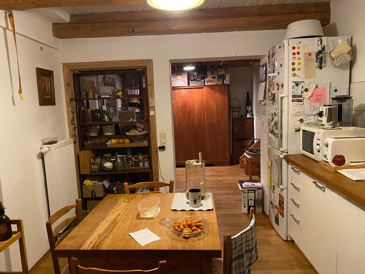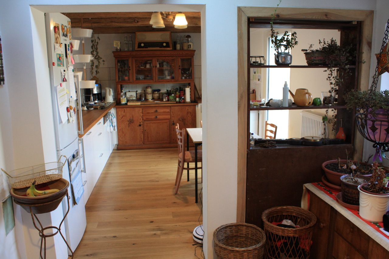 - Küche: Fronten weiß, Arbeitsfläche Eiche, altes Küchenbuffet aus Holz in Küche integriert, keine Hängeschränke, keine Abzugshaube, Balkontür zum Hof, Küche zur Diele offen, große Durchreiche/ ehem. Tür) zum Wohnzimmer,