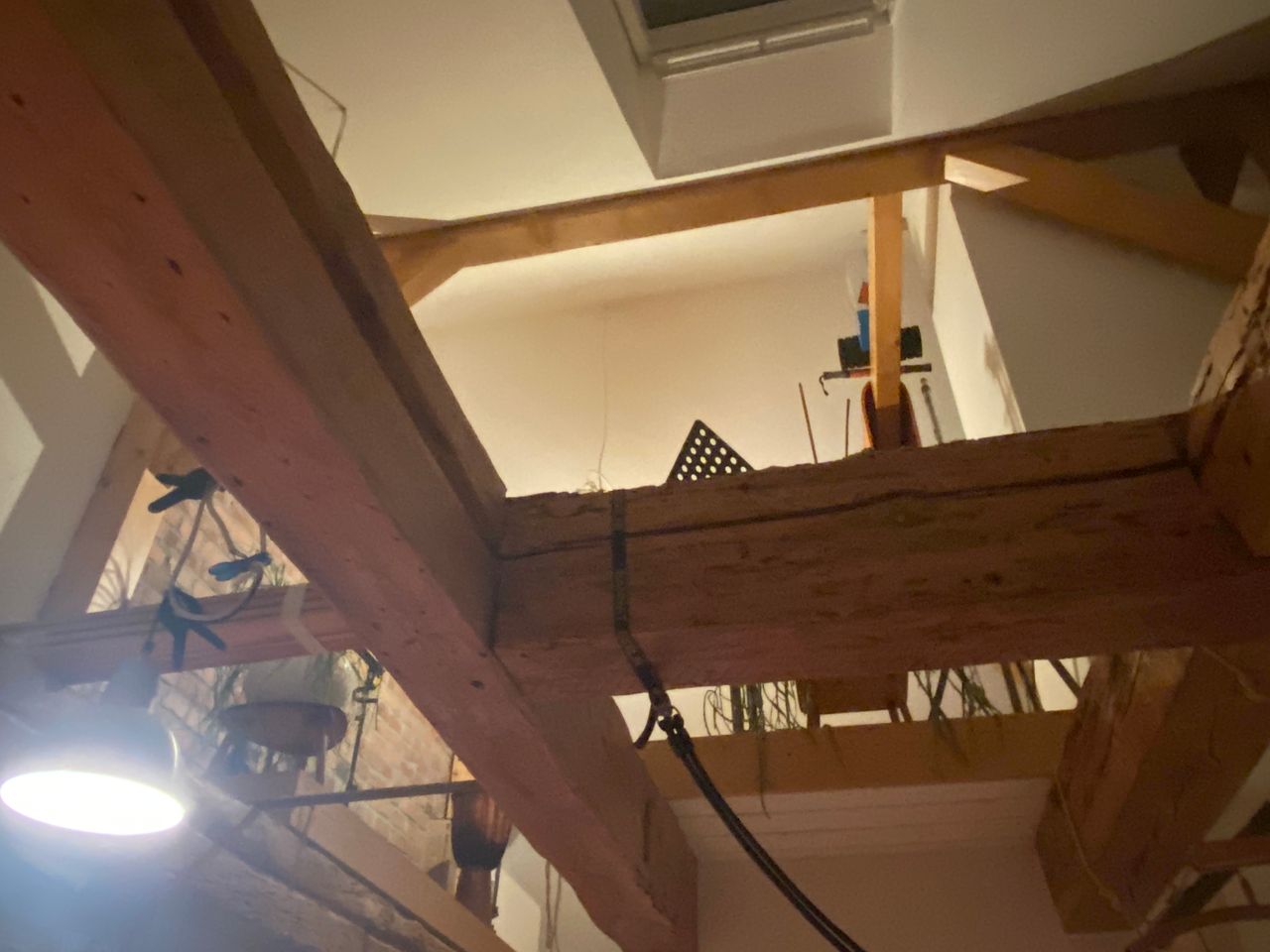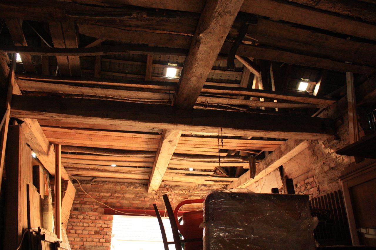 Haus um 1900, Haus innen, z.T. offene Bauweise, Gebälk sichtbar, Wände weiß,