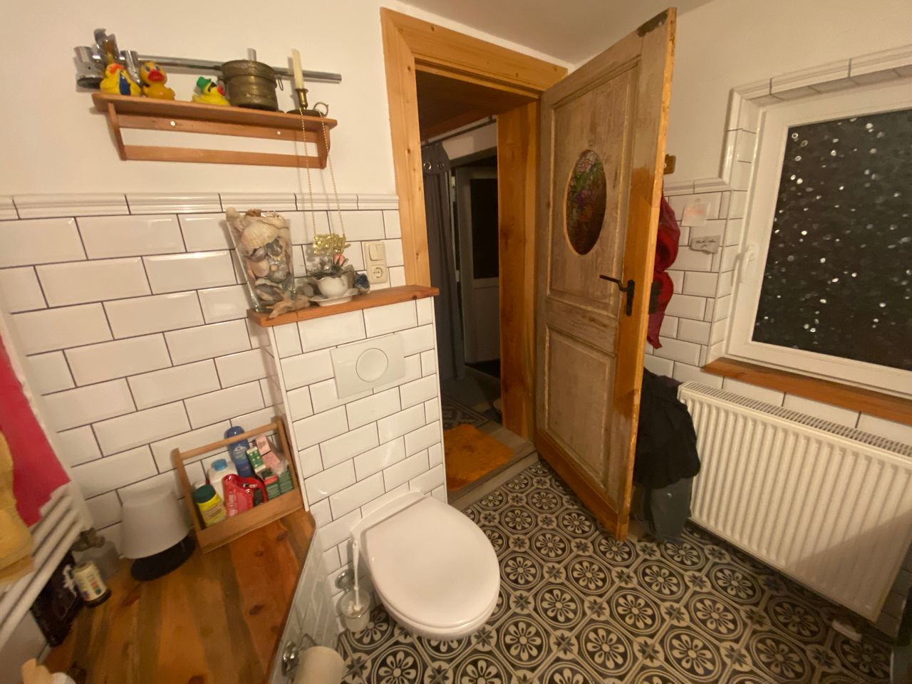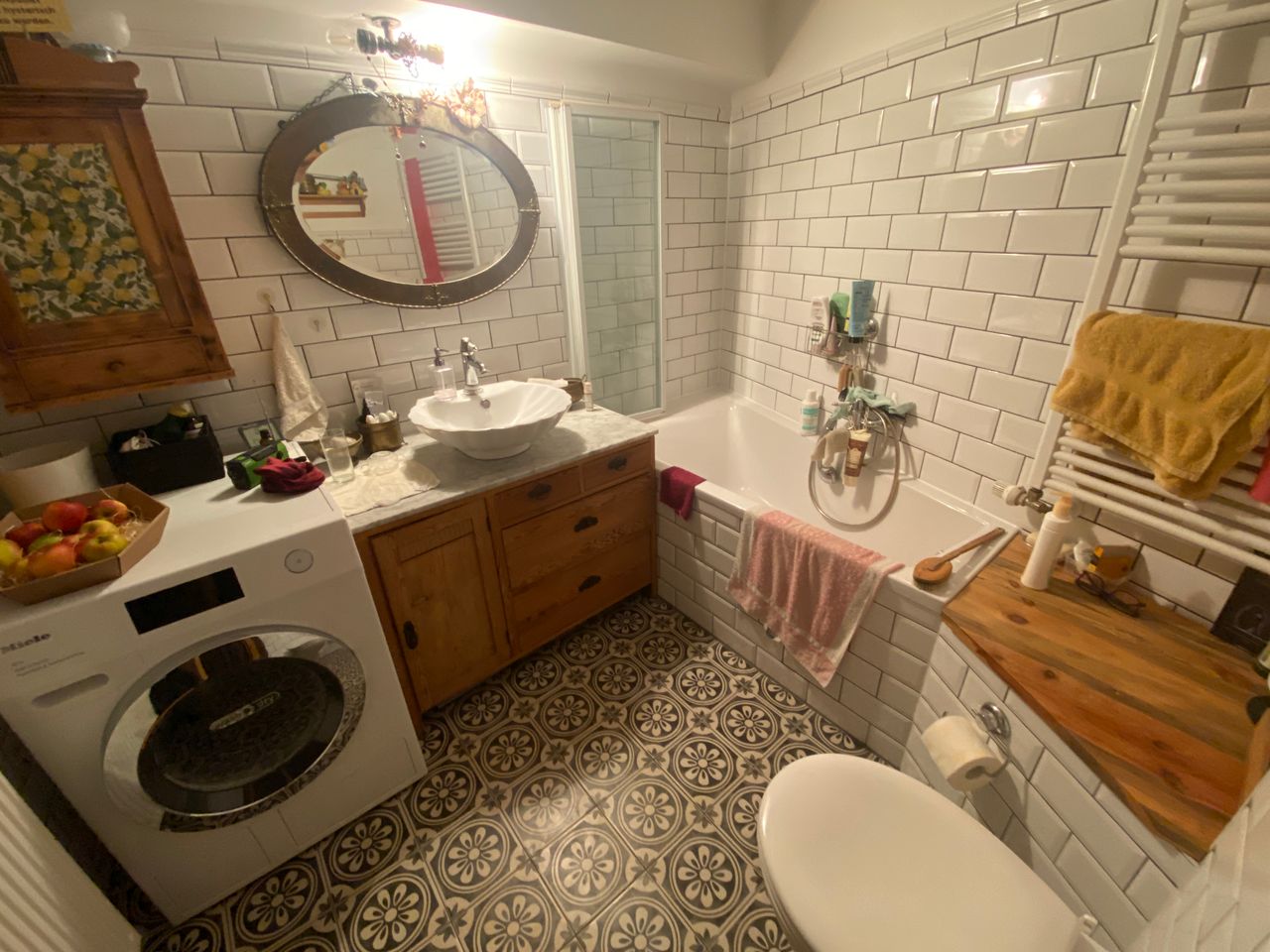 - kleines Bad, Wände mit weißen Metrofliesen, Fußboden Ornament-Fliesen