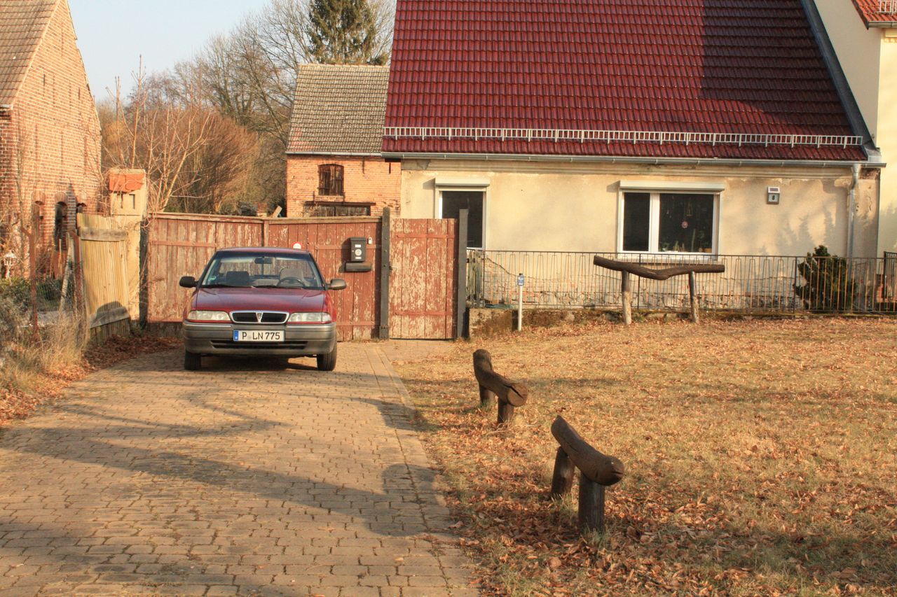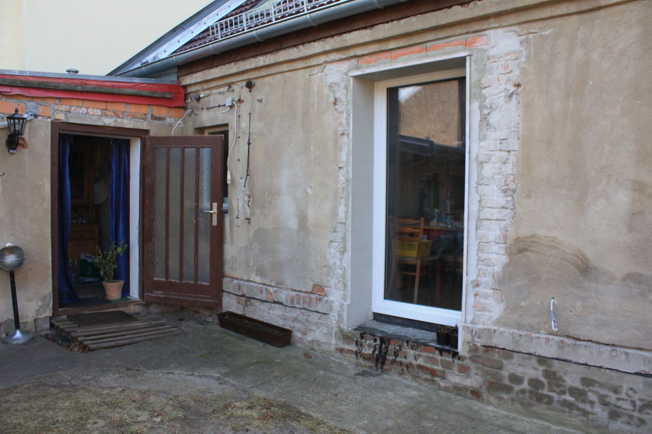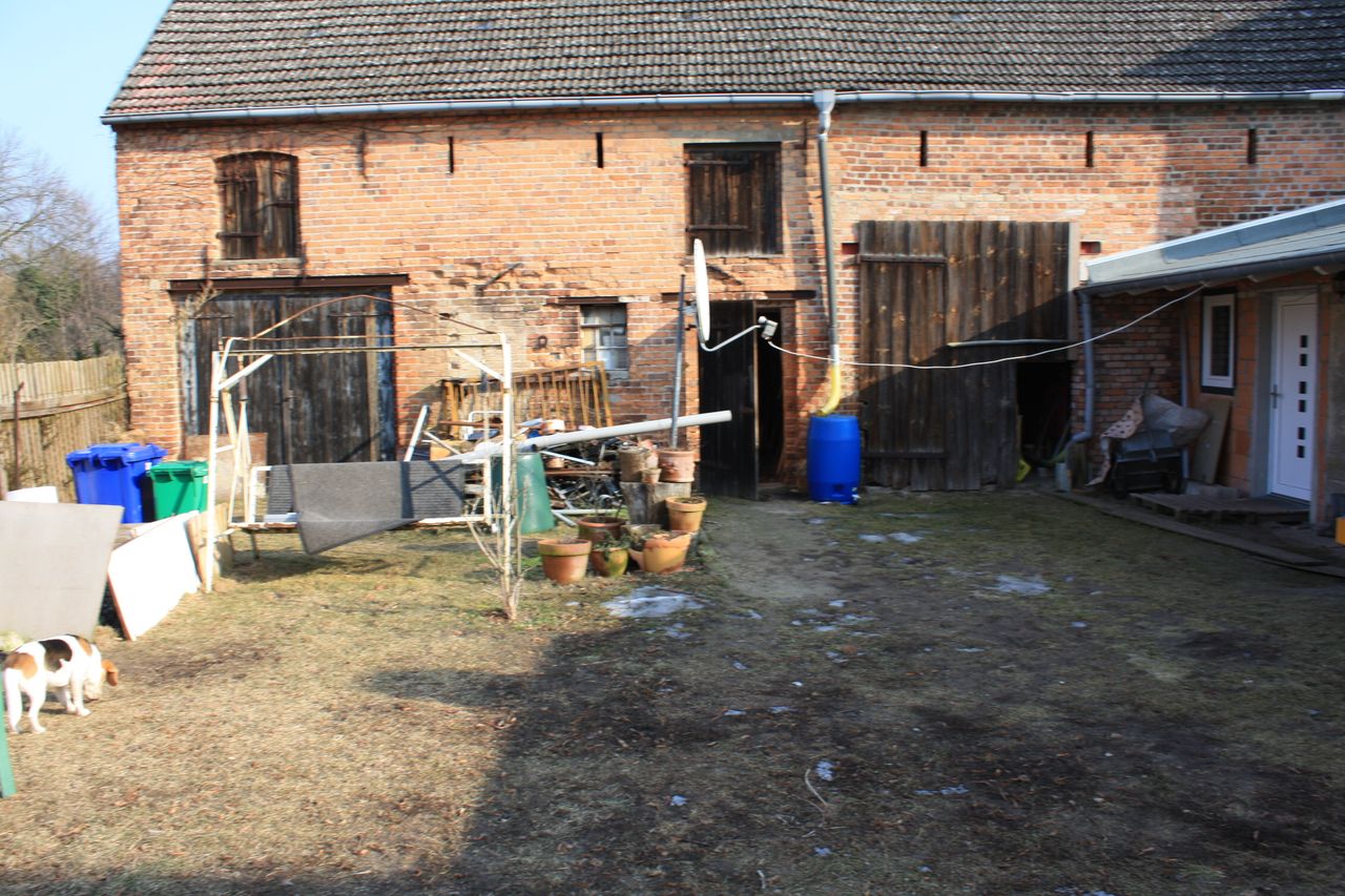 - große 130qm Scheune roter Ziegelbau, aufgeteilt in Garage (jetzt Werkstatt), Stall (jetzt umgenutzt in Sommerwohnzimmer mit Sitzebene, alten Möbeln und improvisierter Bar, Durchgang zum großen Garten und zum Fluß), Scheune (mit alter Dreschmaschine, Kartoffelkeller, alterm kl. Stall mit Tonnengewölbe (jetzt Abstellraum) und Durchgang zum großen Garten)