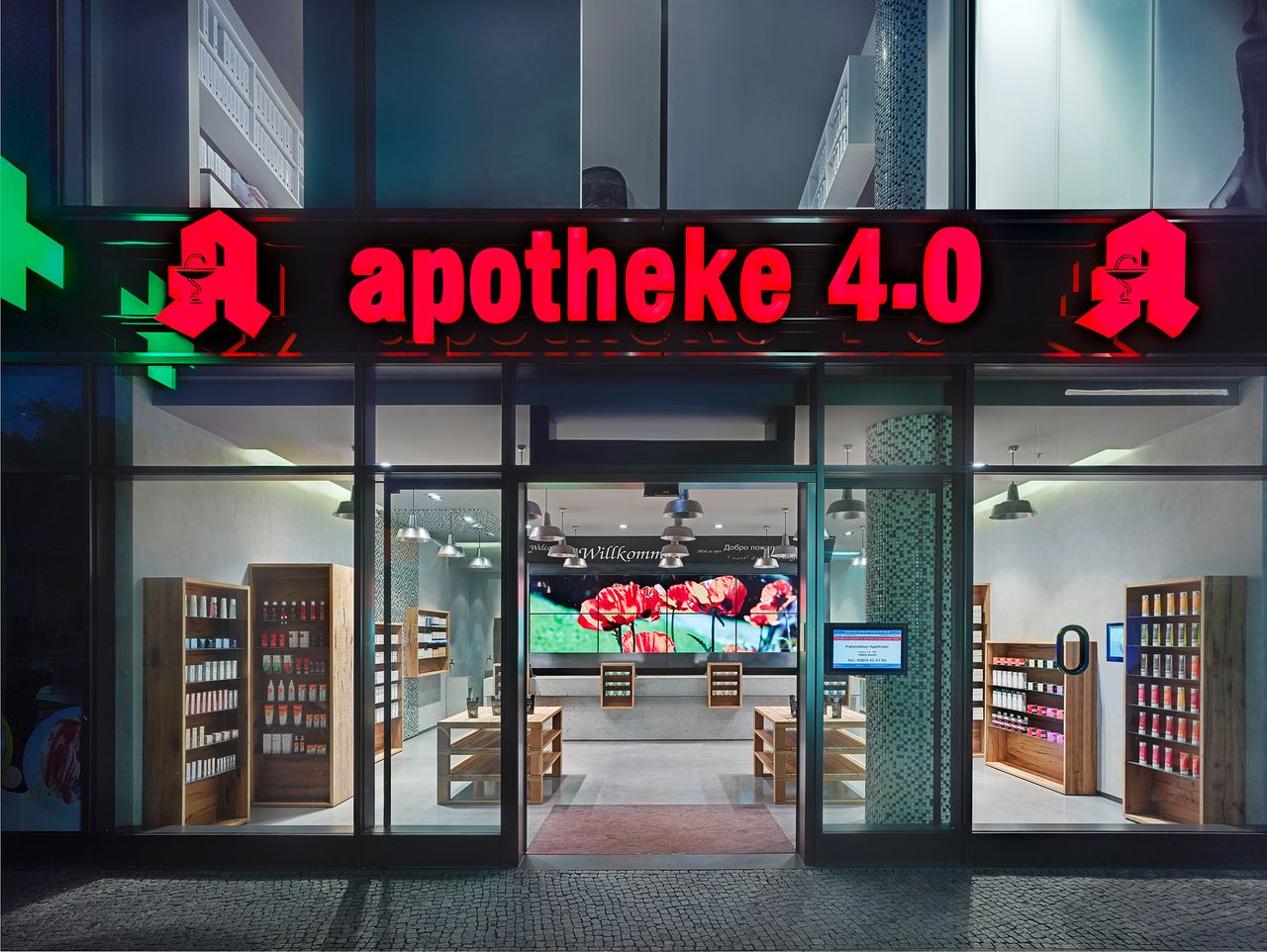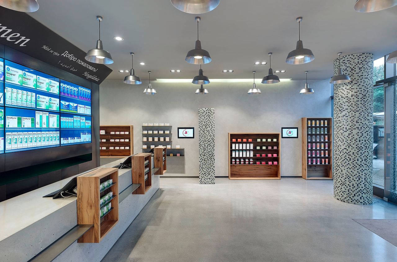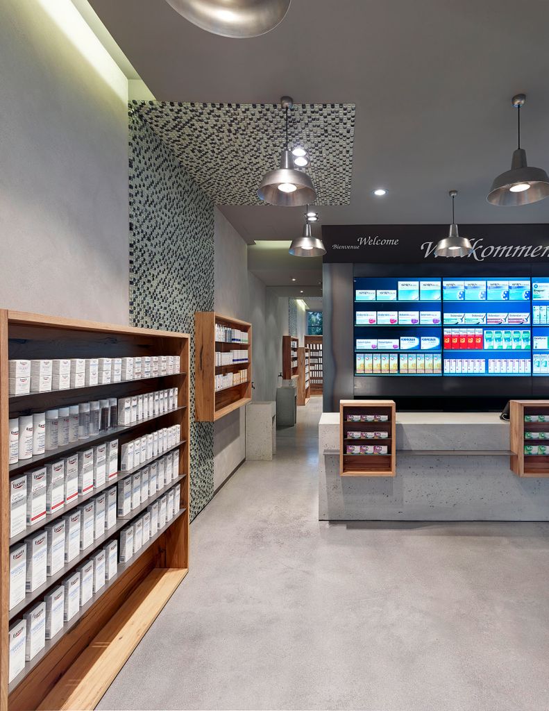 Einige Regale aus Holz finden sich auch an den seitlichen Beton-Wänden der Apotheke. An manchen Regalfächern sind Touch-Panels angebracht.