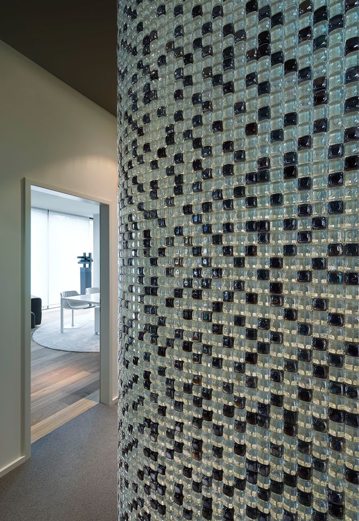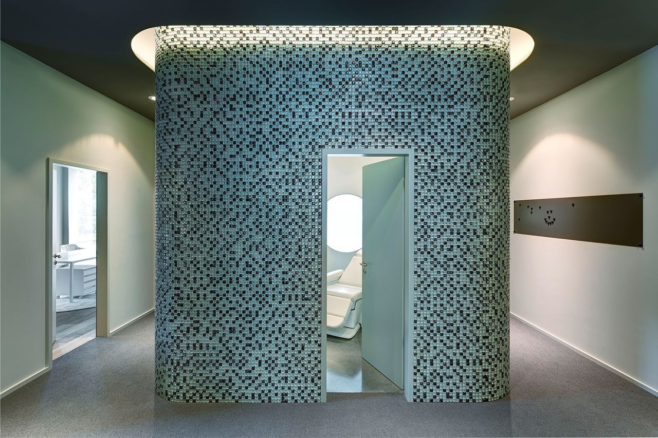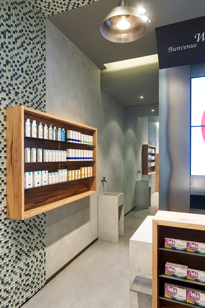 Für eine grafische Auflockerung der grauen Betonwände sorgt ein Mosaik aus schwarzen und transparenten rechteckigen Glassteinen, das sich an einem Teil der linken Wand vom Boden zur Decke und dort ein kleines Stück weiter in die Decke hineinzieht. Puristisches und witziges Detail: Ein antiker Wasserhahn kommt aus der linken Wand über einem Becken aus Beton. Ausgeleuchtet wird die Offizin durch von der Decke herabhängende Lampen mit Metallschirm im Industrie-Look.