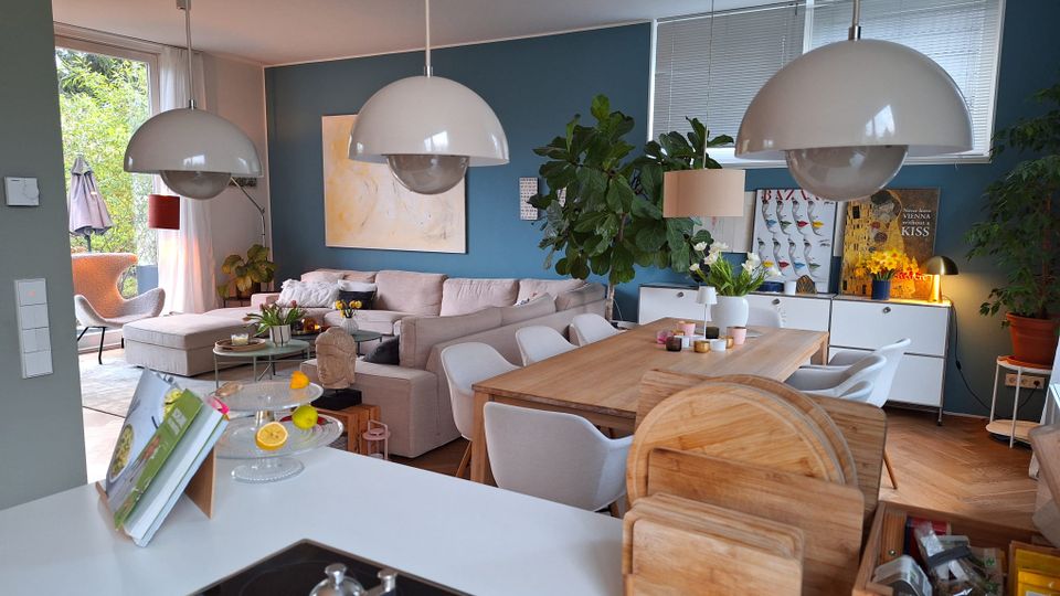 Die lichte Raumhöhe von ca.3,05m im Erdgeschoß und die Terrassenschiebetüren zum Garten in voller Raumhöhe ermöglichen gezielte Lichtführungen.