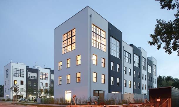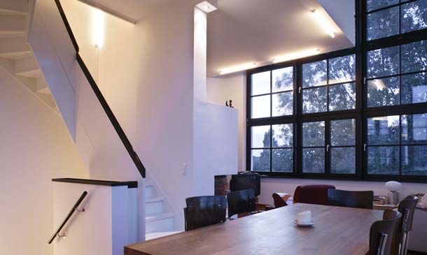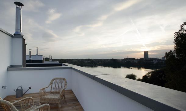 Modernes weißes Reihenendhaus 3 Etage mit 3 Meter Deckenhöhe plus 6 Meter hohem Atelier-Geschoss. Loft-Charakter. Bodenbelag: EG Schiefer, 1-3. OG Industrieparkett. Dachterrasse mit Seeblick auf Rummelburger Bucht
