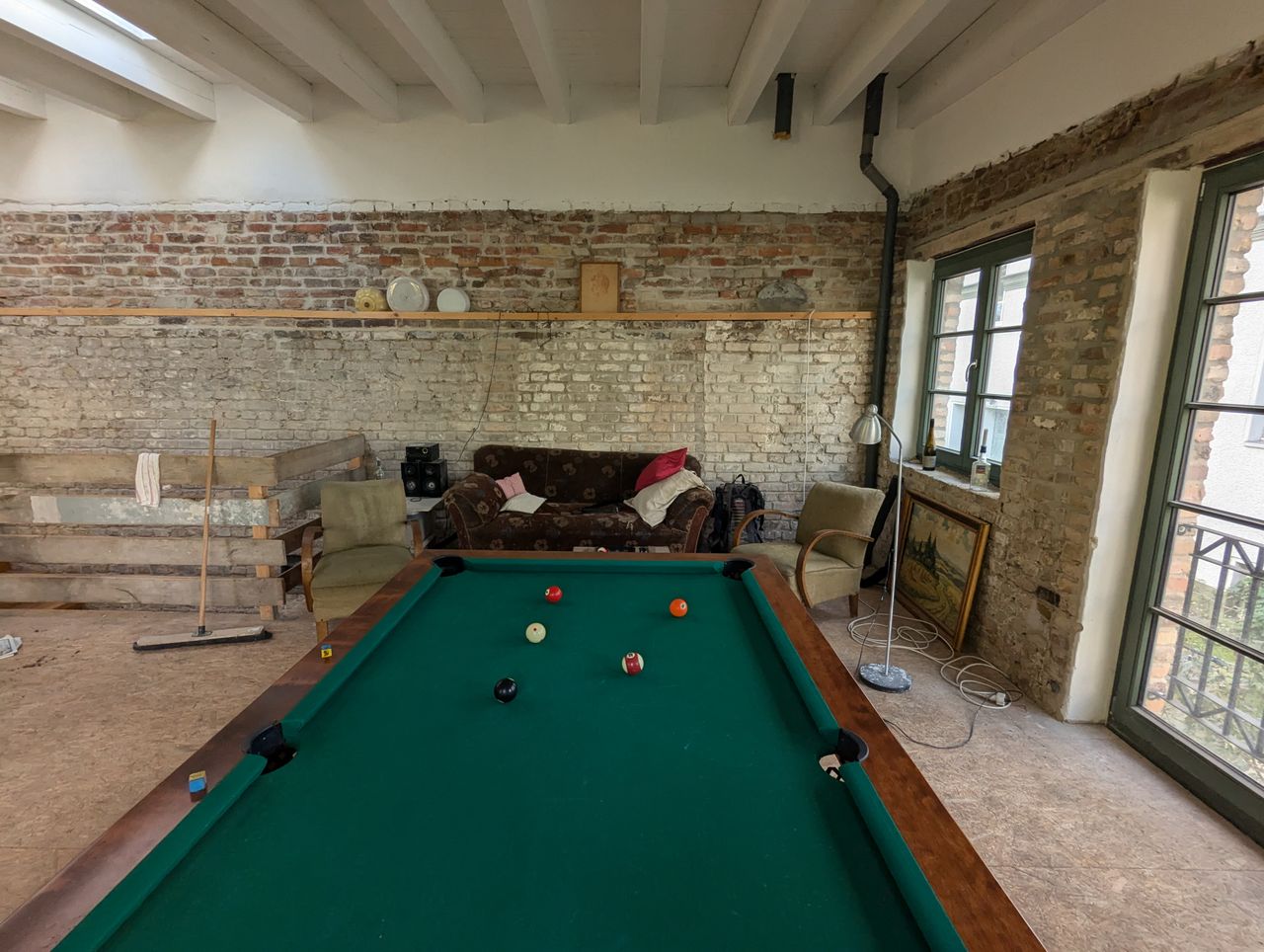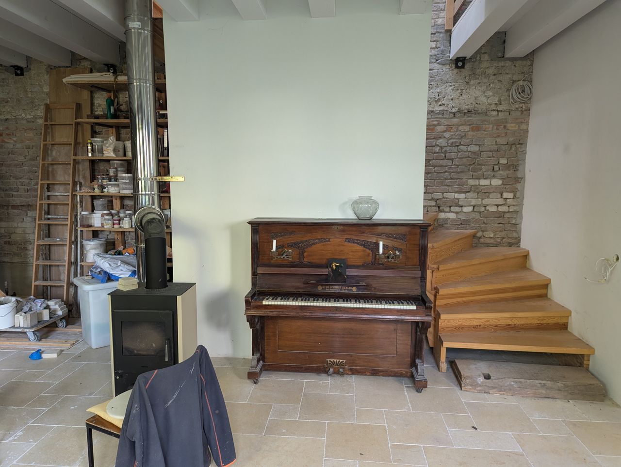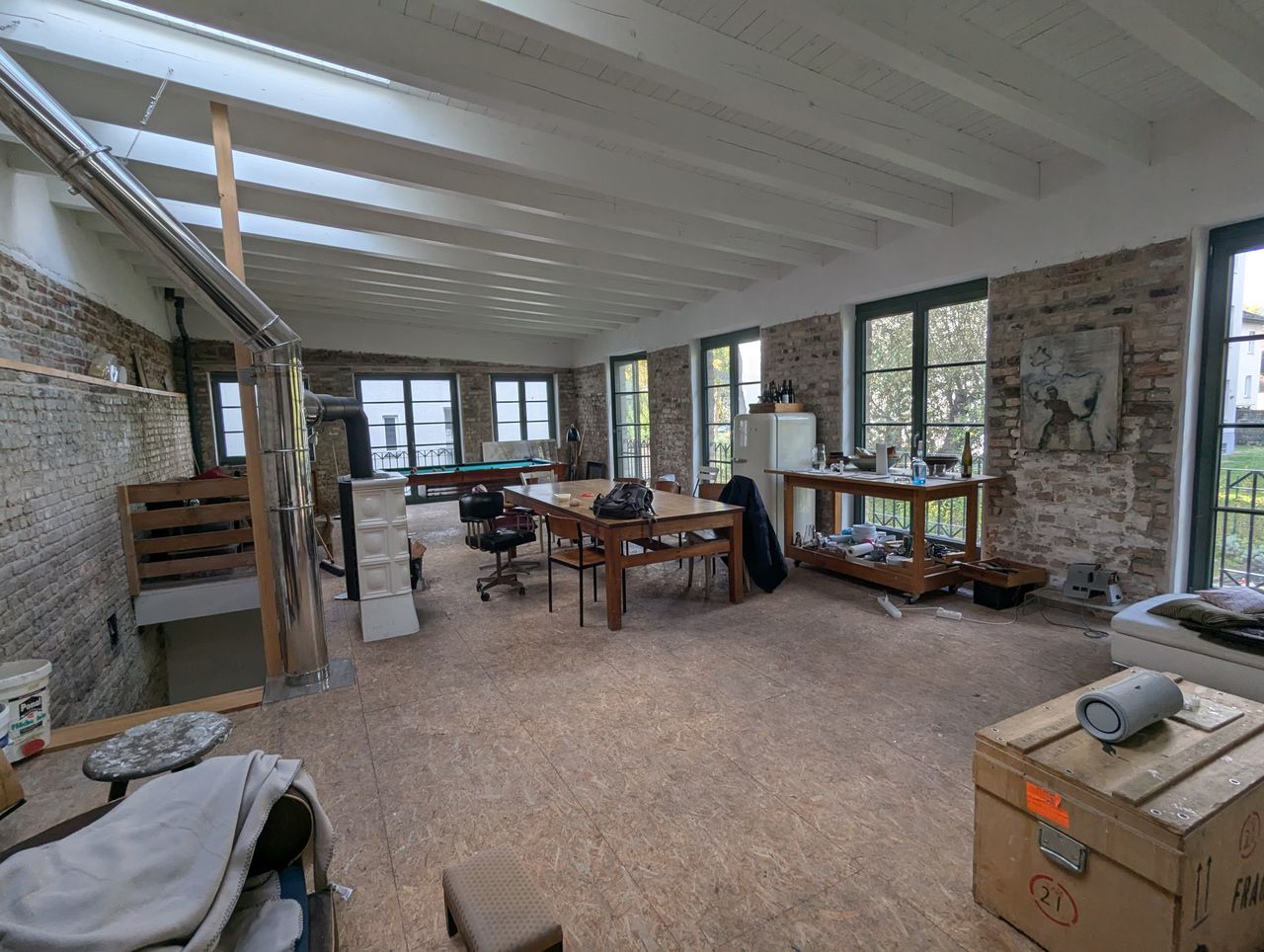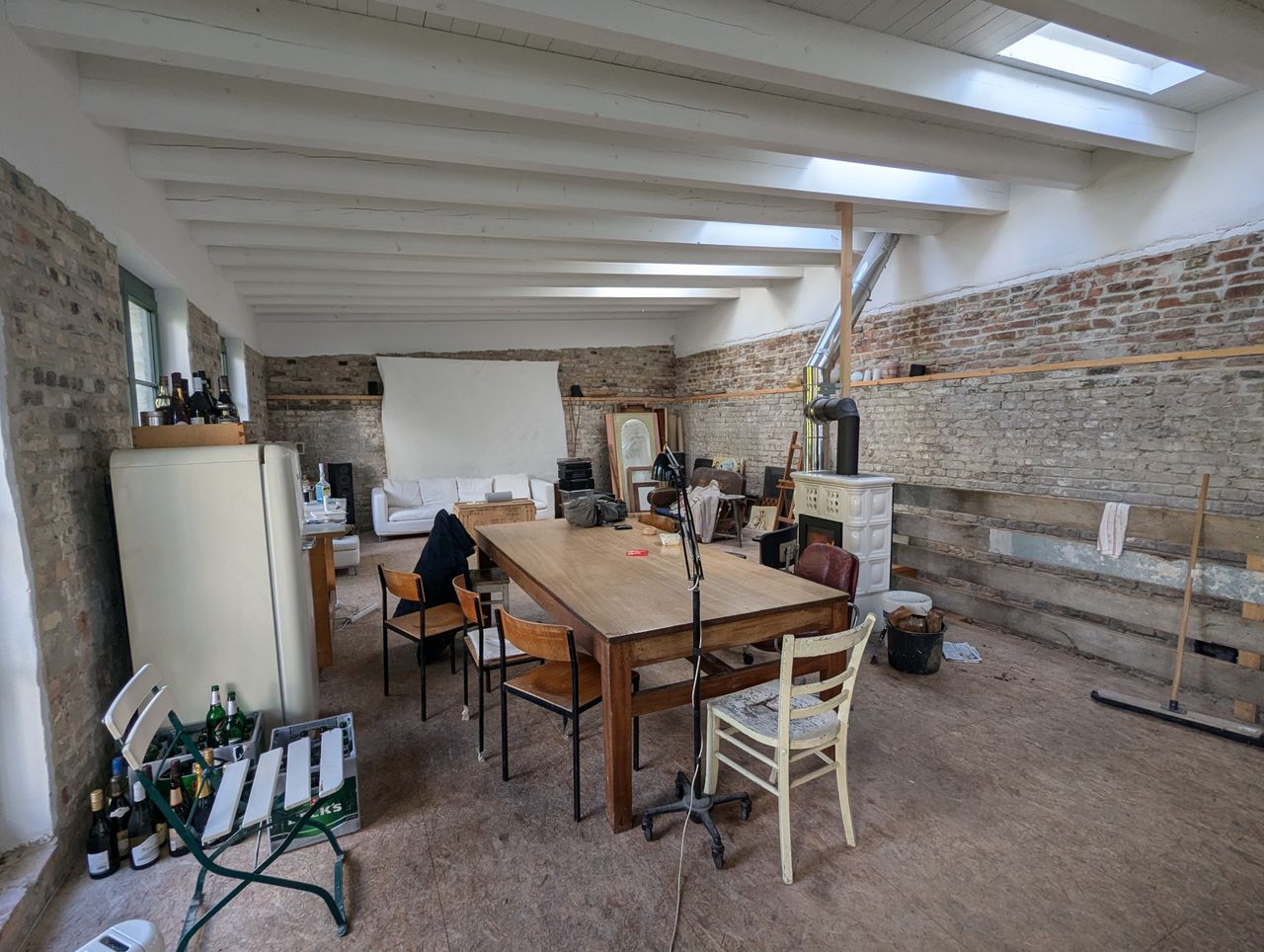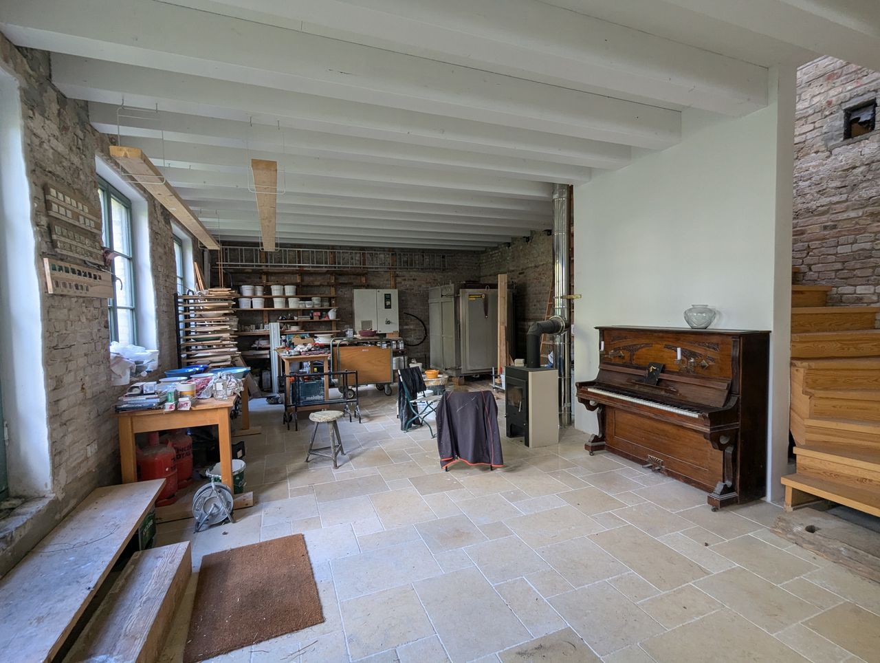 Die Remise liegt in einem sehr schön angelegten Garten, mit vielen Blumen und Obstbäumen. Im Erdgeschoss befindet sich eine Töpferwerkstatt und das Bad, im ersten Stock ist ein großer Raum, der als Atelier, Schreibtisch und für Poker, Billard und Party Abende genutzt wird. Es ist ein altes Lagerhaus für Eier und der Charm der Backsteine wurde erhalten.
