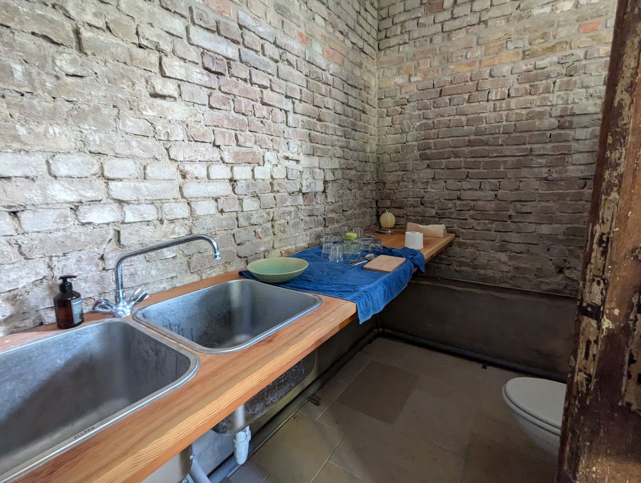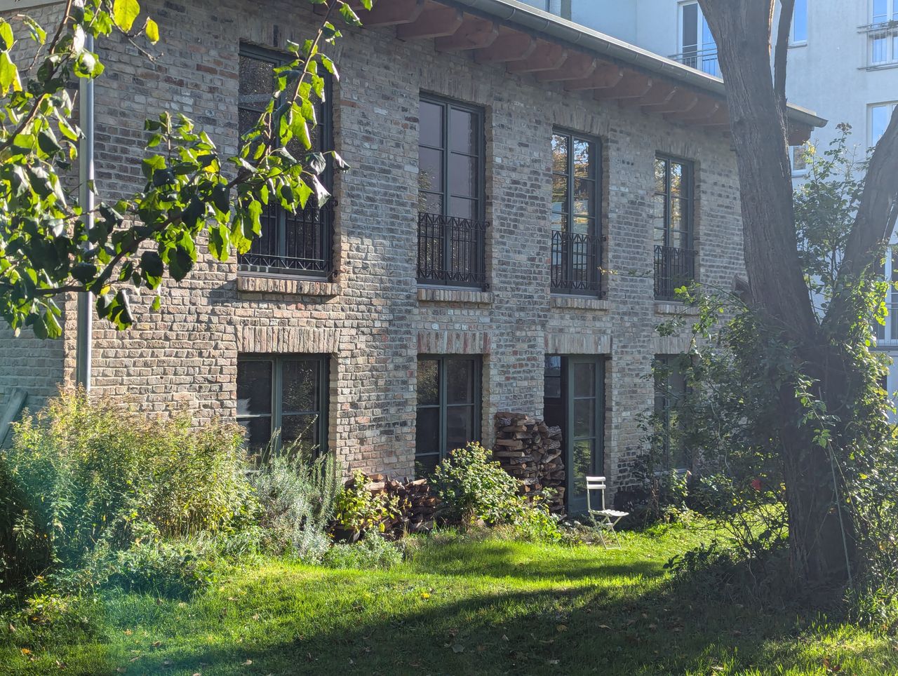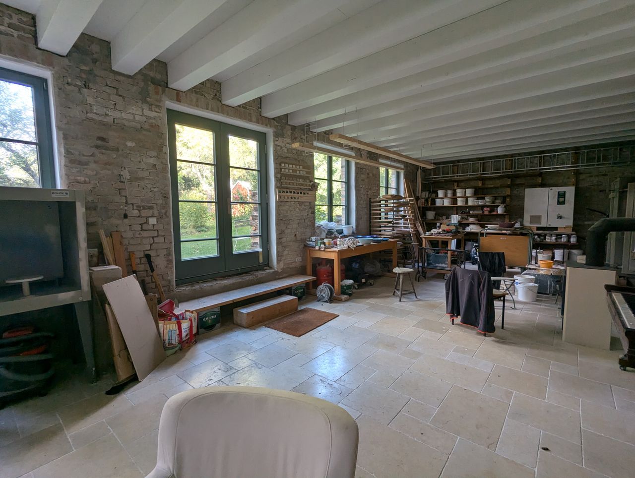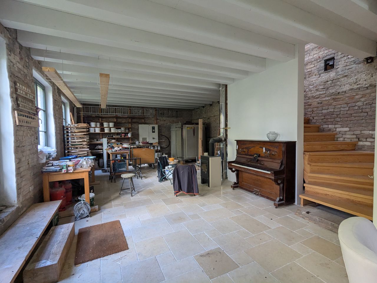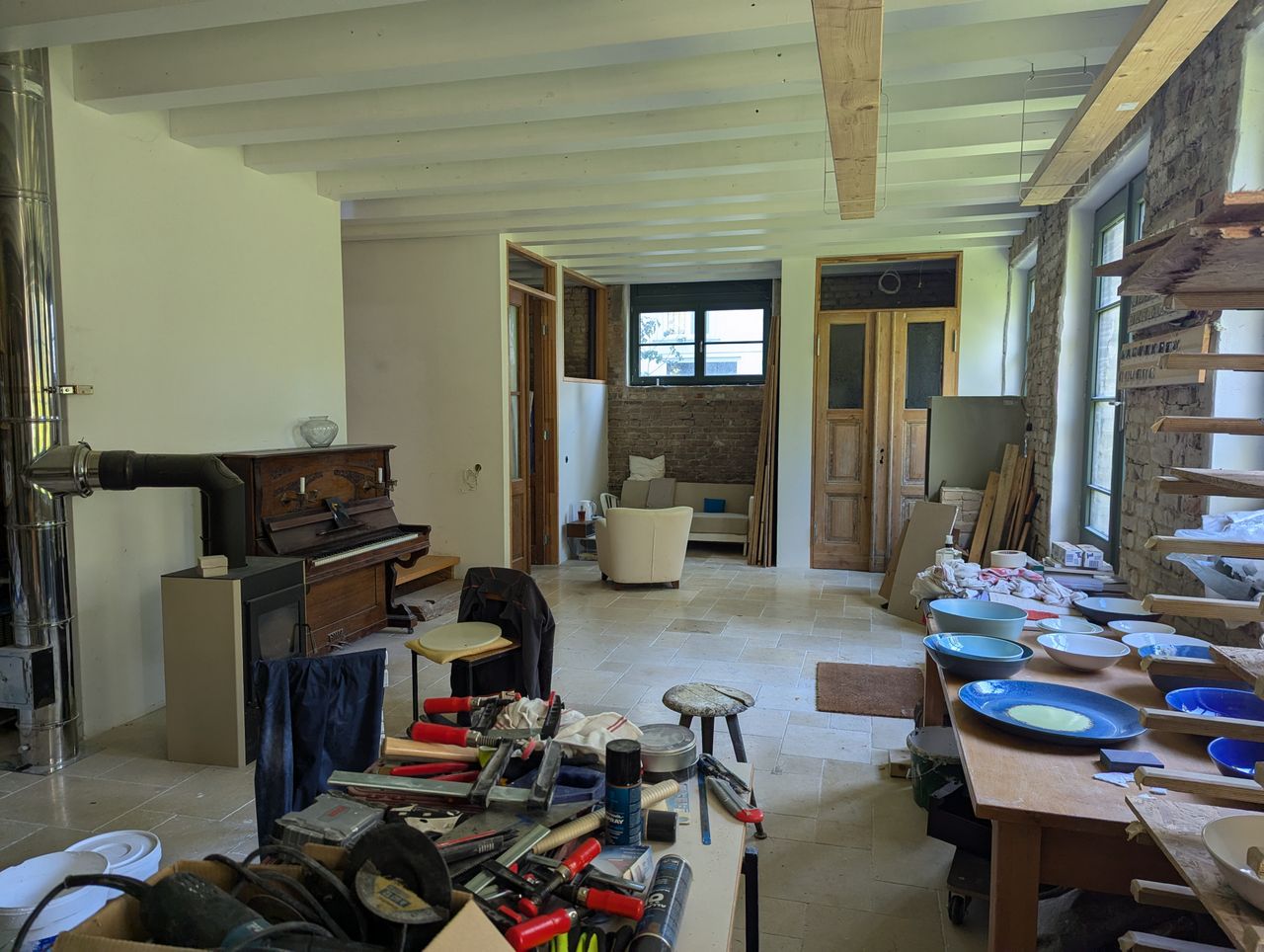 Die Remise liegt in einem sehr schön angelegten Garten, mit vielen Blumen und Obstbäumen. Im Erdgeschoss befindet sich eine Töpferwerkstatt und das Bad, im ersten Stock ist ein großer Raum, der als Atelier, Schreibtisch und für Poker, Billard und Party Abende genutzt wird. Es ist ein altes Lagerhaus für Eier und der Charm der Backsteine wurde erhalten.