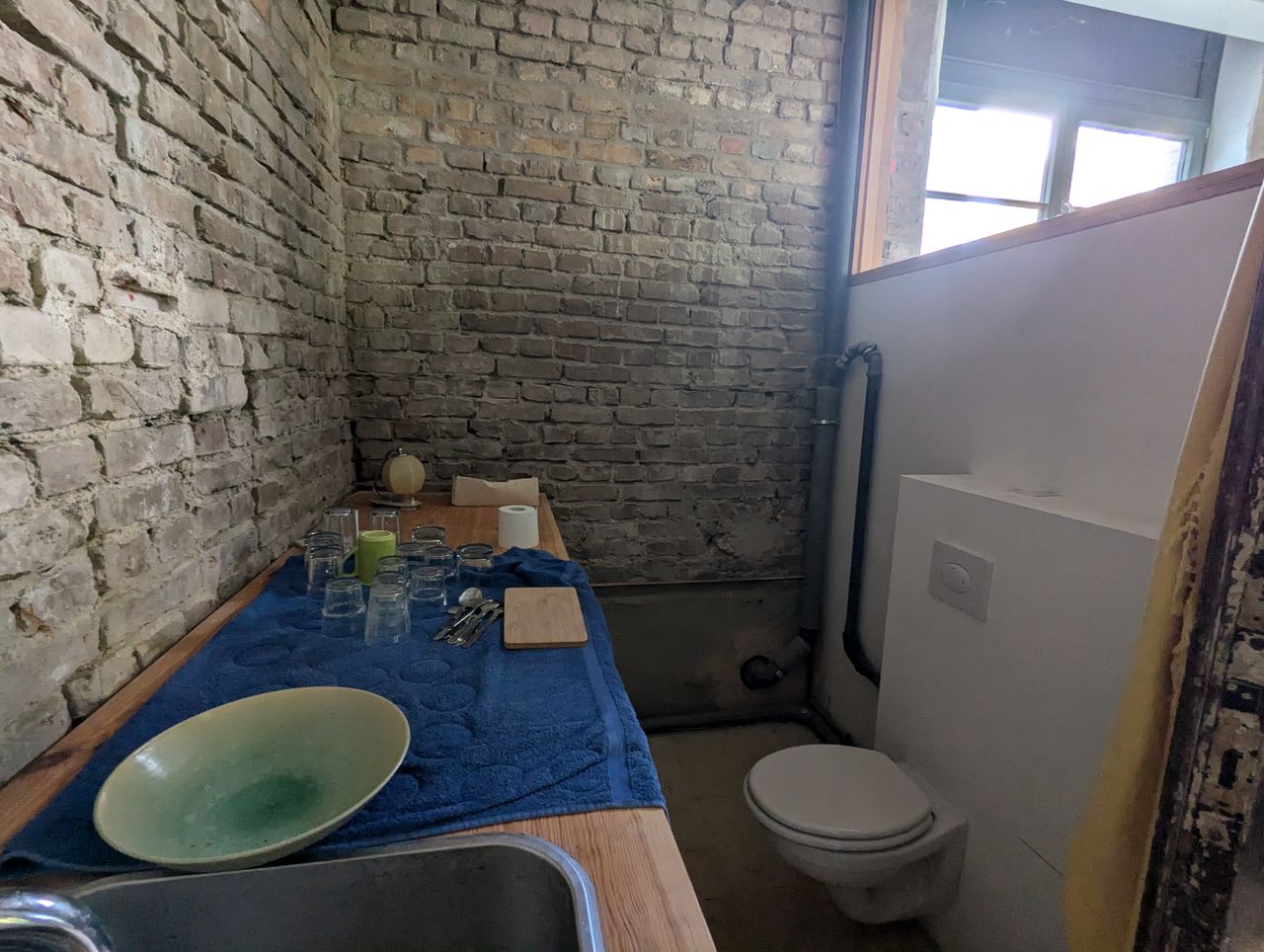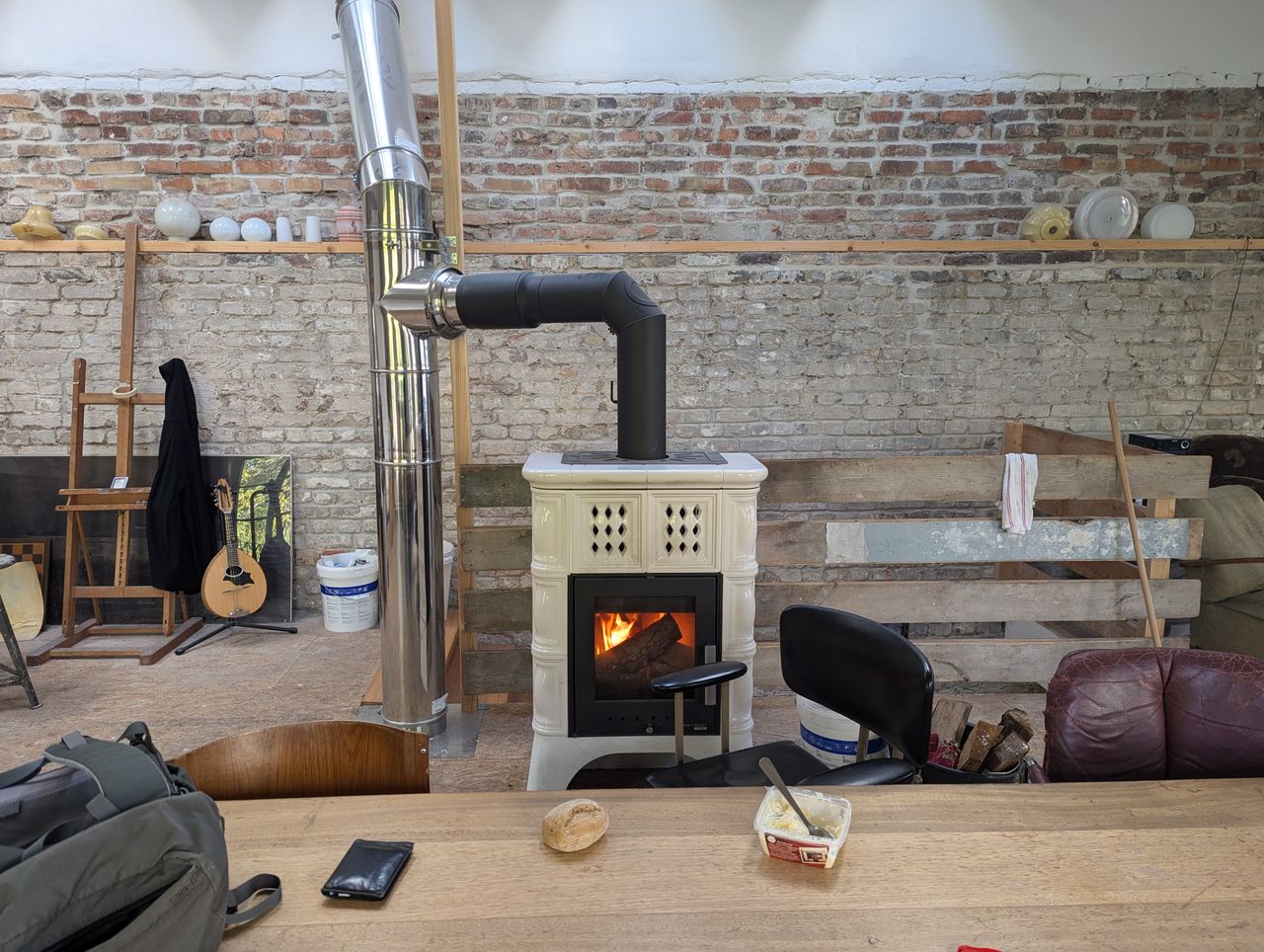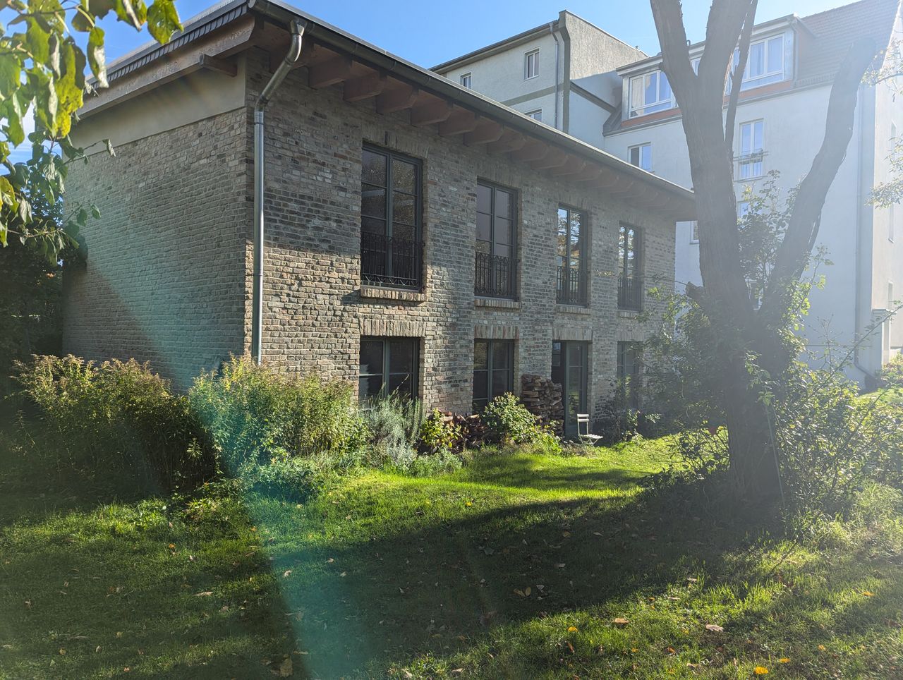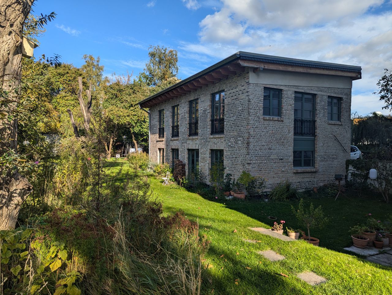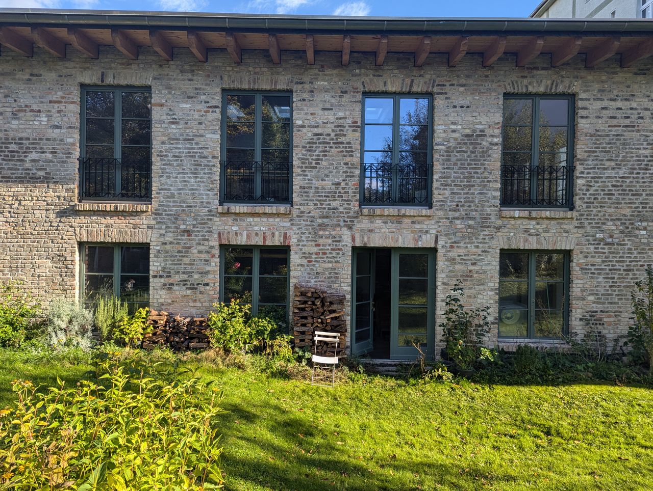 Die Remise liegt in einem sehr schön angelegten Garten, mit vielen Blumen und Obstbäumen. Im Erdgeschoss befindet sich eine Töpferwerkstatt und das Bad, im ersten Stock ist ein großer Raum, der als Atelier, Schreibtisch und für Poker, Billard und Party Abende genutzt wird. Es ist ein altes Lagerhaus für Eier und der Charm der Backsteine wurde erhalten.