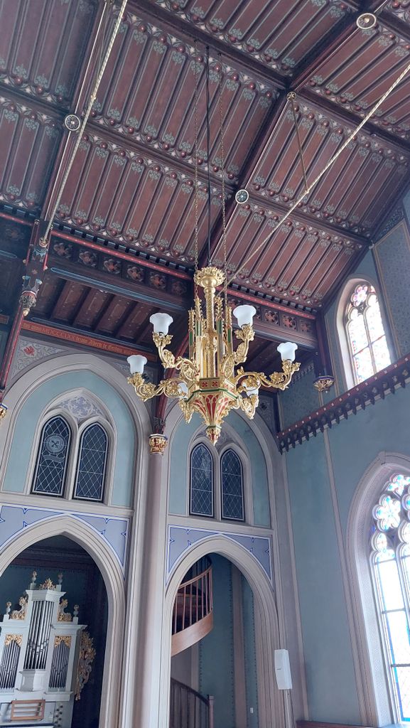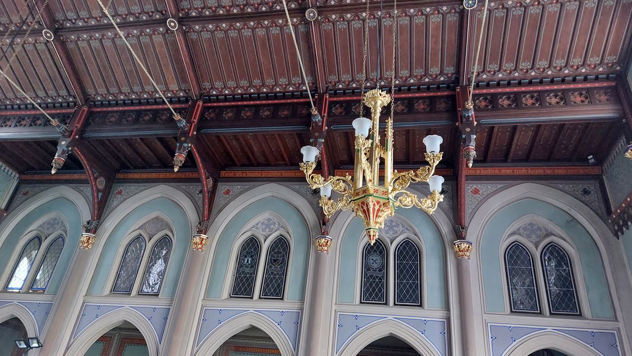 Neben der aufwändig dekorierten Holzdecke fallen besonders die beiden sechsarmigen Kronleuchter mit einer Höhe von 2,1 m und einem Durchmesser von 1,6 m ins Auge. Doch auch die großen Fenster aus Buntglas verleihen dem Saal eine einzigartige Atmosphäre. Hier lassen sich Veranstaltungen, Empfänge und Feierlichkeiten von 40 bis 120 Personen durchführen." (zietiert nach: domevents.de)