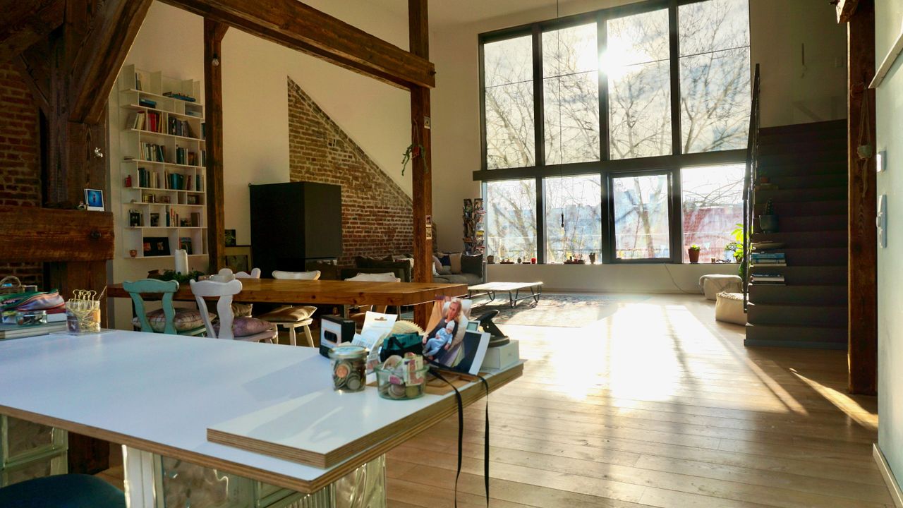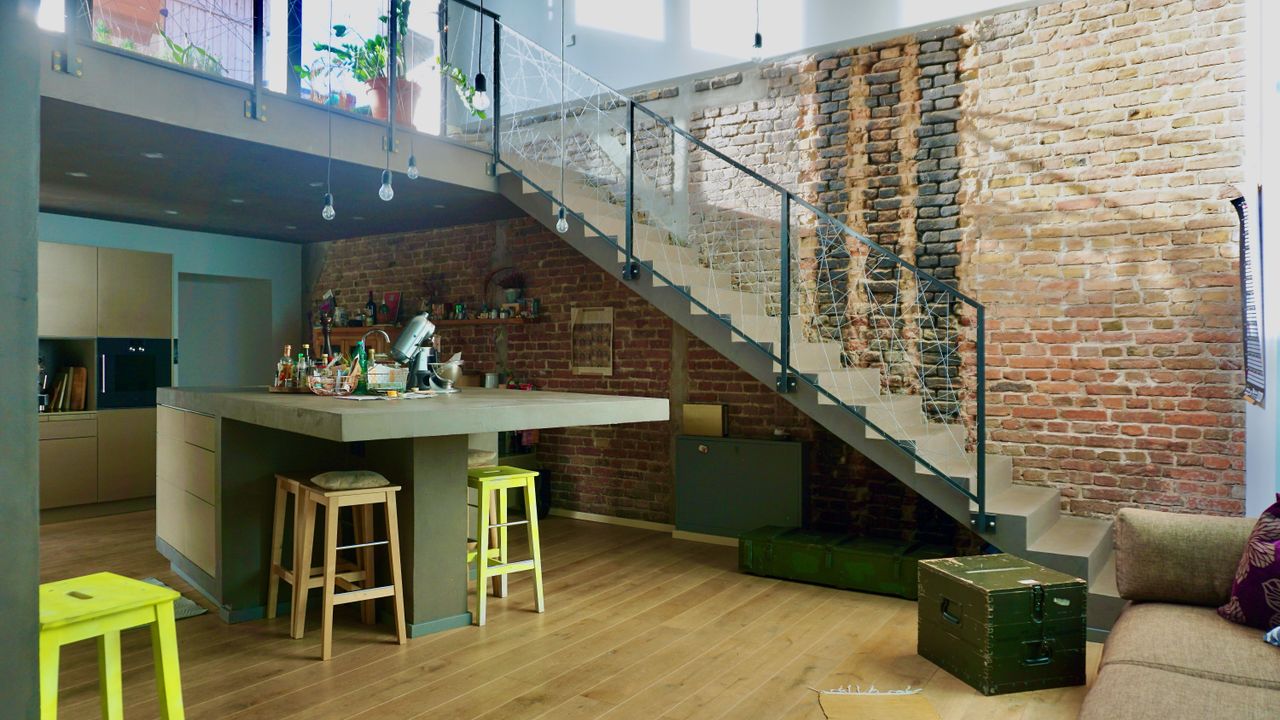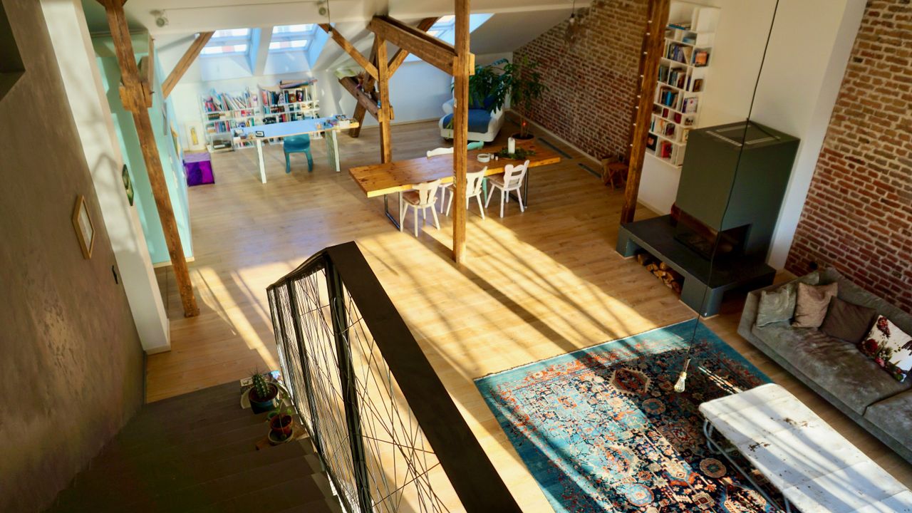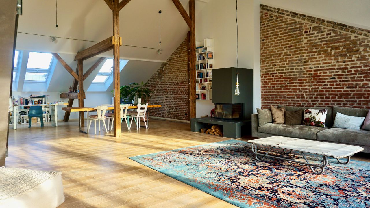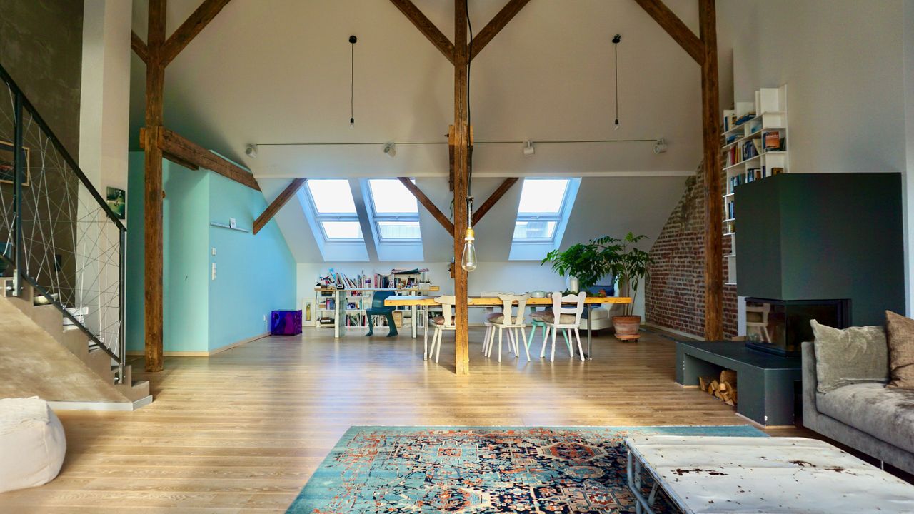 Individueller Designer-Dachstuhl in Kreuzberg. Mit offenem Mauerwerk, Kamin, offener Küche, Galerie, in den Boden eingelassener Badewanne und Sauna auf der Dachterrasse mit Blick auf den Fernsehturm