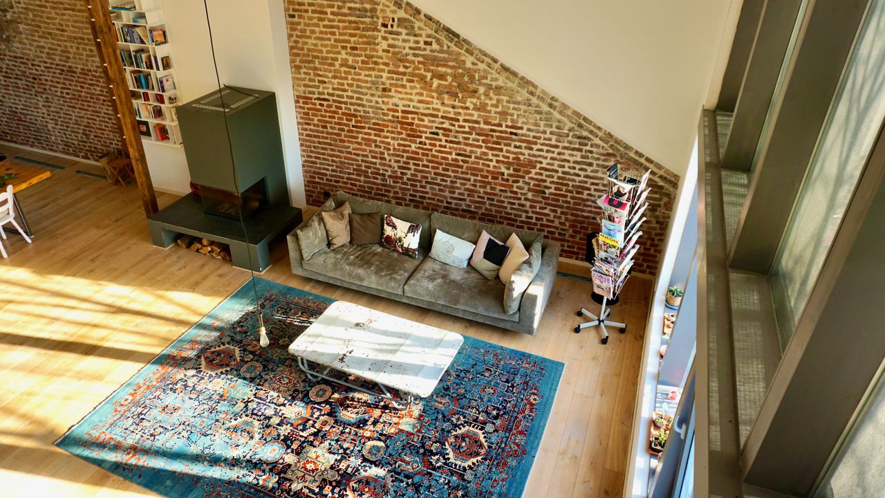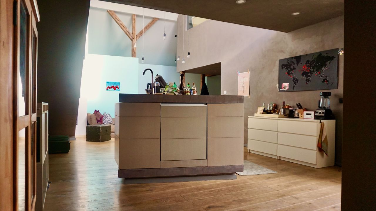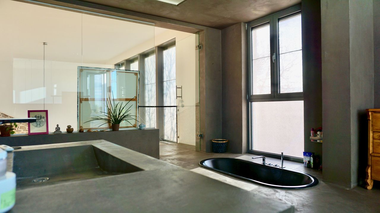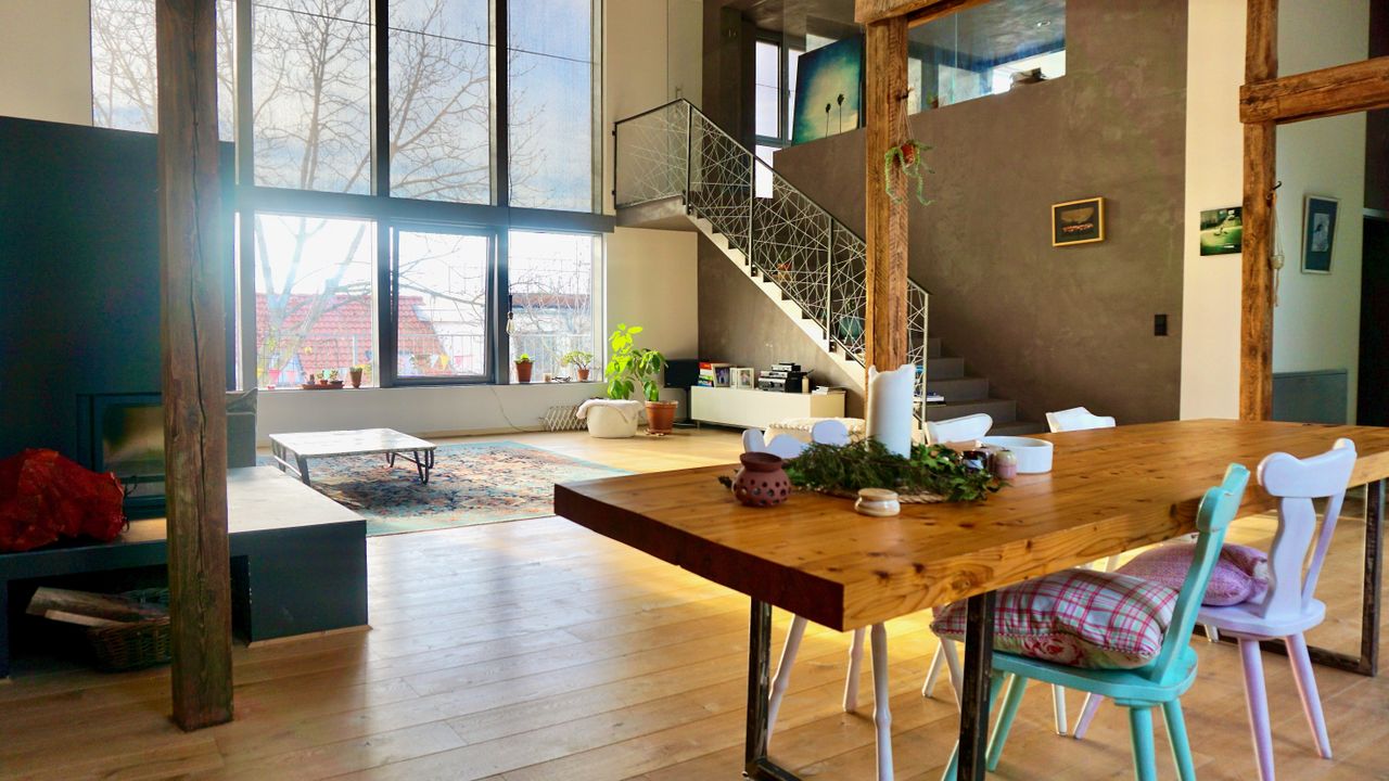 Individueller Designer-Dachstuhl in Kreuzberg. Mit offenem Mauerwerk, Kamin, offener Küche, Galerie, in den Boden eingelassener Badewanne und Sauna auf der Dachterrasse mit Blick auf den Fernsehturm