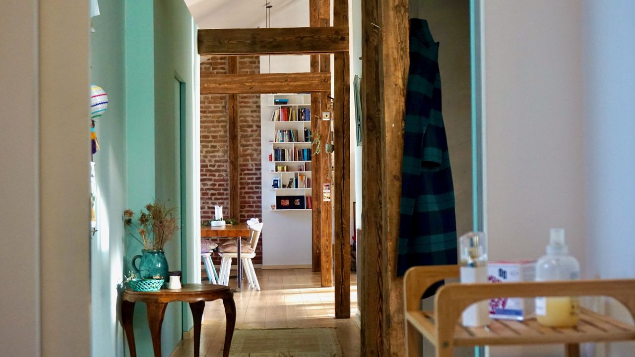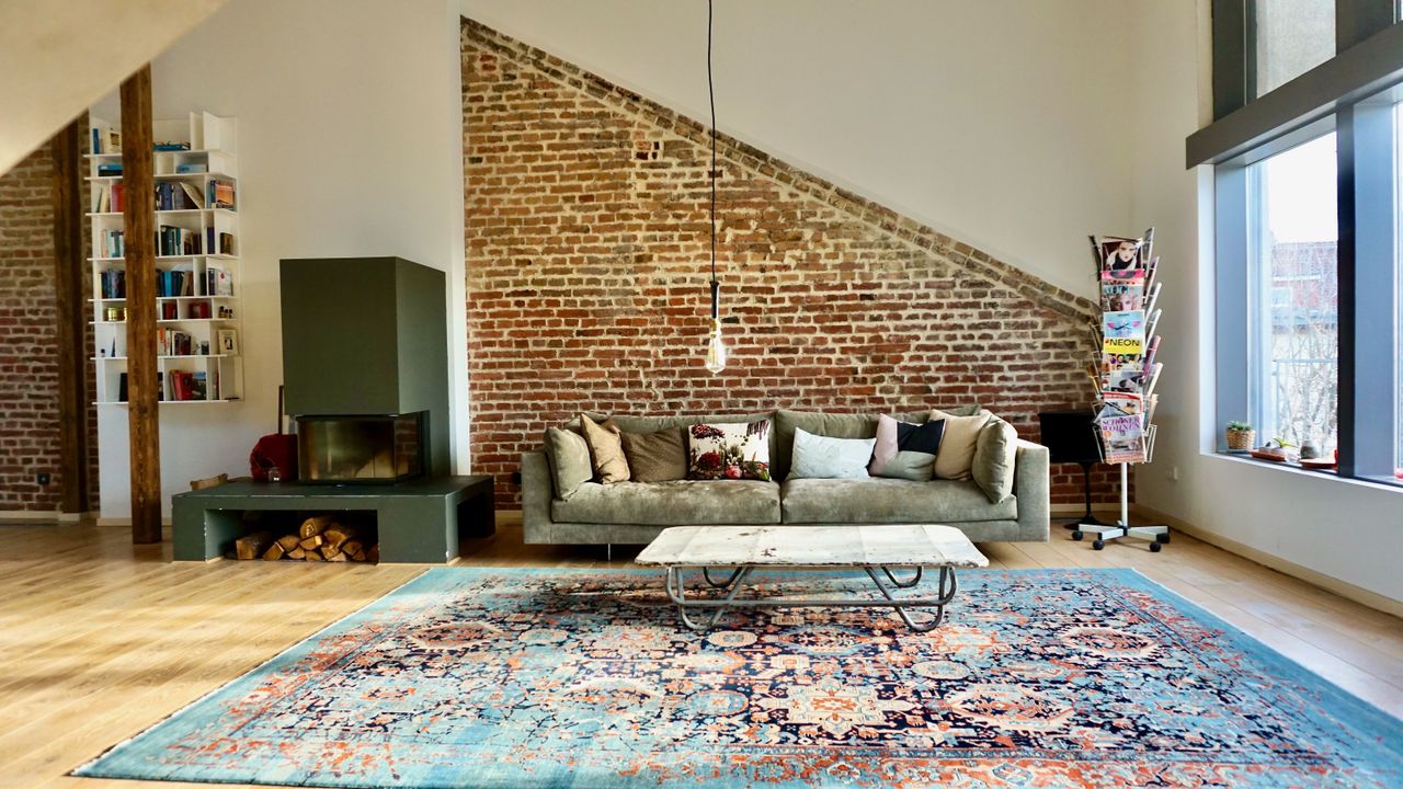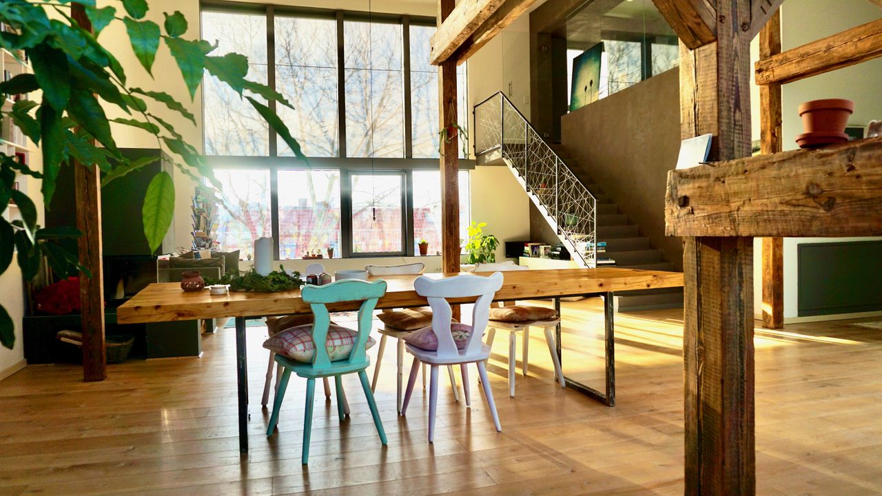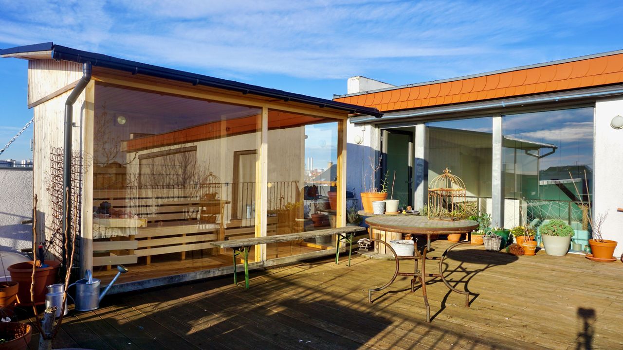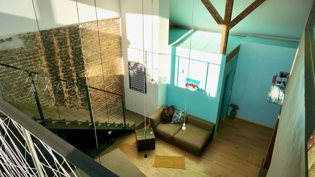 Individueller Designer-Dachstuhl in Kreuzberg. Mit offenem Mauerwerk, Kamin, offener Küche, Galerie, in den Boden eingelassener Badewanne und Sauna auf der Dachterrasse mit Blick auf den Fernsehturm
