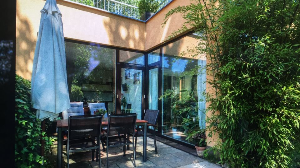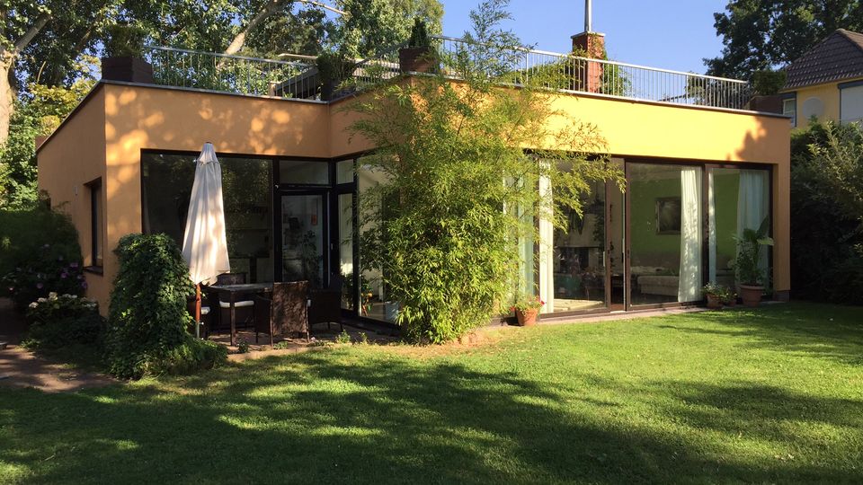Außergewöhnliches Town-Haus in idyllischer Stadtlage mit begehbarer Dachterrasse und großem Garten. Wohnzimmer mit komplett verglasten Außenwänden für einen unversperrten Blick in den Garten. Kamin, große Wohnküche, Bad mit Whirlpoolwanne und Rainshower-Dusche, Gäste-WC und Lounge und Pool im Garten.