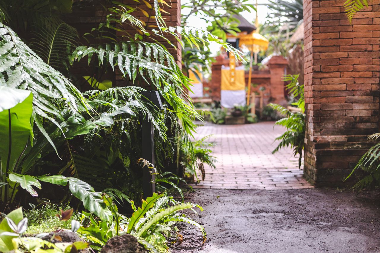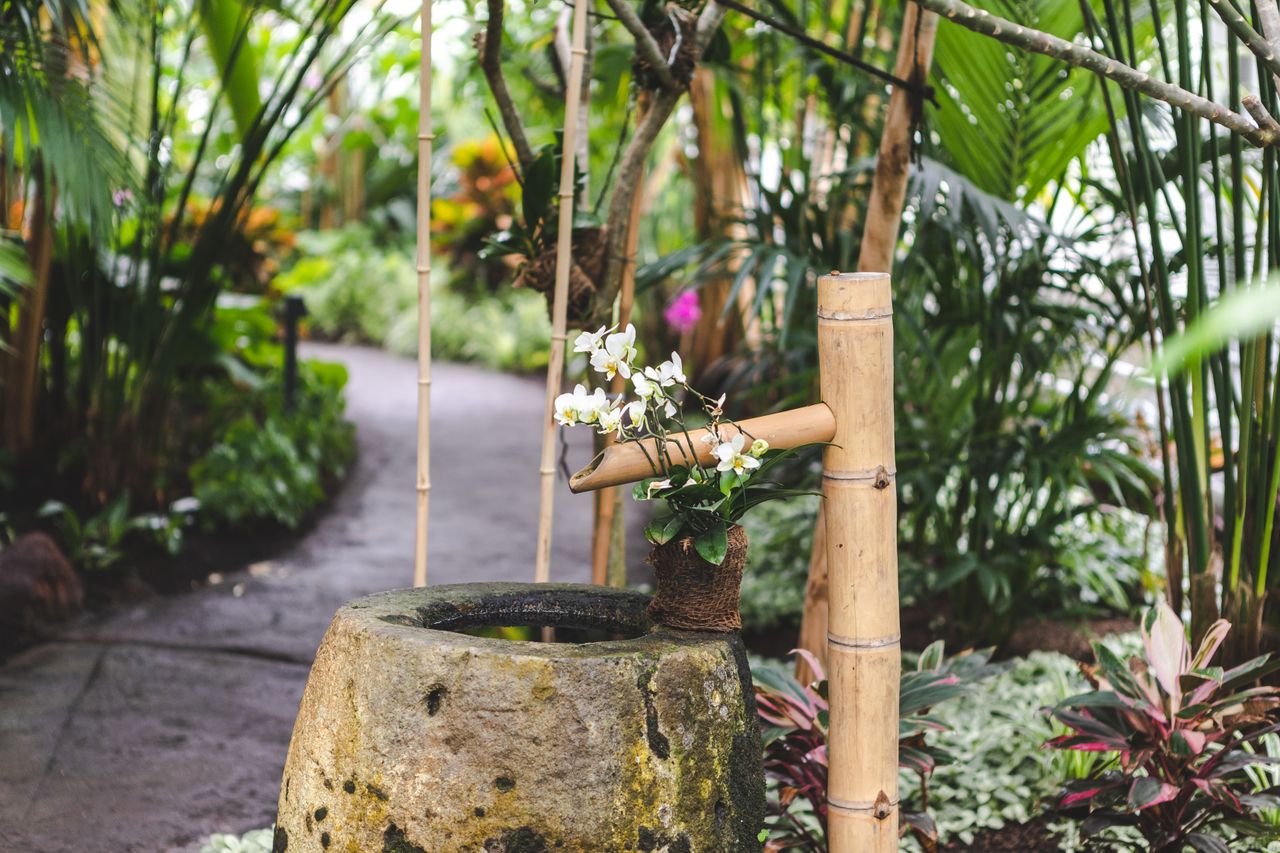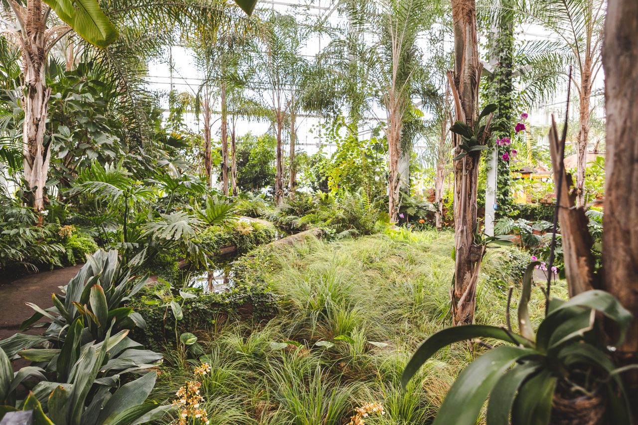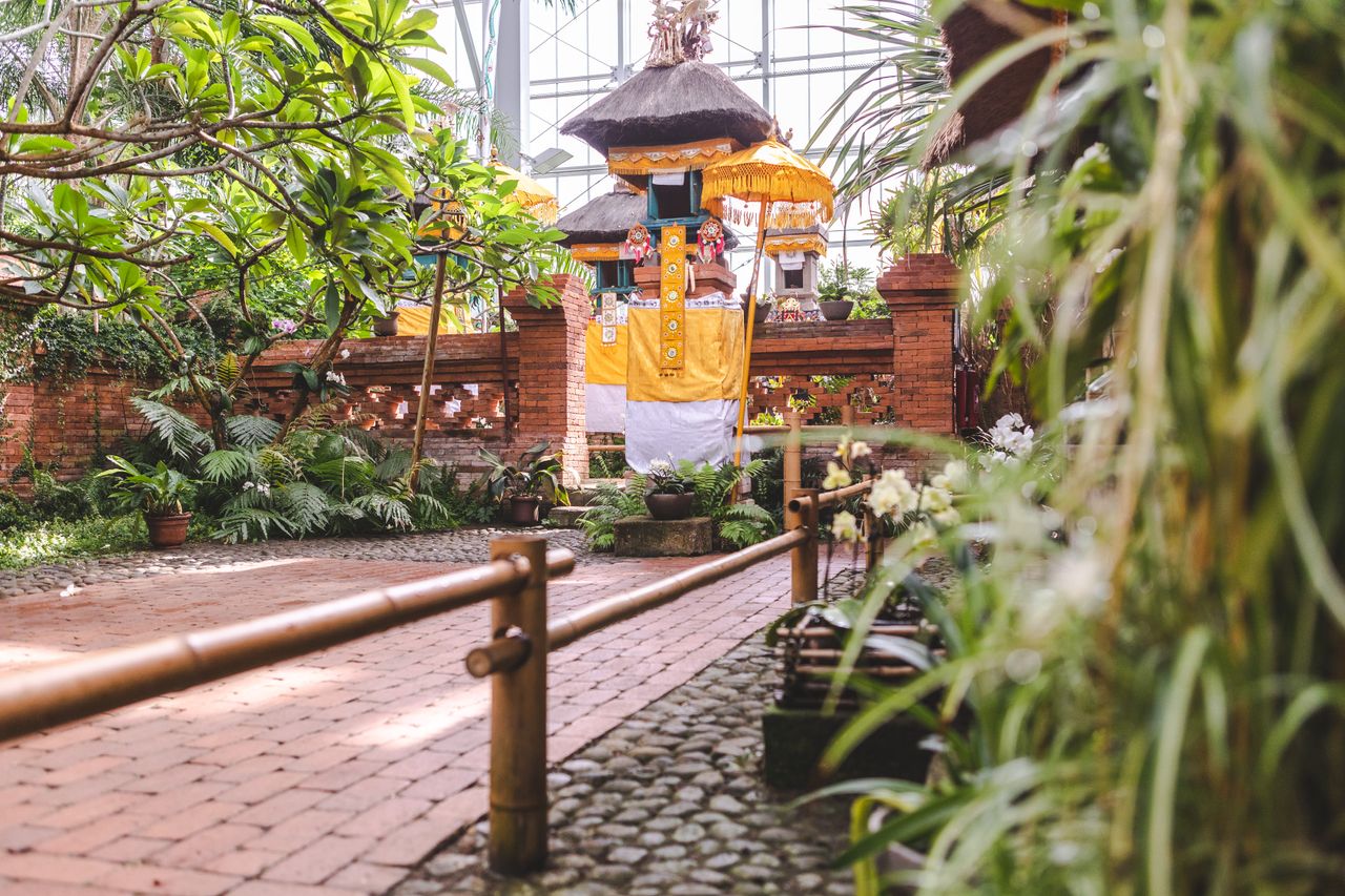 Der Balinesische Garten in der Tropenhalle ist eine opulente Komposition aus exotischem Urwald, Tempelanlagen und tropischen Anpflanzungen. Im Zentrum der 14 m hohen Hallen steht ein südbalinesischer Wohnhof, der durch eine Lehmziegelmauer von seiner Umgebung abgegrenzt ist.