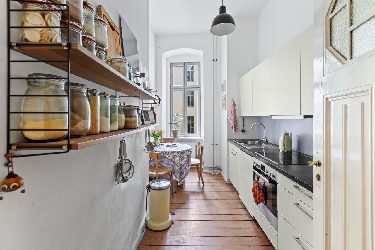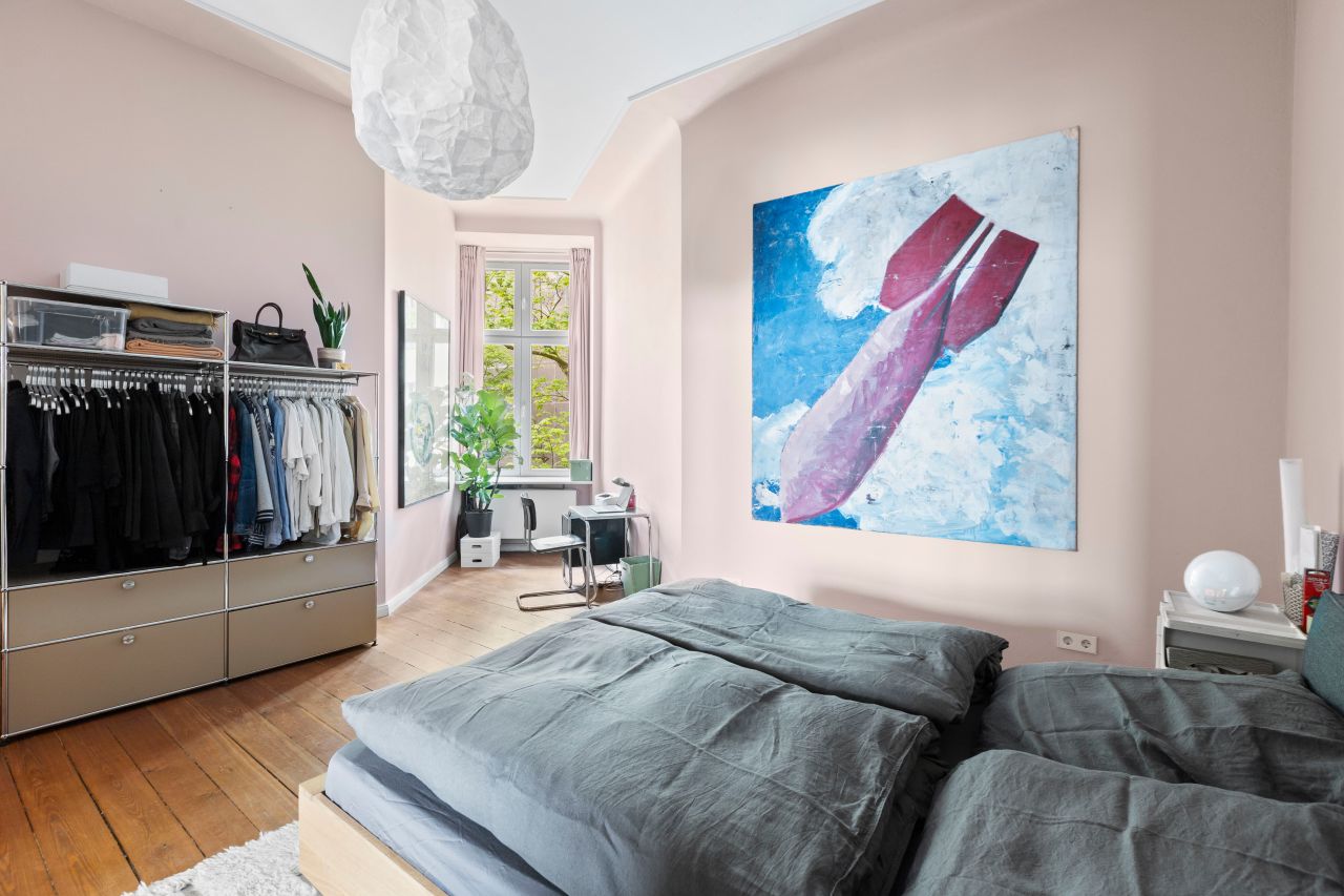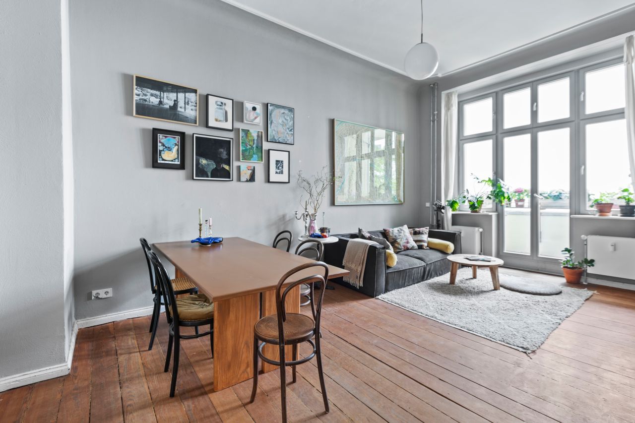 Schöne freundliche Berliner Altbauwohnung mit dekorativen Türelementen, Flügeltür, üppigem Balkon und Dielenboden.