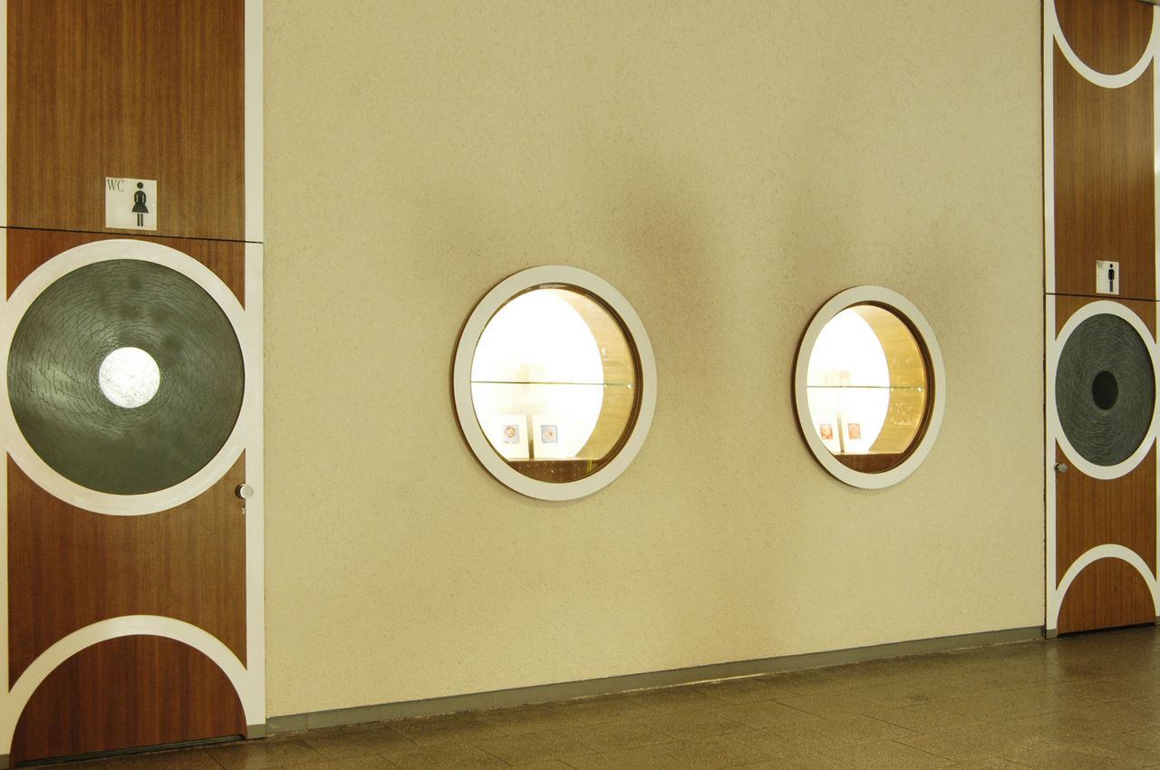 Ein besonderes Highlight, im doppelten Sinn, stellt der große kugelförmige Leuchter aus unzähligen Kunststoffrippen dar, der nachüber 7 jähriger Zwischenlagerung im Keller, von Grund auf restauriert, nun wieder das Foyer erleuchtet und einen besonderen Blickfang bietet.