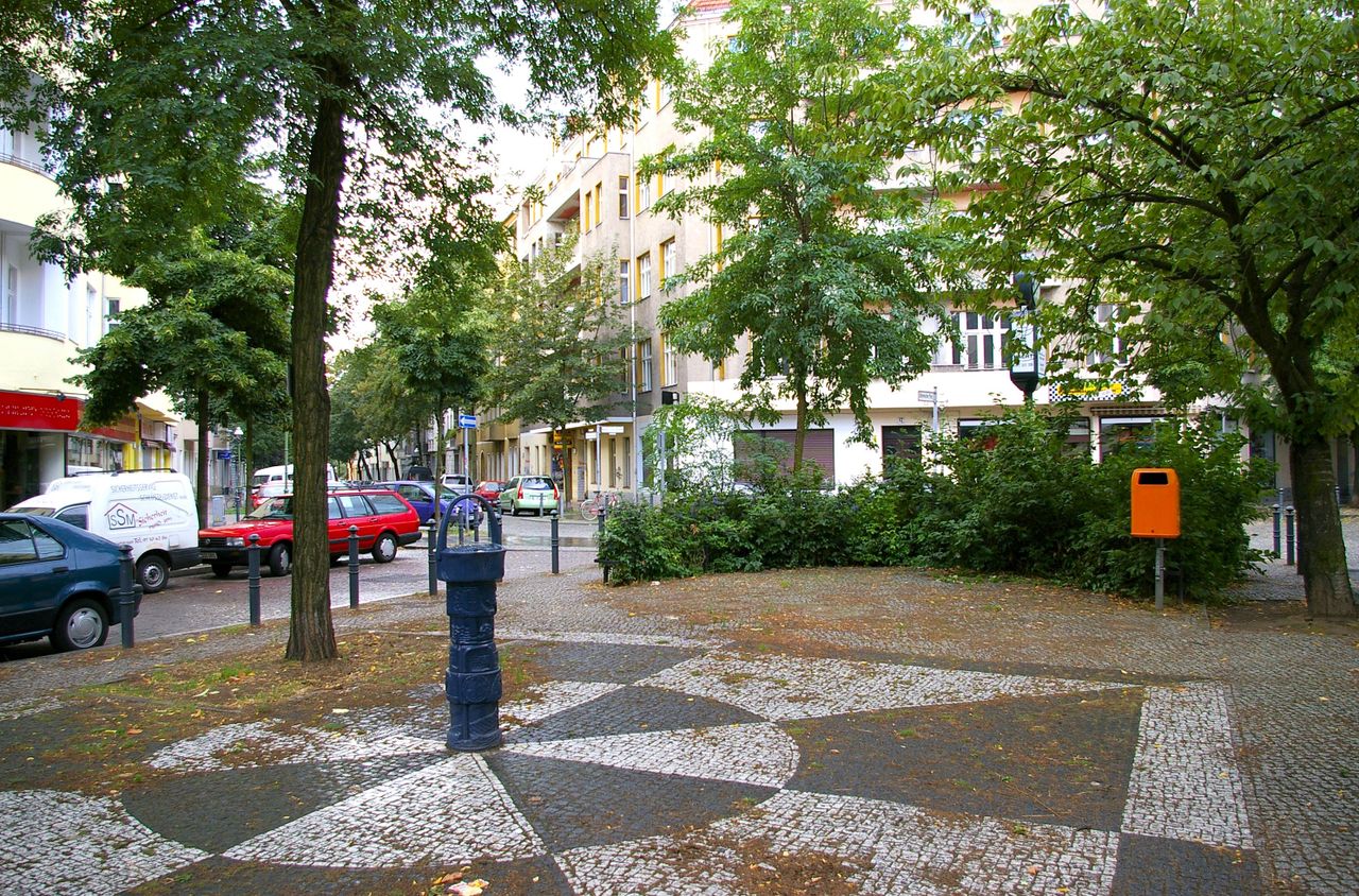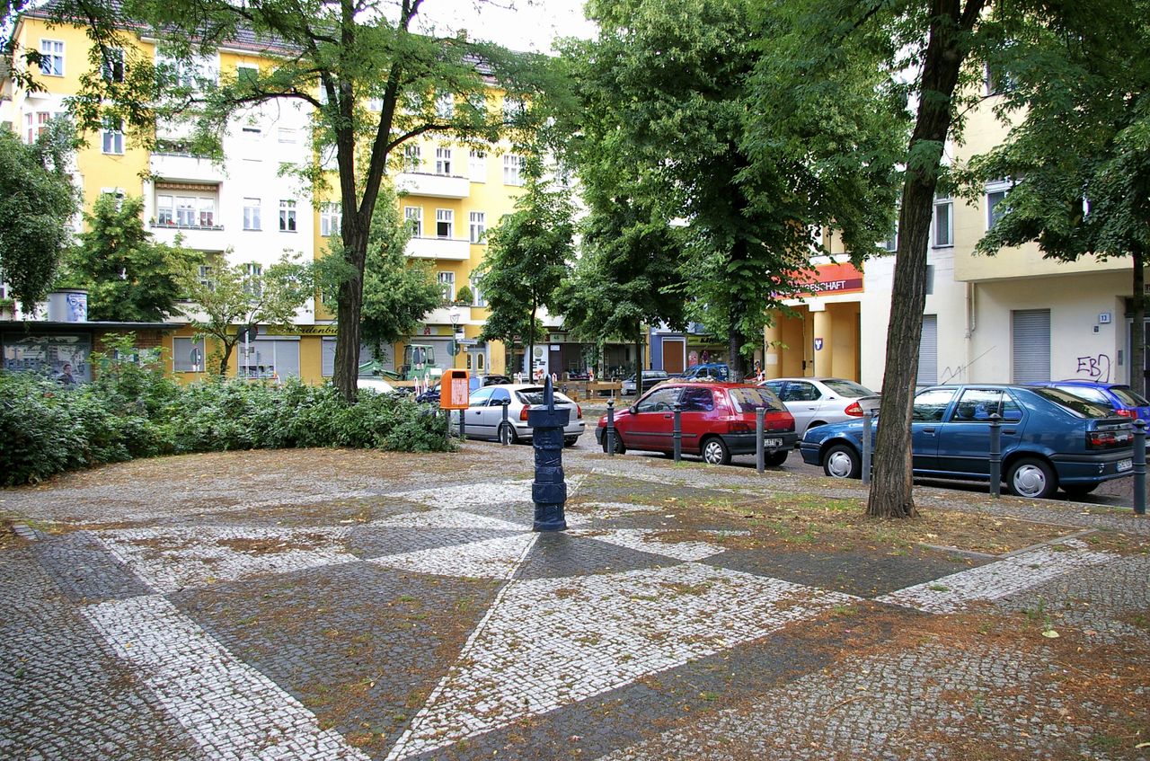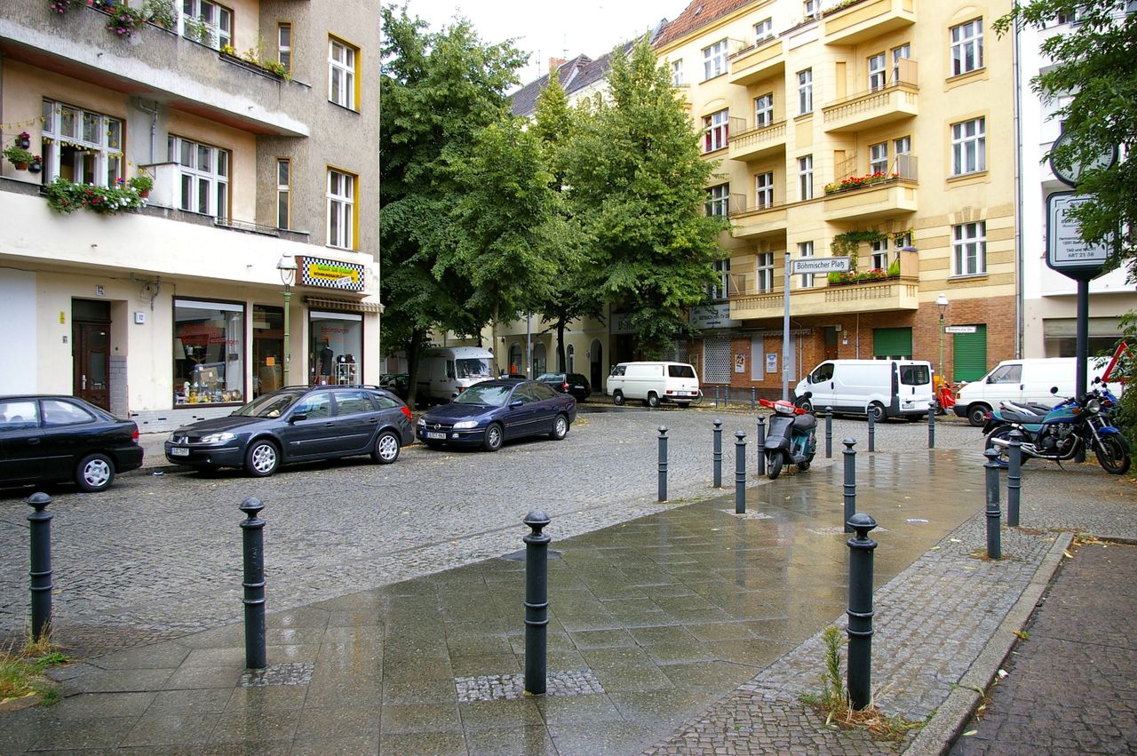 Kleiner Platz im ruhigen Teil von Neukölln, Wohnhäuser aus der Gründerzeit, teils renoviert