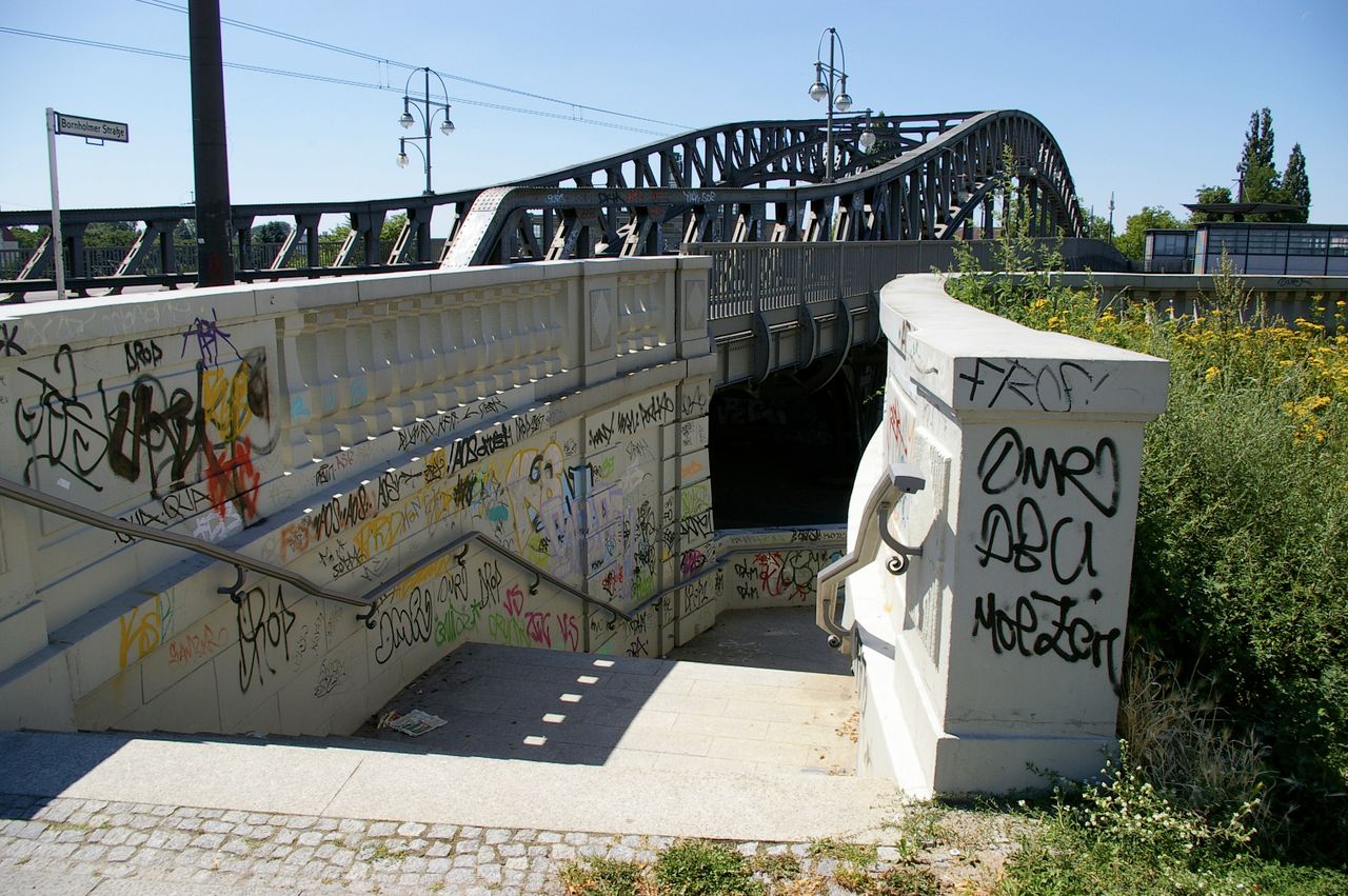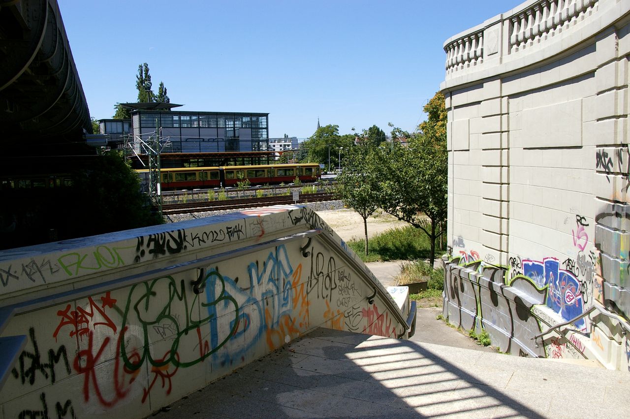 Stark befahrene Straße mit Brücke unter der diverse S - Bahnlinien verkehren. Oberhalb der Brücke fahren zwei Trambahnlinien, die den ehemaligen Osten mit dem Westen (Wedding) verbinden.