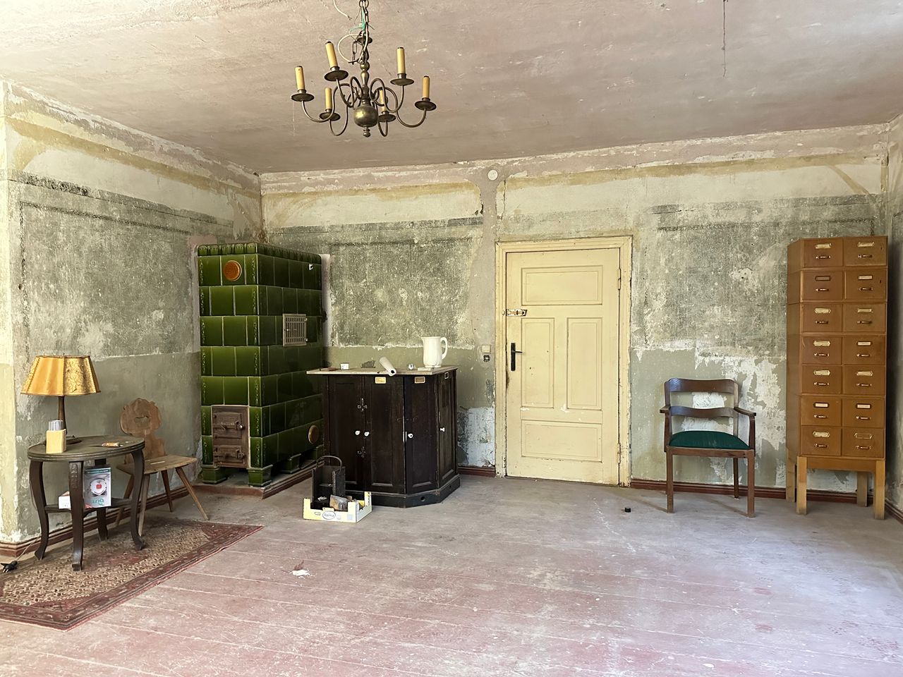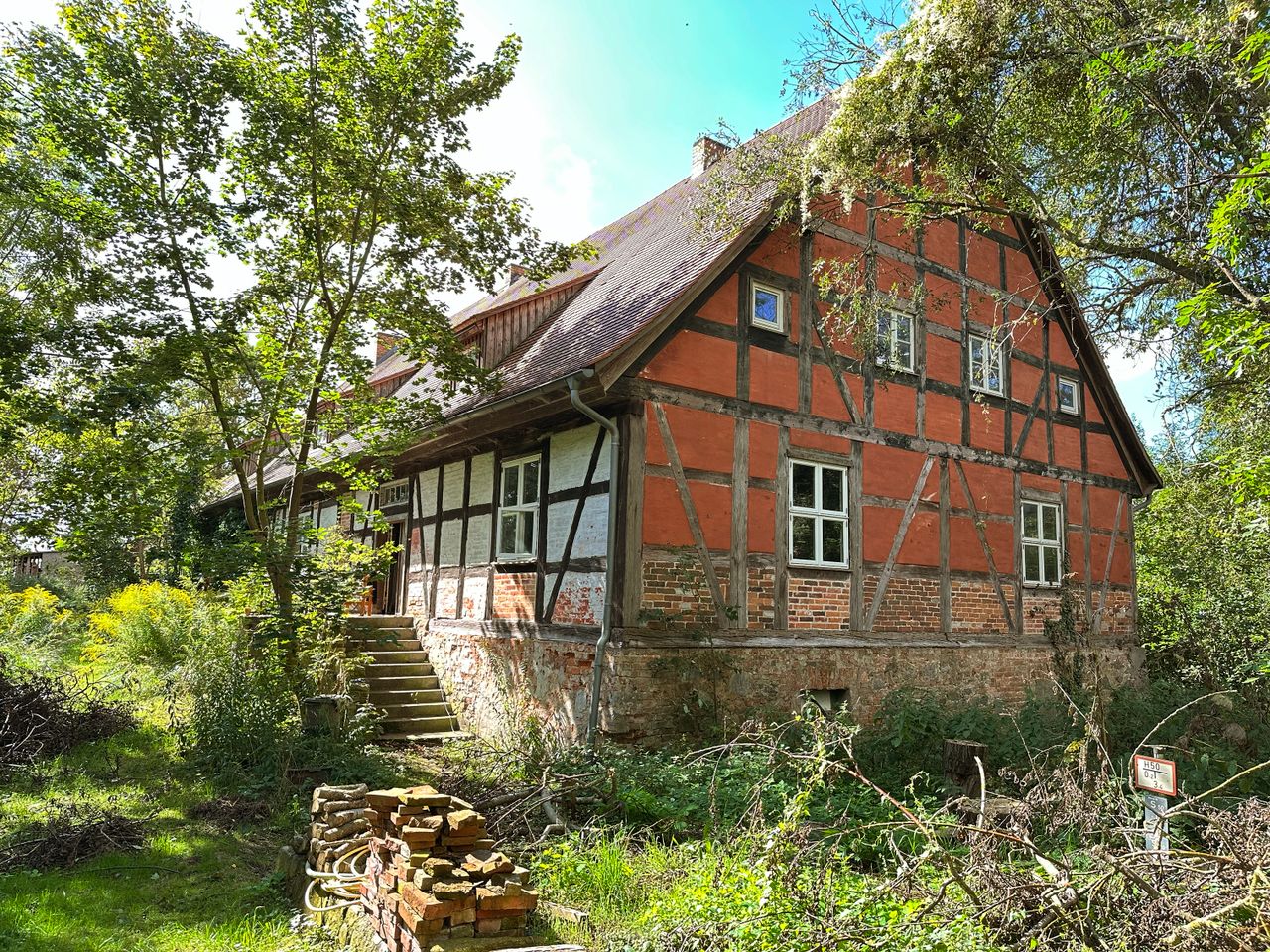Wir sanieren das Haus gerade mit Lehmputzwänden und Holzboden denkmal gerecht. Es ist ein Erdgeschoss mit ca. 300 m2 Fläche und 12 Zimmern, ein Obergeschoss mit 300 m2 und 5 Zimmern, ein Dachboden mit Schrägen und ein Gewölbekeller zur Verfügung.