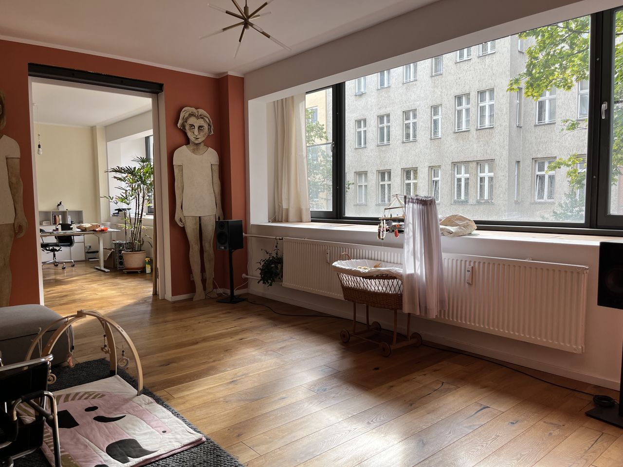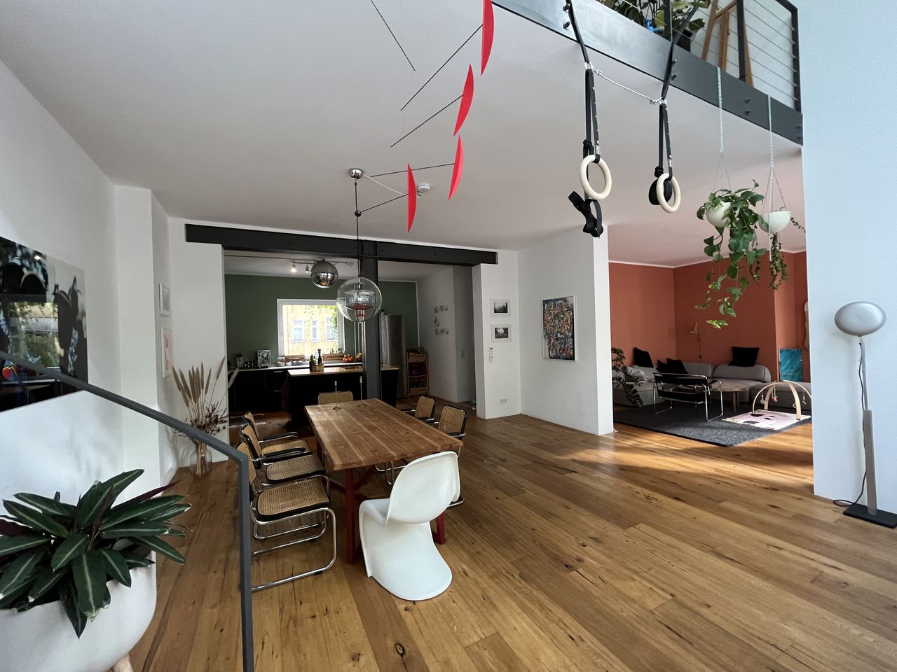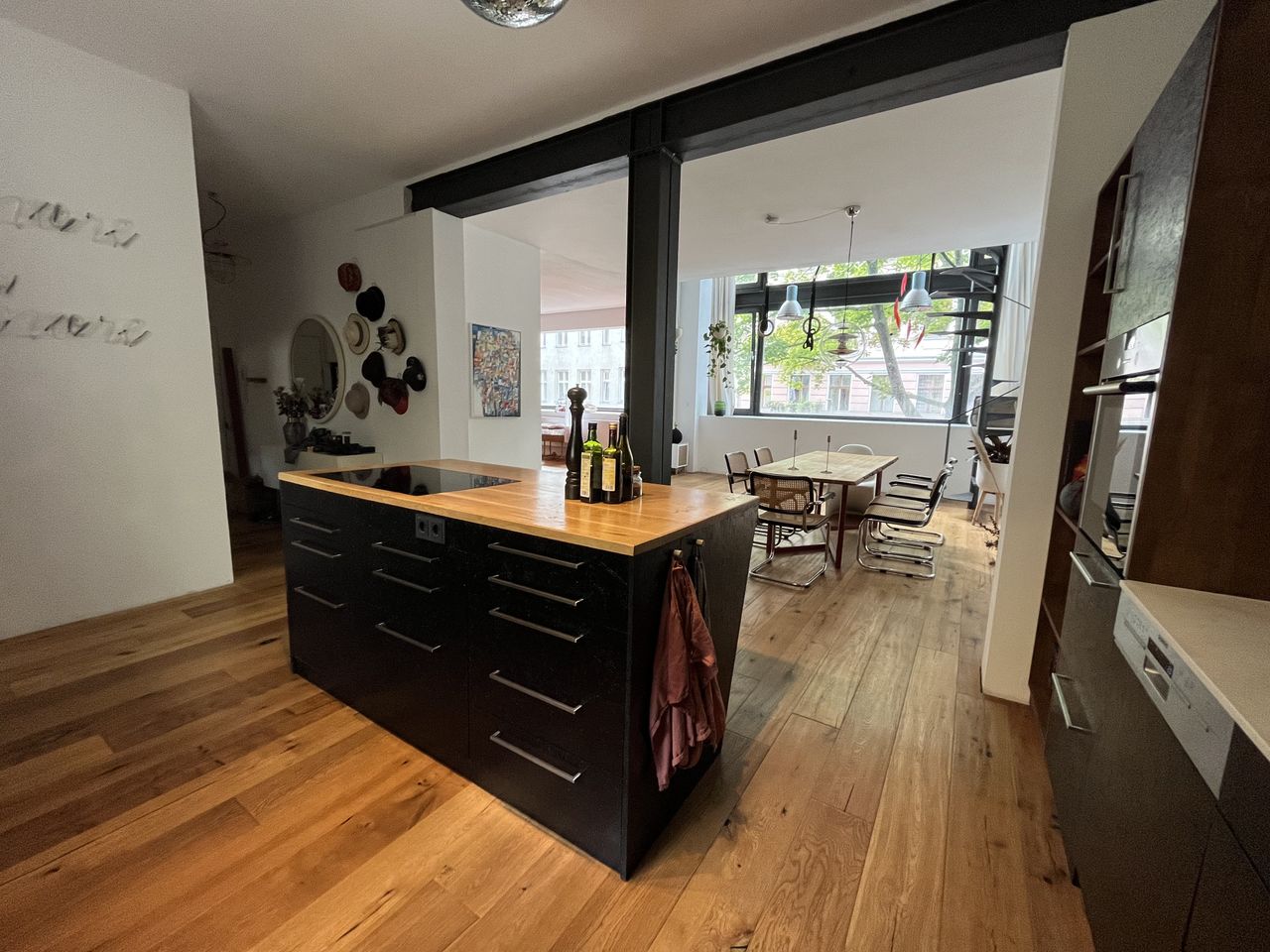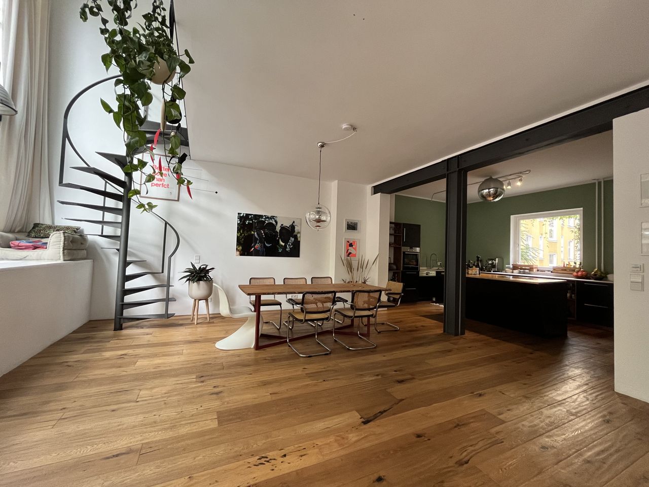 Discover an extraordinary film location in the heart of Berlin. This 200 sqm flat boasts spacious rooms with beautiful wooden floors and oversized windows, offering plenty of natural light. The marble bathrooms add a touch of luxury, while the open kitchen and dining room spanning two floors with a soaring 6-meter ceiling create a unique backdrop.