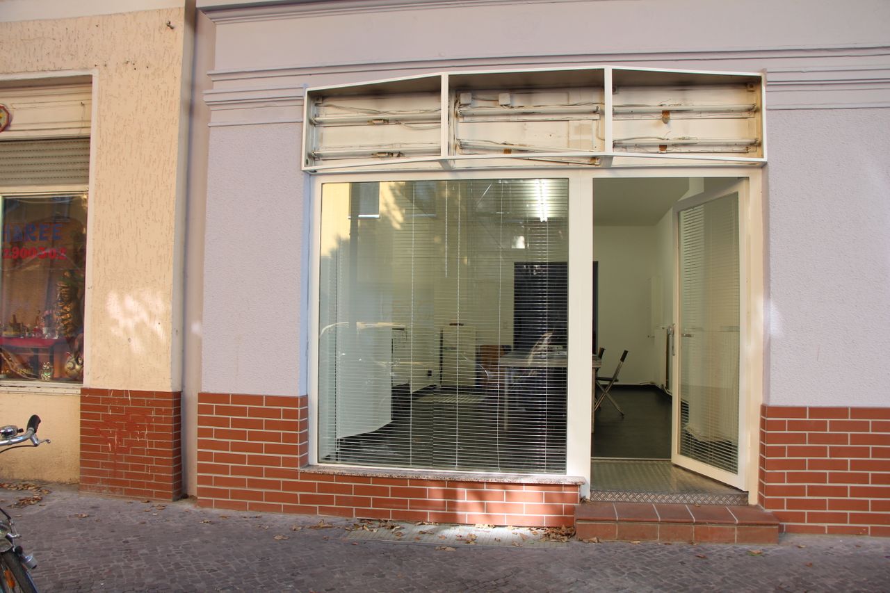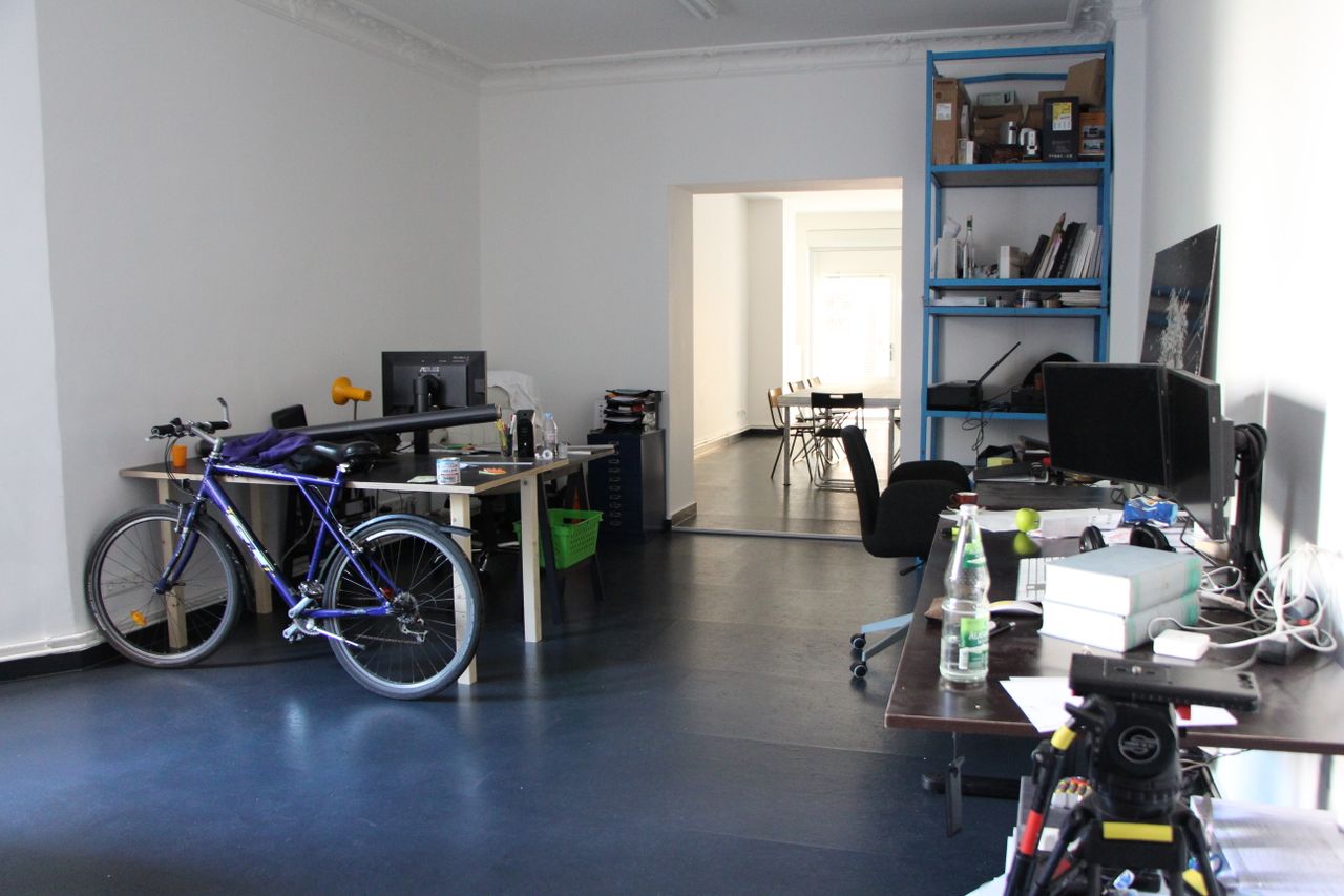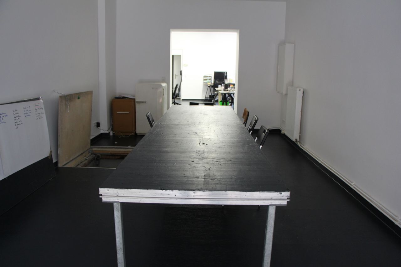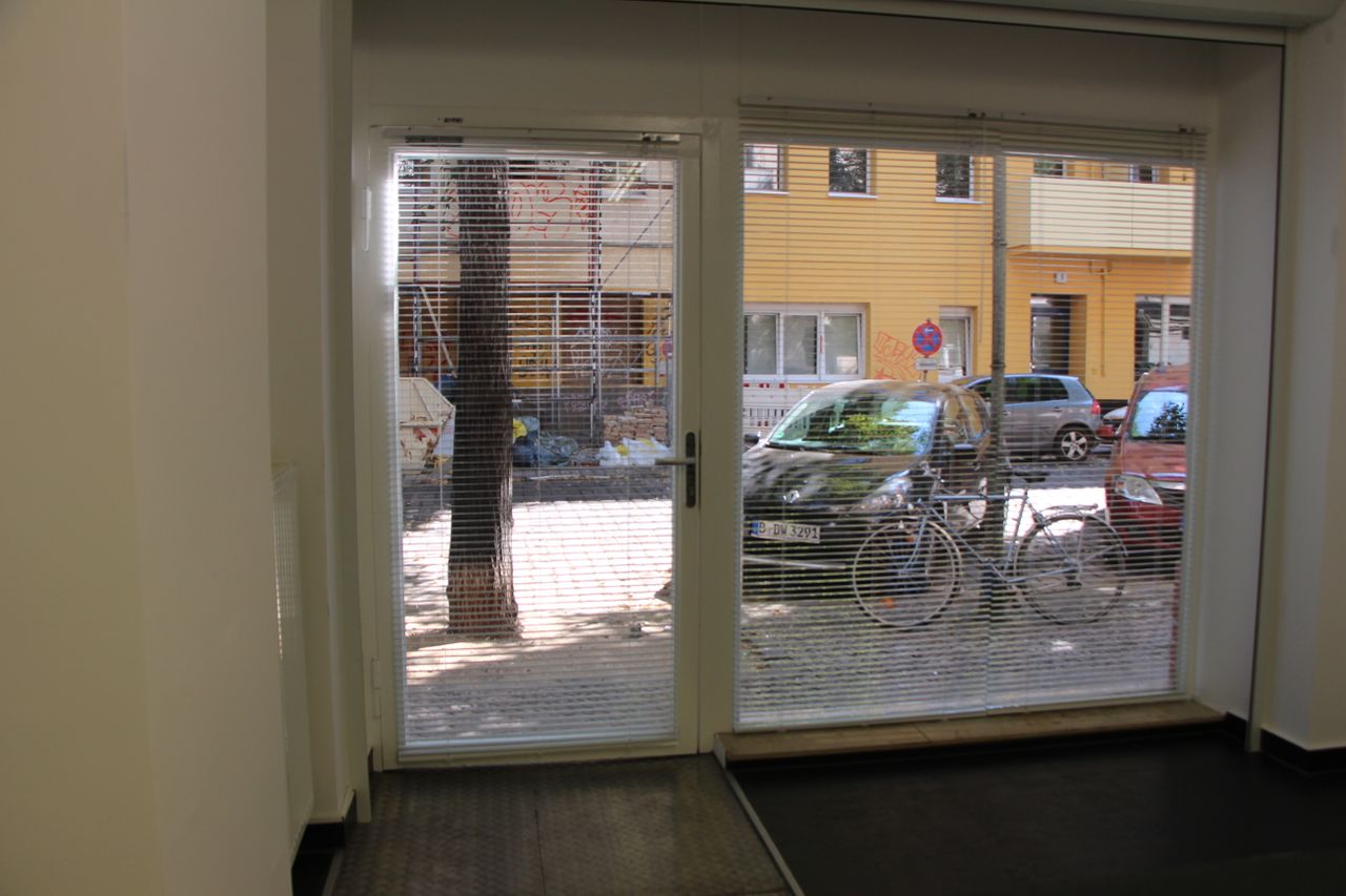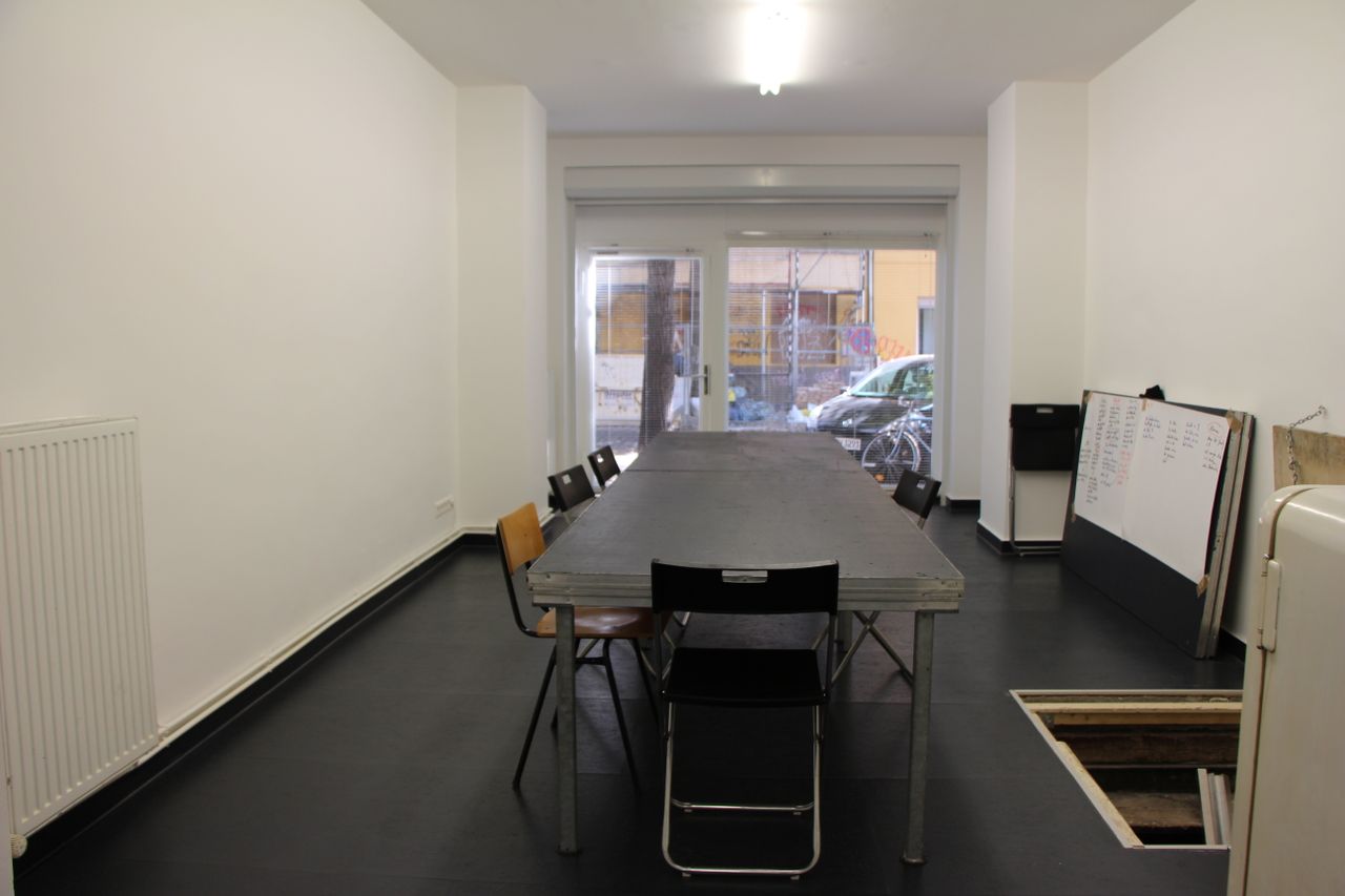 75 qm Gemeinschaftsbüro, typisches ehemaliges Ladenlokal im EG eines Altbaus. Großes Schaufenster zur Straße. Unterteilt in einen Konferenzraum und einen Arbeitsraum mit Schreibtischen. Im Konferenzraum gibt es eine Kellerluke. Der Keller ist ca. 20 qm groß. Bad und Küche im hinteren Teil, der zum Treppenhaus und zum Innenhof hinaus geht.