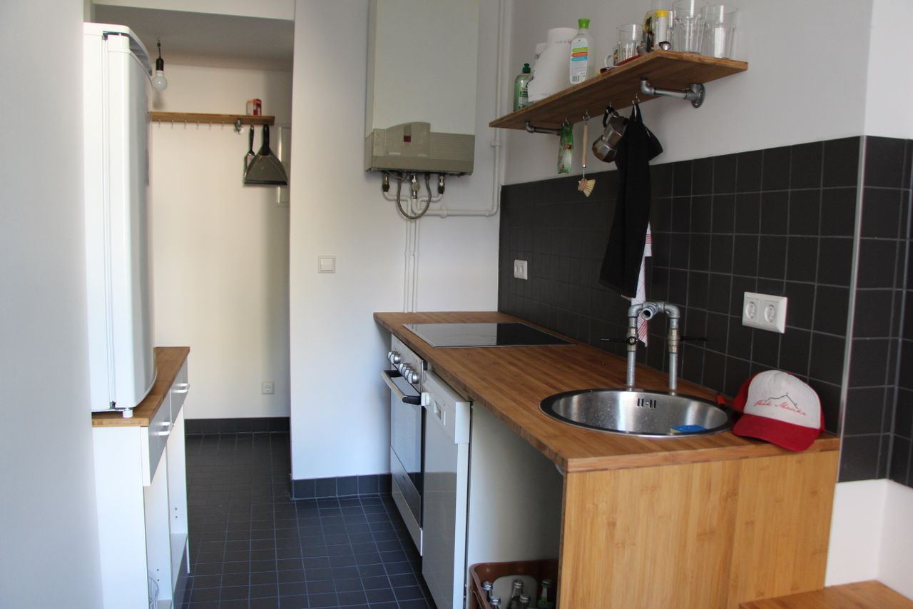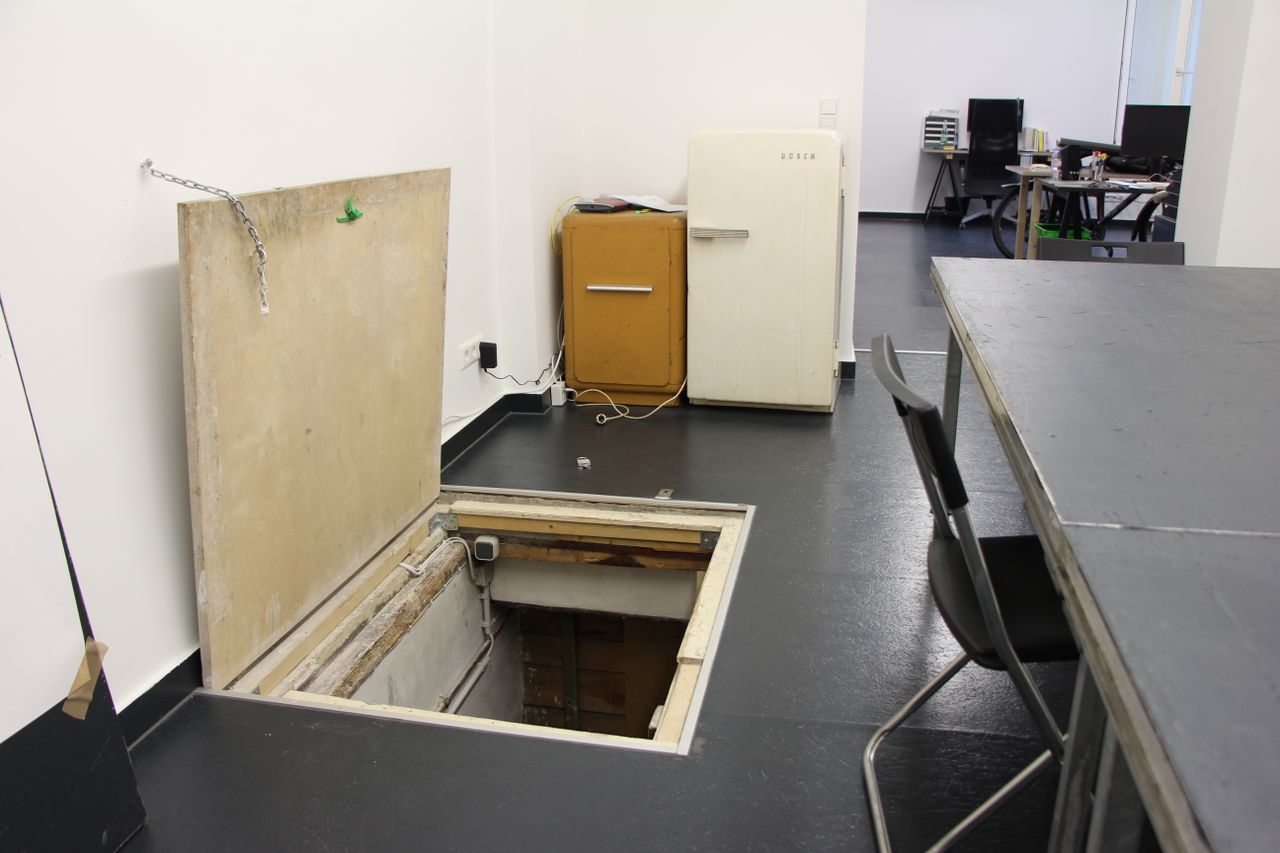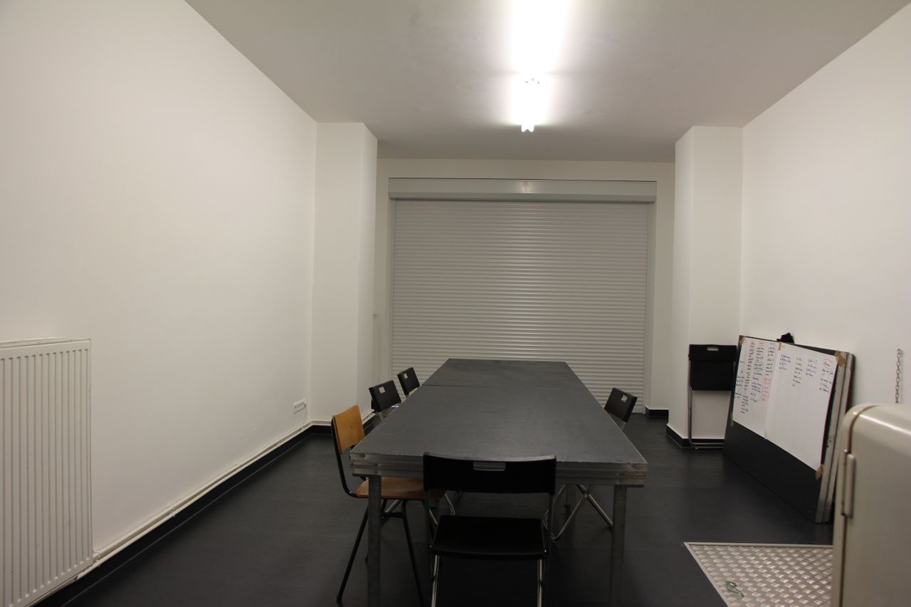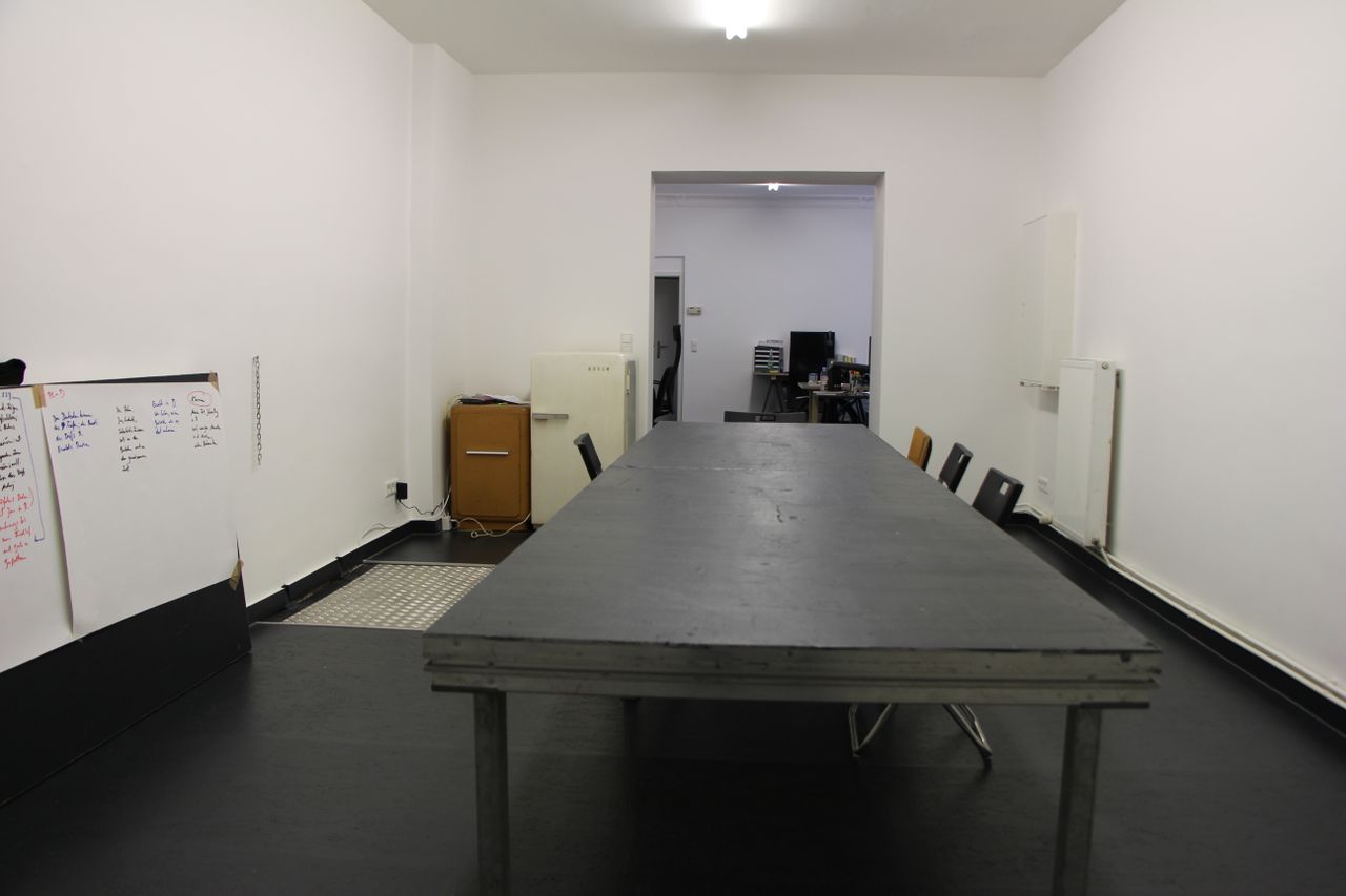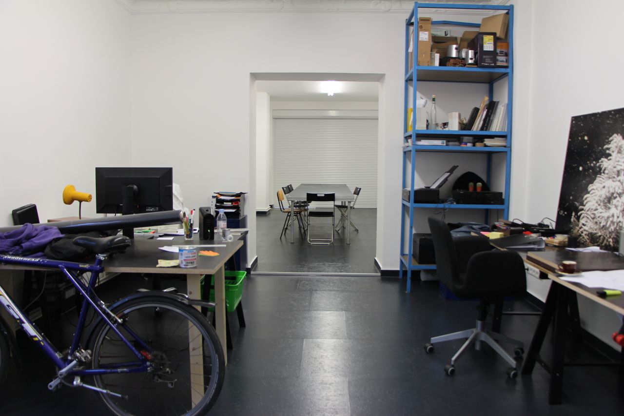 75 qm Gemeinschaftsbüro, typisches ehemaliges Ladenlokal im EG eines Altbaus. Großes Schaufenster zur Straße. Unterteilt in einen Konferenzraum und einen Arbeitsraum mit Schreibtischen. Im Konferenzraum gibt es eine Kellerluke. Der Keller ist ca. 20 qm groß. Bad und Küche im hinteren Teil, der zum Treppenhaus und zum Innenhof hinaus geht.
