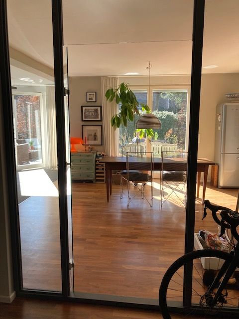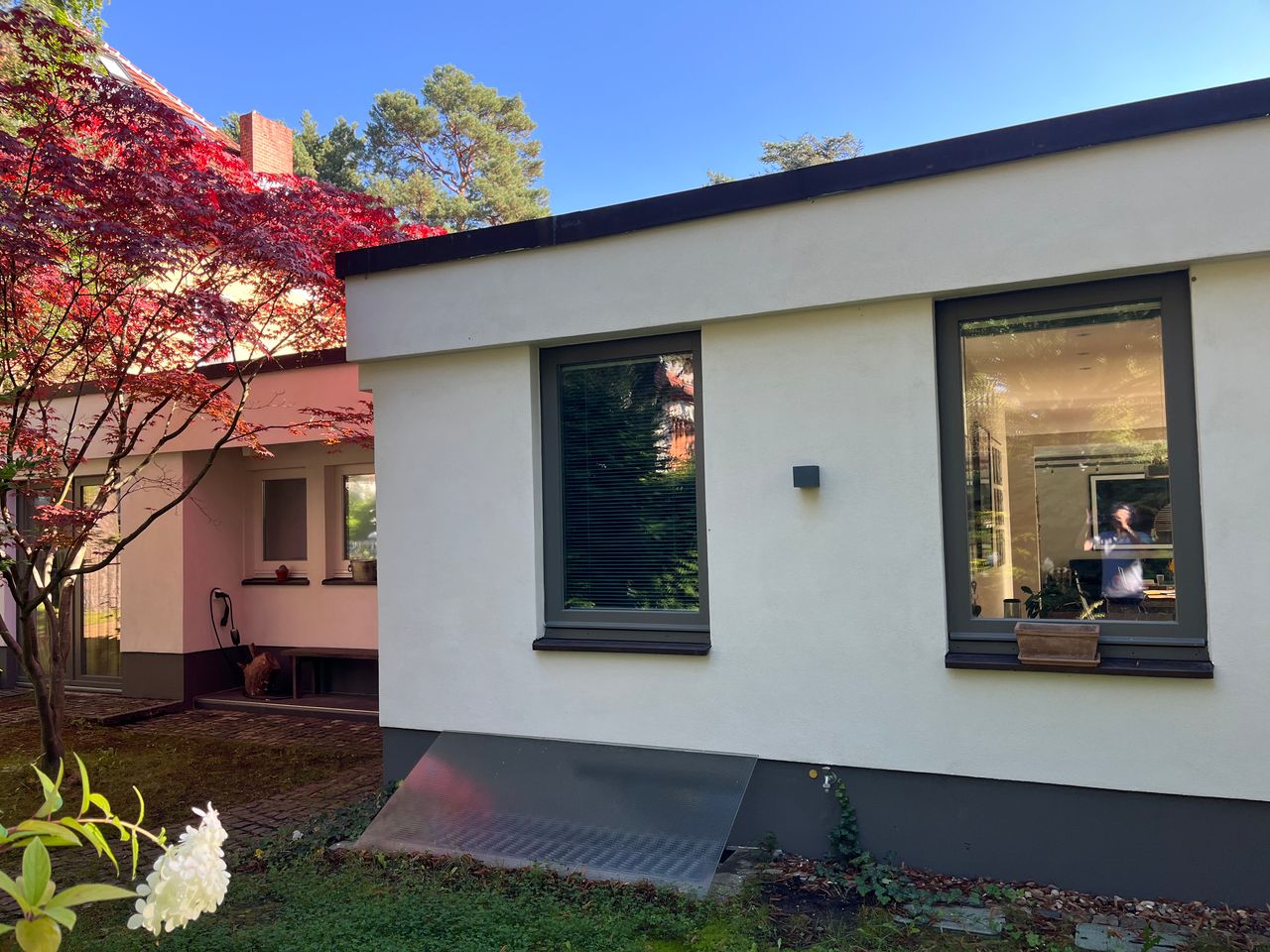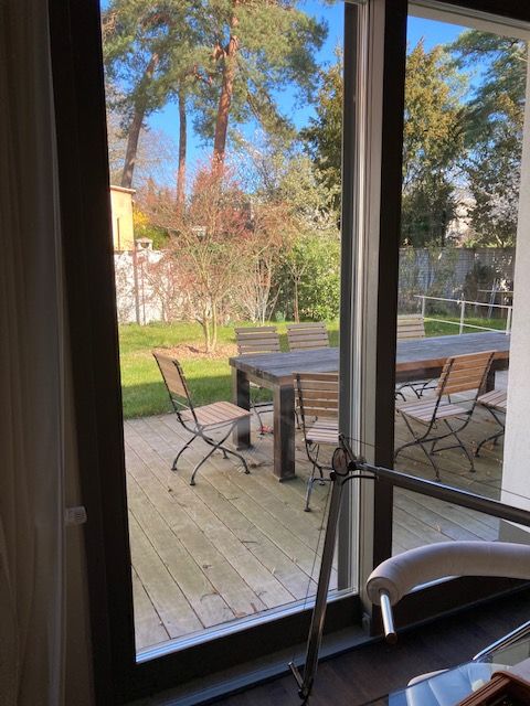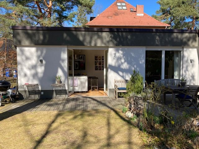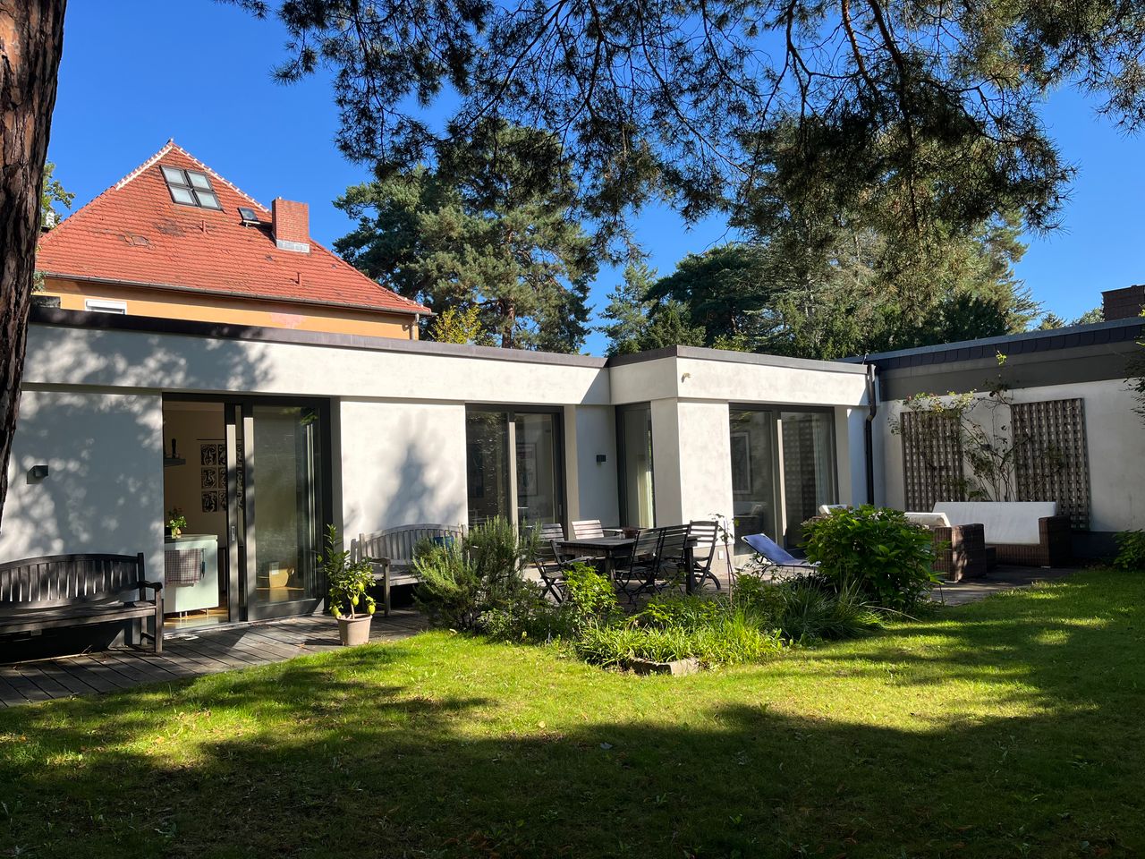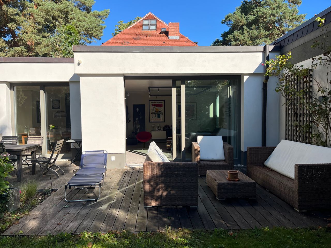 Ein sonniger Bungalow. Alle Fenster gehen bis zum Boden, so dass man ebenerdig raus und reingehen kann. Rundherum Garten. Ein großer Wohn/Essraum, offene Küche. Ein Schlaf- und ein Arbeitszimmer. Im Keller ein Billiardraum. Zwei Terassen. Holzboden oder Tretfort Teppich. Hochwertiges Mobilar. Gute Kunst. Im Wohn/Essraum sind Rolläden vorhanden, die es möglich machen die Räume abzudunkeln.