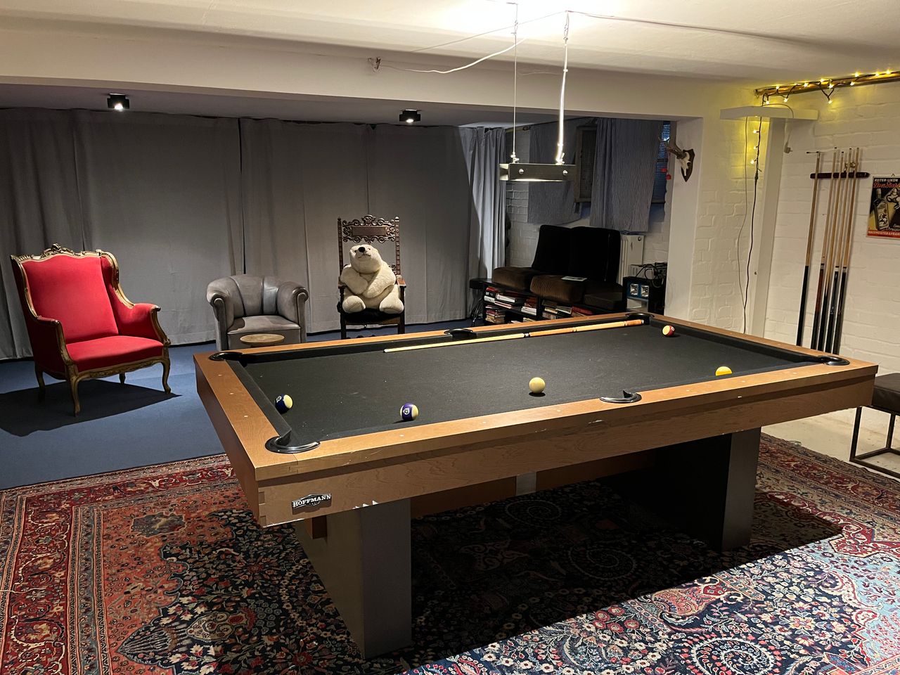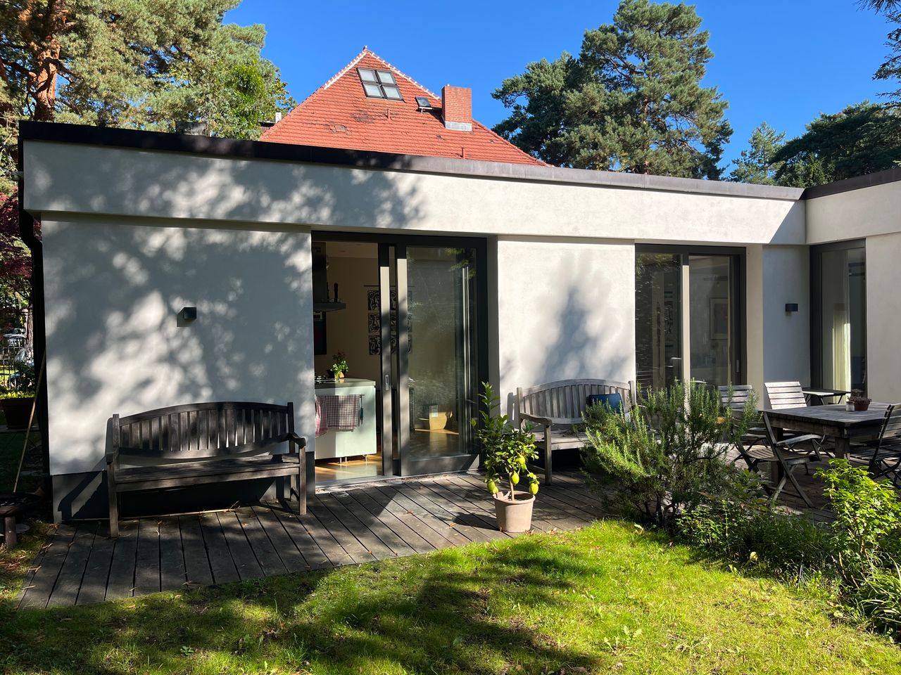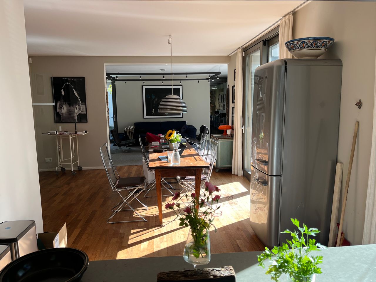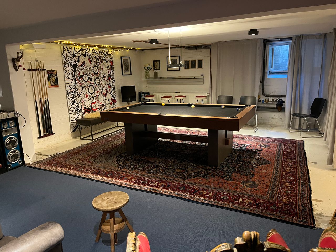 Ein sonniger Bungalow. Alle Fenster gehen bis zum Boden, so dass man ebenerdig raus und reingehen kann. Rundherum Garten. Ein großer Wohn/Essraum, offene Küche. Ein Schlaf- und ein Arbeitszimmer. Im Keller ein Billiardraum. Zwei Terassen. Holzboden oder Tretfort Teppich. Hochwertiges Mobilar. Gute Kunst. Im Wohn/Essraum sind Rolläden vorhanden, die es möglich machen die Räume abzudunkeln.