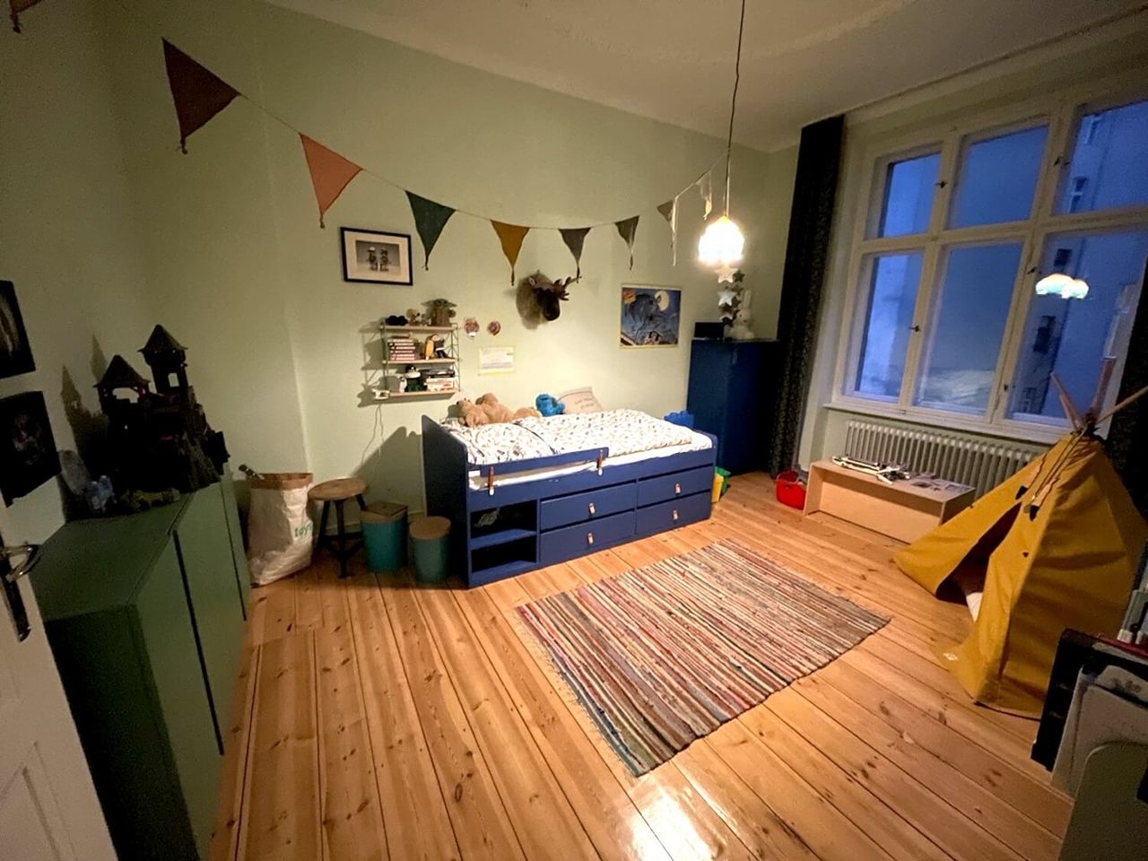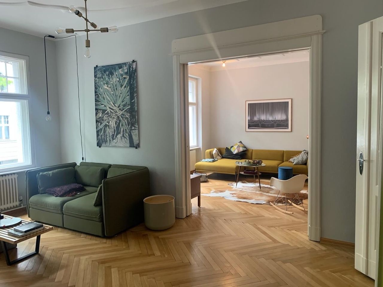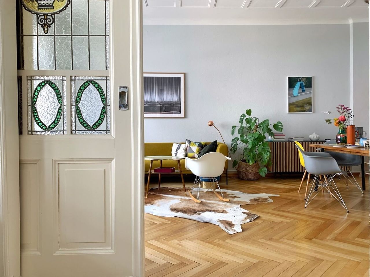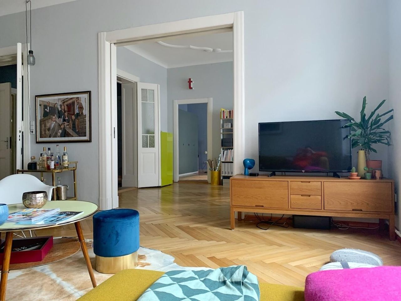 A beautiful Berlin Altbau, with its original fixtures and pops of playful color is opening its doors to welcome your creative productions. With large spacious rooms and huge windows this modern and colourful family apartment, will give your photo and film shoots authenticity in a natural setting.