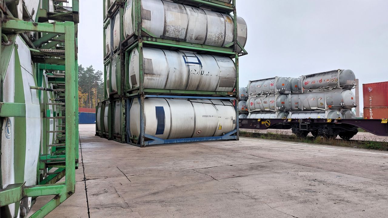Container Umschlagsplatz mit Schienen für Güterzüge