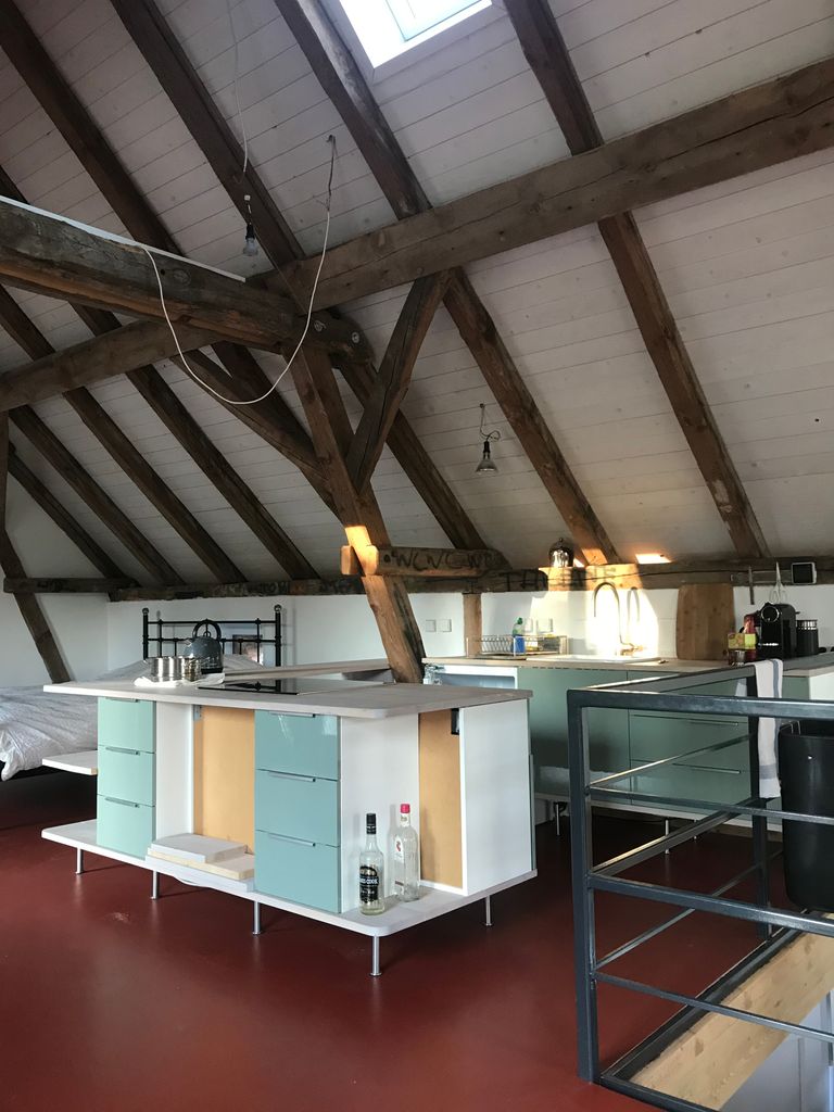 Im Dachgeschoss mit freiliegenden Dachbalken des alten Schafstalls öffnet sich überraschend ein einziger 70 m² großer Loft-Raum. Hier ist mehr als genug Platz für Wohnen und Arbeiten; denn W-LAN und schnelles Internet warten schon. Eye-catcher ist das große runde Südfenster zur Schlosswiese. Nach Westen geht es hinaus zum riesiggroßen Holzbalkon - das perfekte Frühstückszimmer (oder sundowner mit Blick zum Waldrand). Außerdem Wohlfühl-Fußbodenheizung und bullige Wärme durch den knuffigen Ofen mit Bratapfel-Platte.
