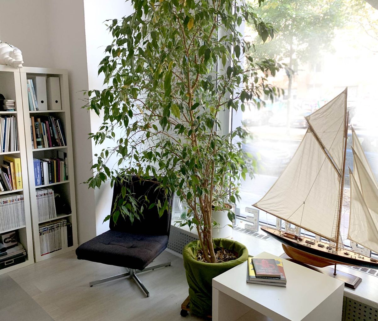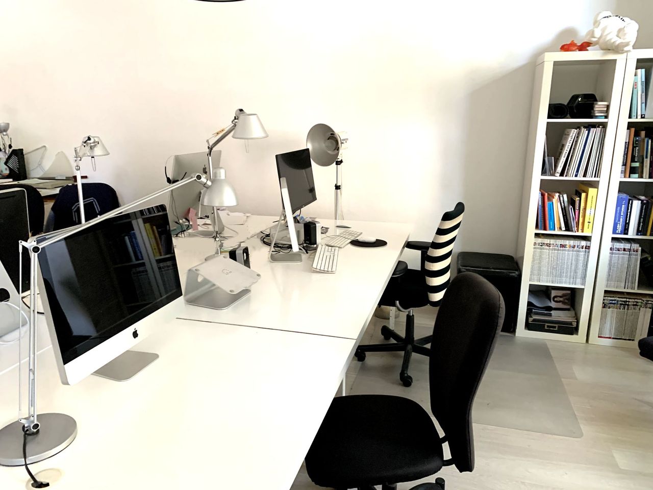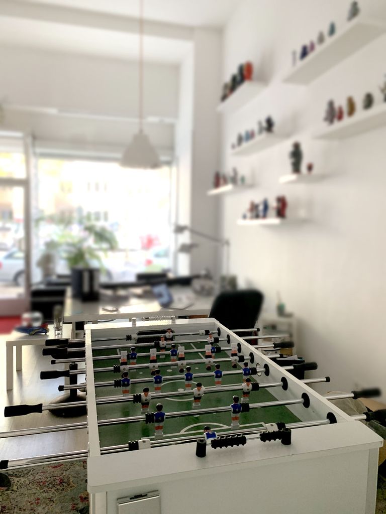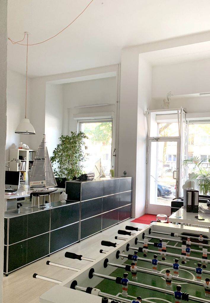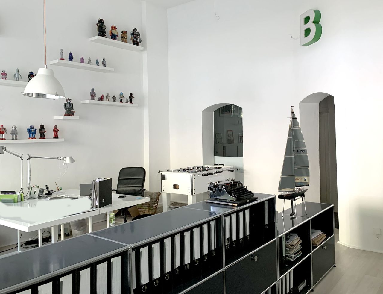 Ein großer heller Raum, hinter zwei großen Schaufenstern fast ebenerdig. Hohe Decken, eine Robotersammlung an den Wänden, entweder als Büro, Designagentur, Arbeitszimmer oder Wohnzimmer herrichtbar. Moderne Möbel, Industriestyle-Lampen, weiße Schreibtische, USM-Möbel. Beide Schaufenster sind komplett mit Rollos abdunkelbar.