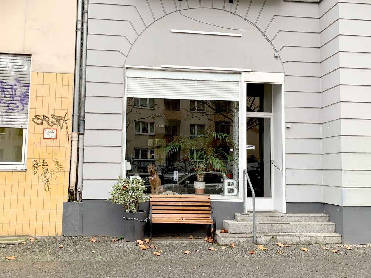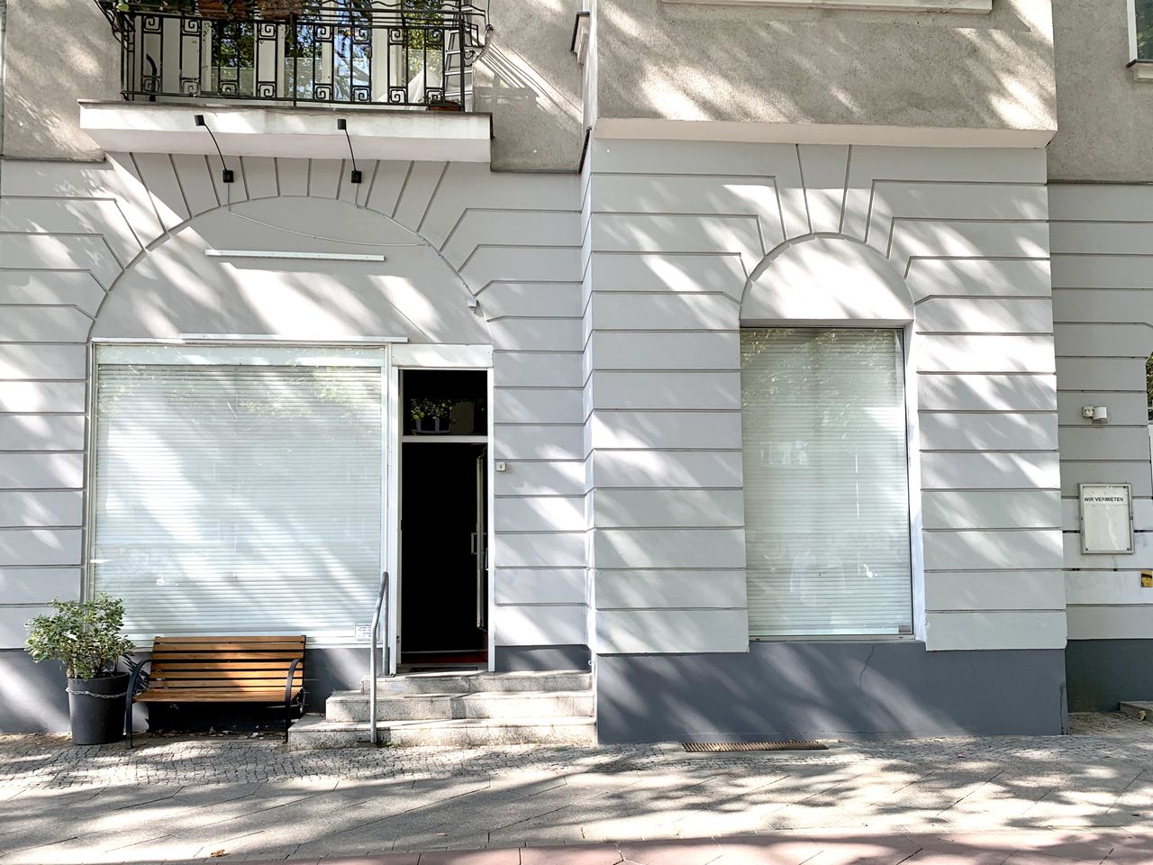 Haus: Altbau in Friedenau, große Straße vor der Tür mit Bürgersteig und Bank vor dem Fenster
