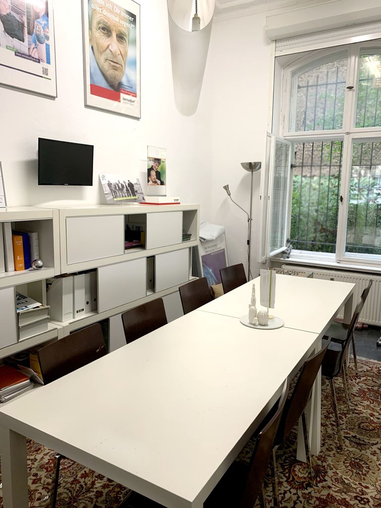 Ein hinterer Raum mit Fenster (ein Besprechungsraum). Mit langem Tisch und Blickachse ins vordere Büro. Küche, Küchentresen ebenfalls vorhanden.