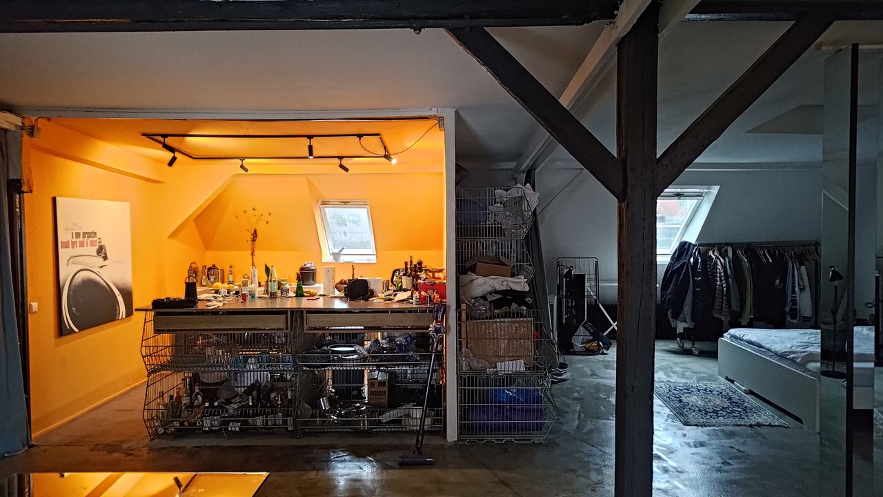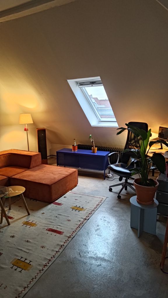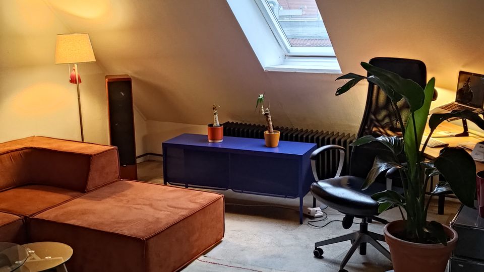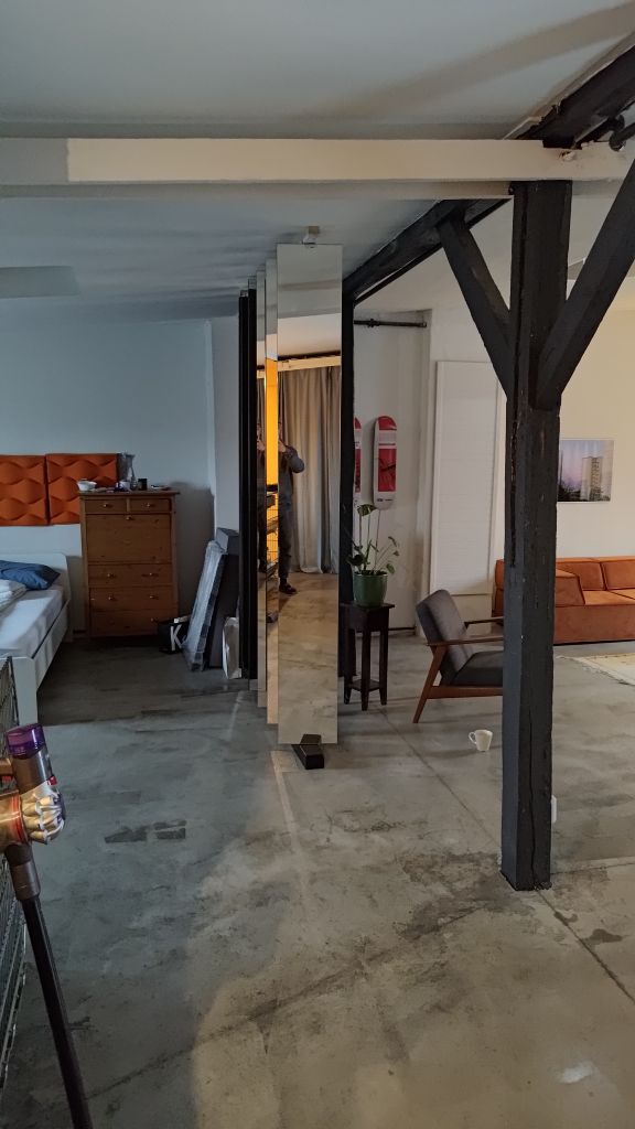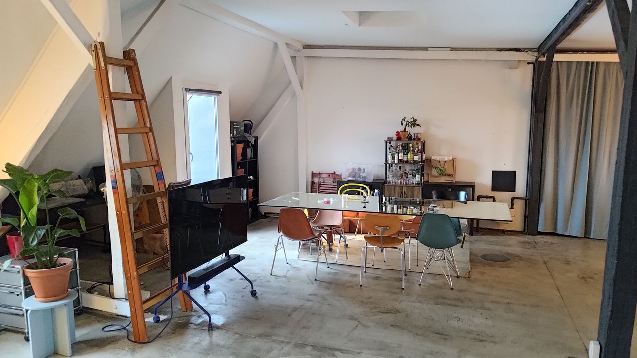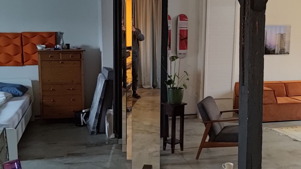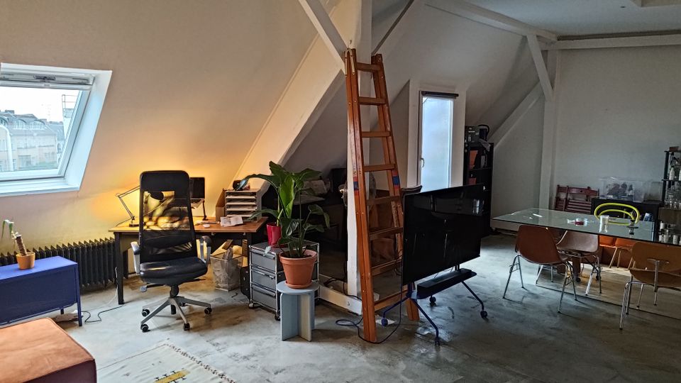 Dachgeschoss Wohnung im Loft Stil in Gewerbegebäude mit Zugang über Leiter zum Flachdach. Wohn und Schlafzimmer sind durch drehbare Wandelemente getrennt. Der Rest ist offen inklusive der Küche.