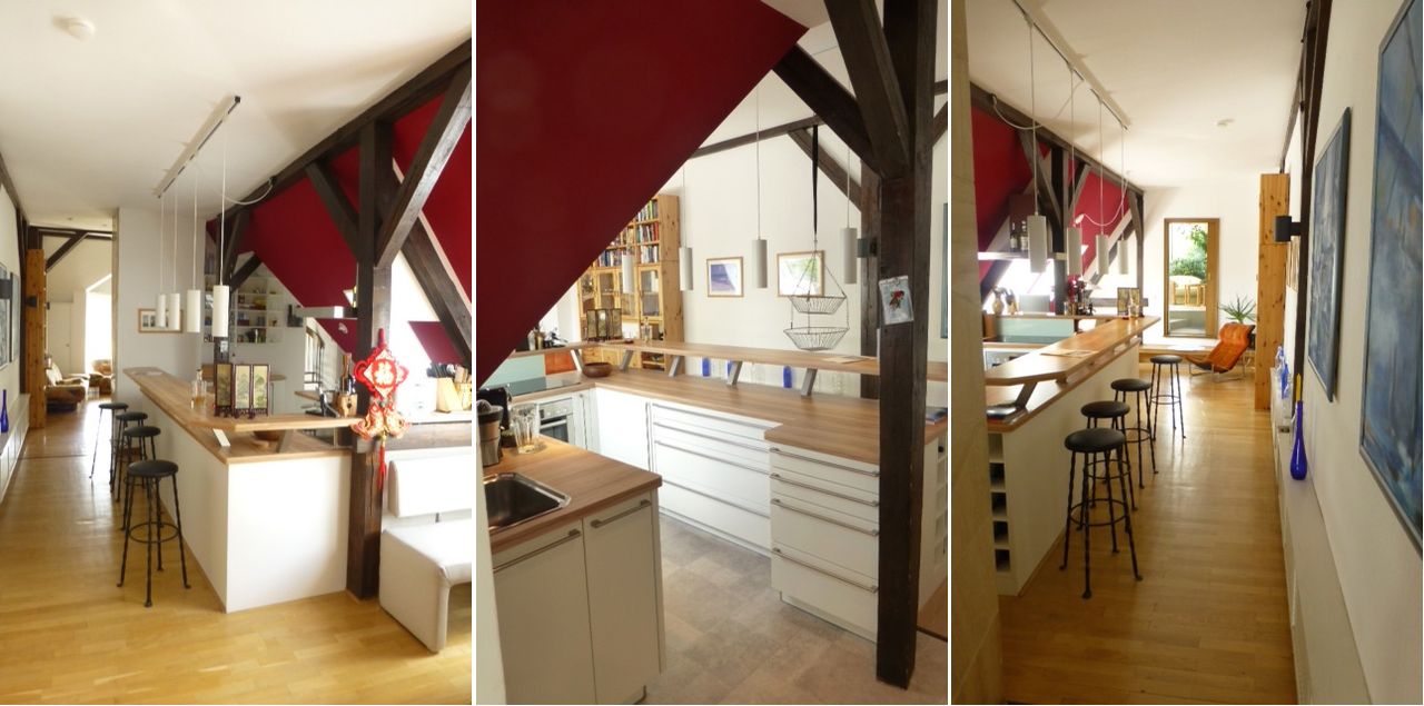 Bei dem Objekt handelt es sich um einen Dachgeschosswohnung mit Wintergarten und großer Dachterrasse. Die Wohnung ist sehr offen gestaltet, d.h. Wohnzimmer, Küche mit Tresen und Esszimmer gehen ineinander über. Das Arbeitszimmer befindet sich auf einer Empore mit großer Fensterfront, von der man eine gute Aussicht auf die Dachterrasse und über Berlin hat.