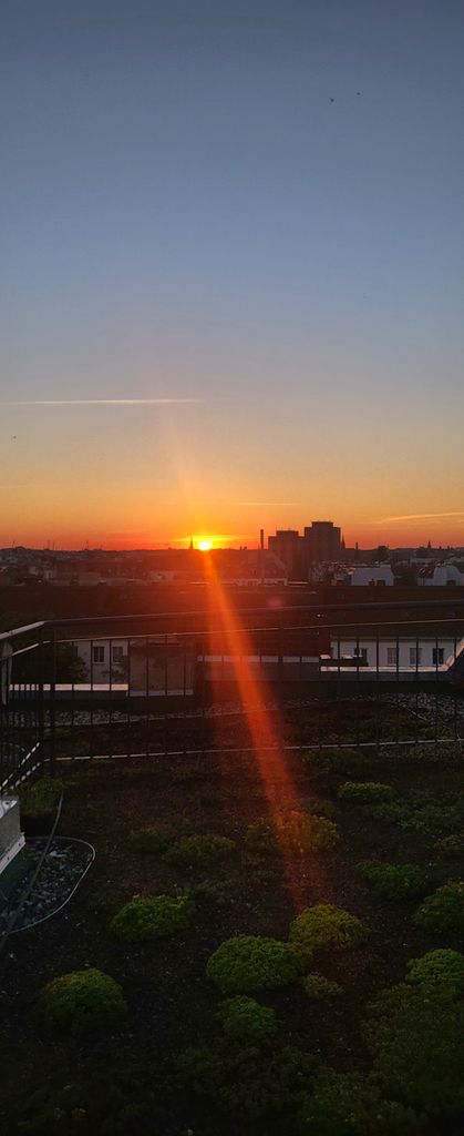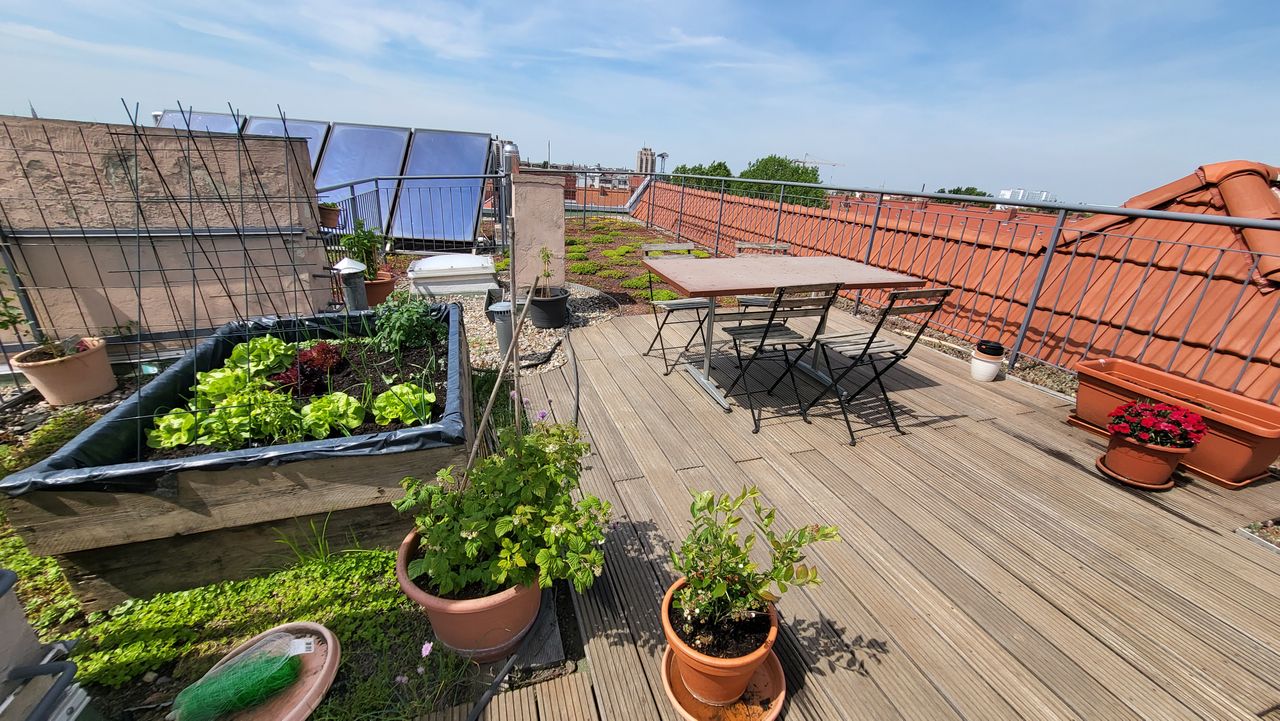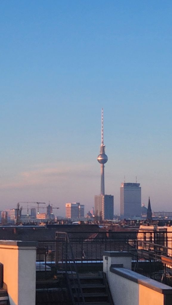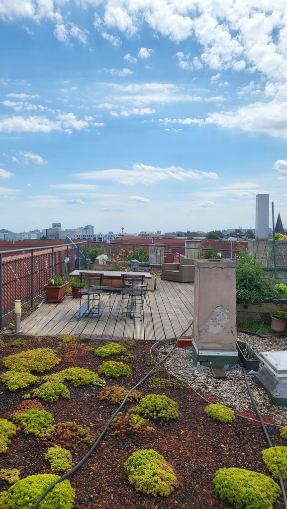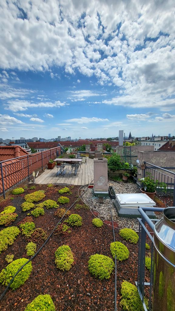 Die Dachterrasse ist ca. 40m2 groß und hat einen tollen Blick auf die Skyline mit Fernsehturm. Es gibt in der Umgebung kein höheres Gebäude, dass die 360°Aussicht stehlen könnte. Ein Fahrstuhl in den 5. Stock ist vorhanden und eine Wendeltreppe welche die untere Terrasse von der Dachterrasse trennt.