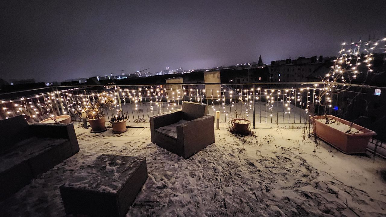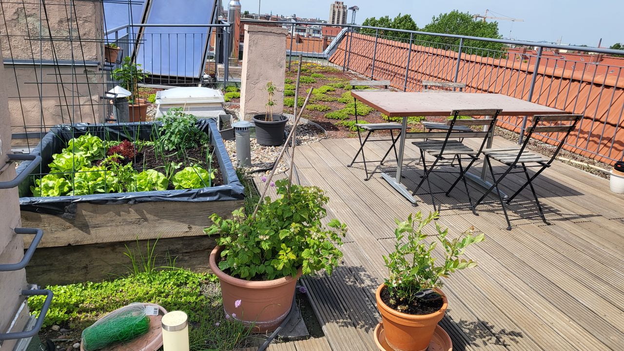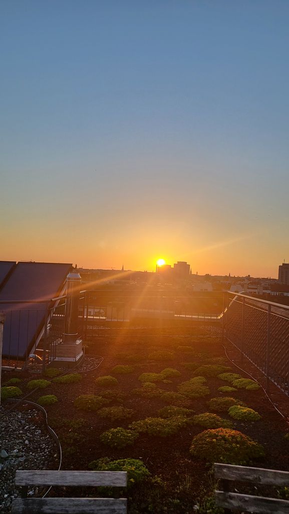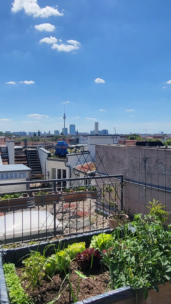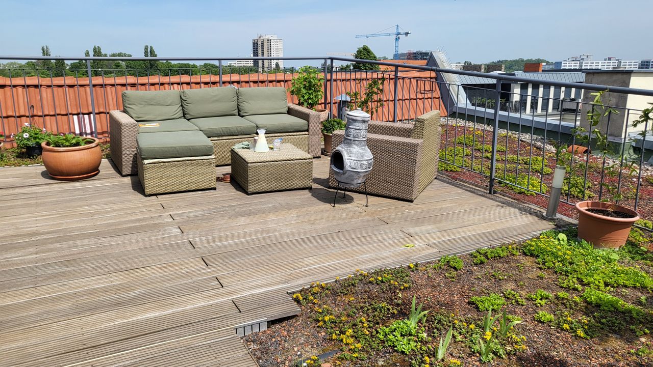 Die Dachterrasse ist ca. 40m2 groß und hat einen tollen Blick auf die Skyline mit Fernsehturm. Es gibt in der Umgebung kein höheres Gebäude, dass die 360°Aussicht stehlen könnte. Ein Fahrstuhl in den 5. Stock ist vorhanden und eine Wendeltreppe welche die untere Terrasse von der Dachterrasse trennt.