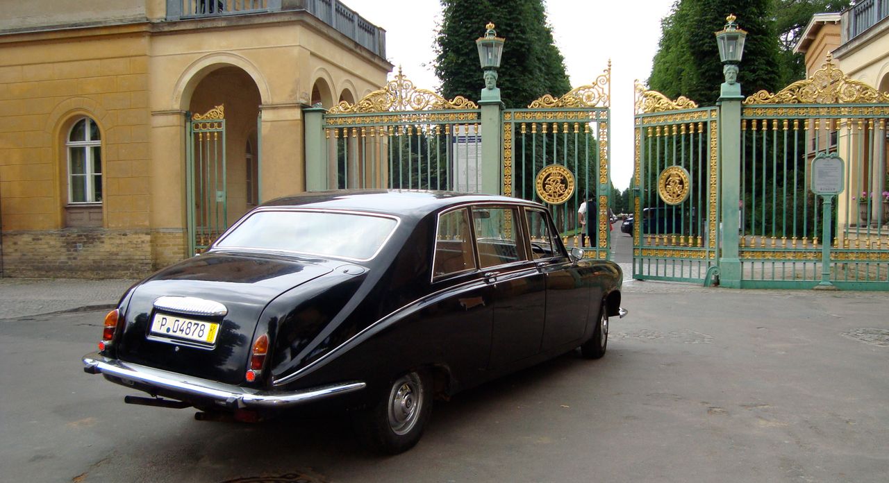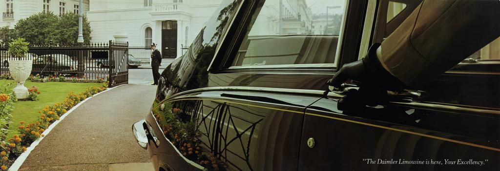 Diese schwarze Daimler Limousine ist auch bekannt als "Queens Car". Das Limousine ist sehr geräumig und deshalb gut geeignet für Filmaufnahmen. Sie wurde zwischen 1968 und 1992 produziert und in der ganzen Zeit haben sich Form und Stil des Wagens nicht geändert. Die „Queens Car“ ist in vielen Bond Filmen zu sehen und kam ebenfalls in der berühmten „Omen“ Filmserie“ zum Einsatz.