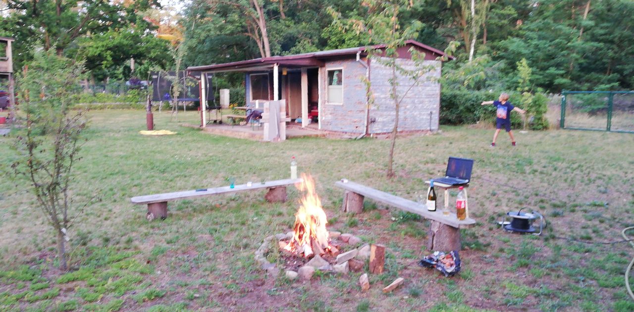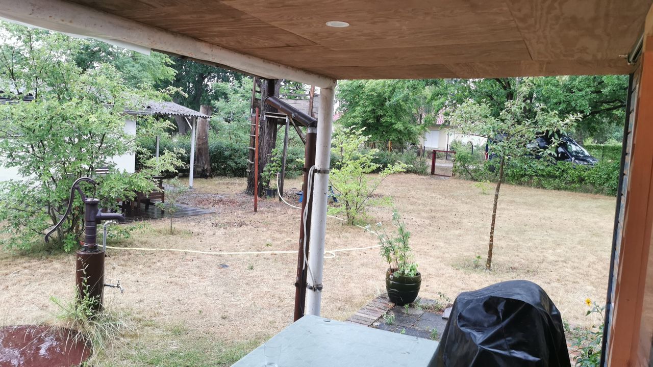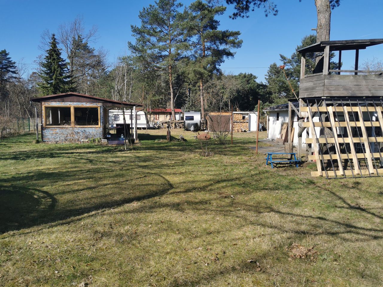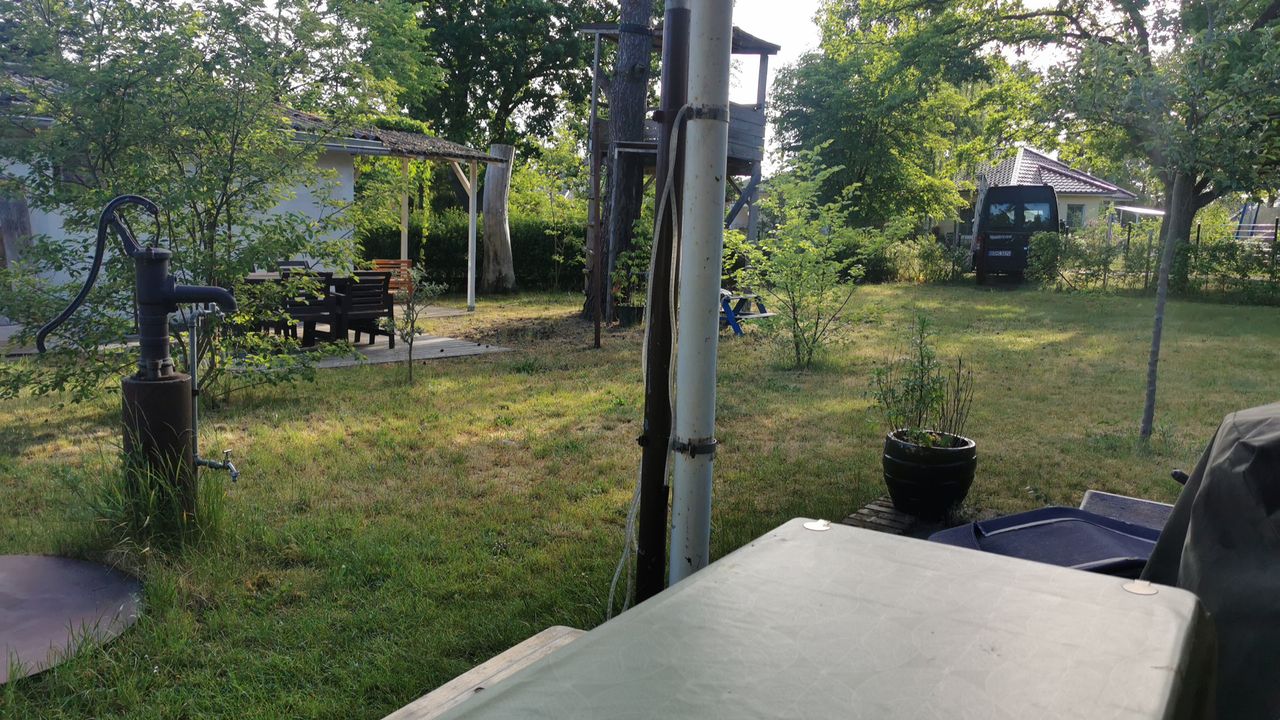 Es handelt sich um ein Freizeitgrundstück mit einem Haus das als Gemeinschaftsküche mit Tisch und Bänken umgebaut wurde, einem Haus mit 2 kleinen Zimmern zum schlafen, ein WC mit Waschbecken, 2 Wohnwägen ( einer neu und der 2te aus den 80gern) und einem Geräteschuppen. Im Küchenhaus ist einen Küchenzeile und ein Küchenblock aus Multiplex und eine Bierbankgarnitur. Im Wohnhaus ist je Zimmer ein Doppelbett.