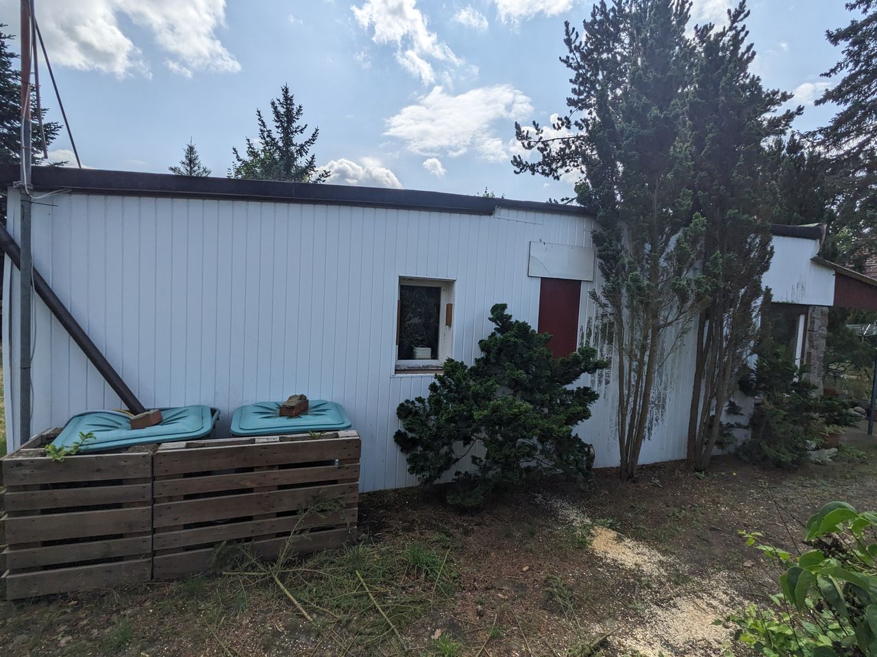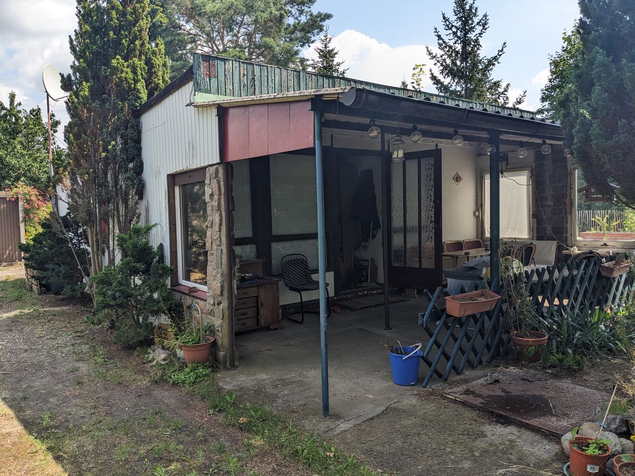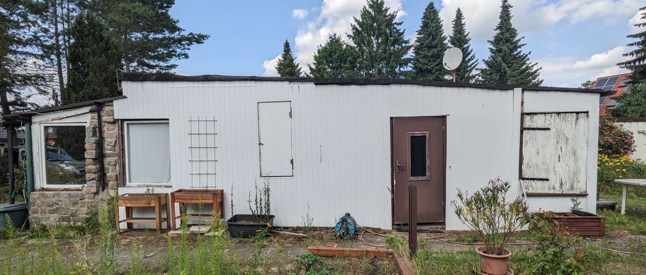 Alter DDR- Bungalow Typ B22 mit zusätzlichen Anbau auf einem Baurundstück mit Garten (800m²). Umgebung sehr grün mit vielen Bäumen. Eine Garage ist ebenfalls auf dem Grundstück vorhanden.