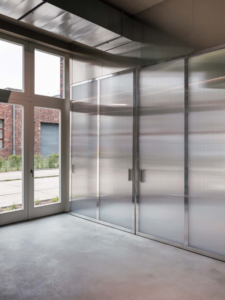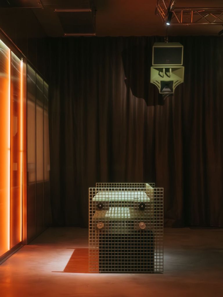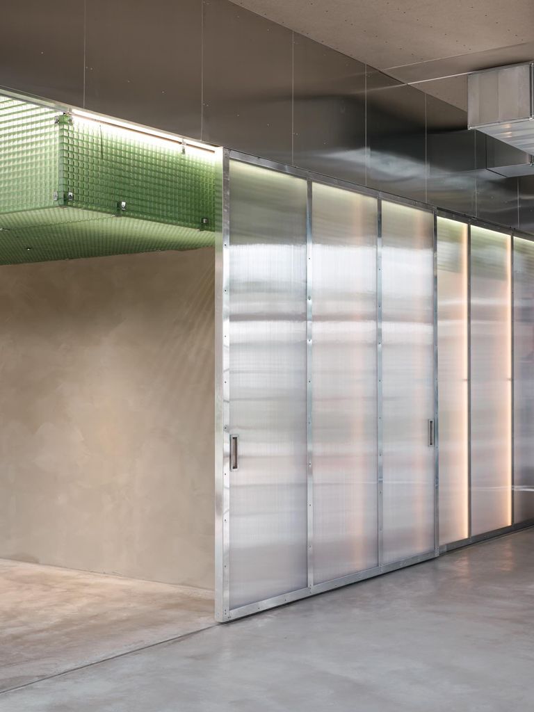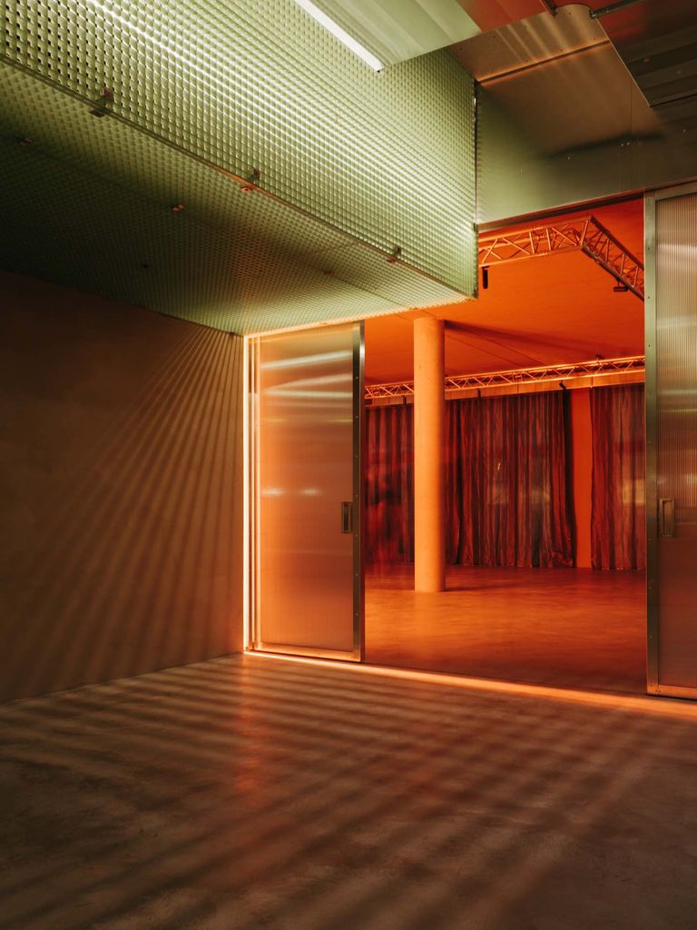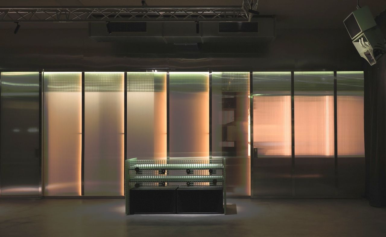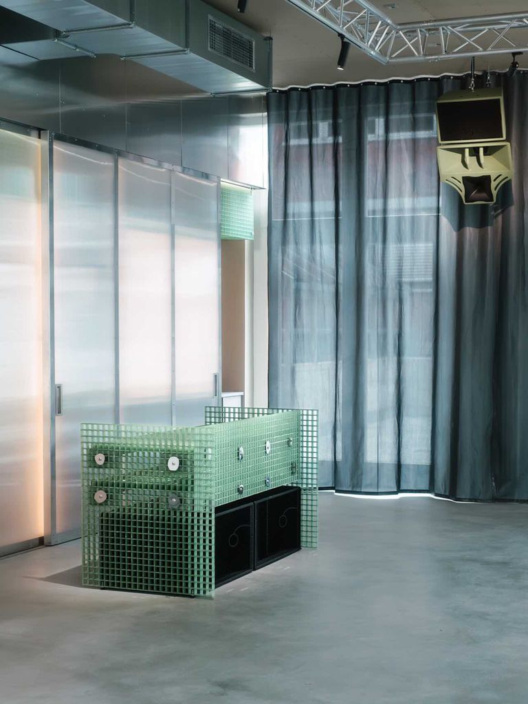 Durch eigens angefertigte Stellwände lässt sich der 400 Quadratmeter große Raum flexibel zonieren. Sie wurden speziell für das Projekt aus Aluminiumprofilen gefertigt und mit Polycarbonat gefüllt. Die Gummiverkleidung der Bar, die den Mittelpunkt des Raumes bildet, stammt aus der Förderbandindustrie. Aus Gitterrosten, die in Industriehallen als Deckenverkleidung zum Einsatz kommen, ließen sie eine DJ-Kabine bauen. Bandenabsperrnetze von Tennisplätzen dienen im als Vorhänge. Was alle Materialien gemeinsam haben: Sie sind transluzent und reagieren auf Lichtveränderungen.