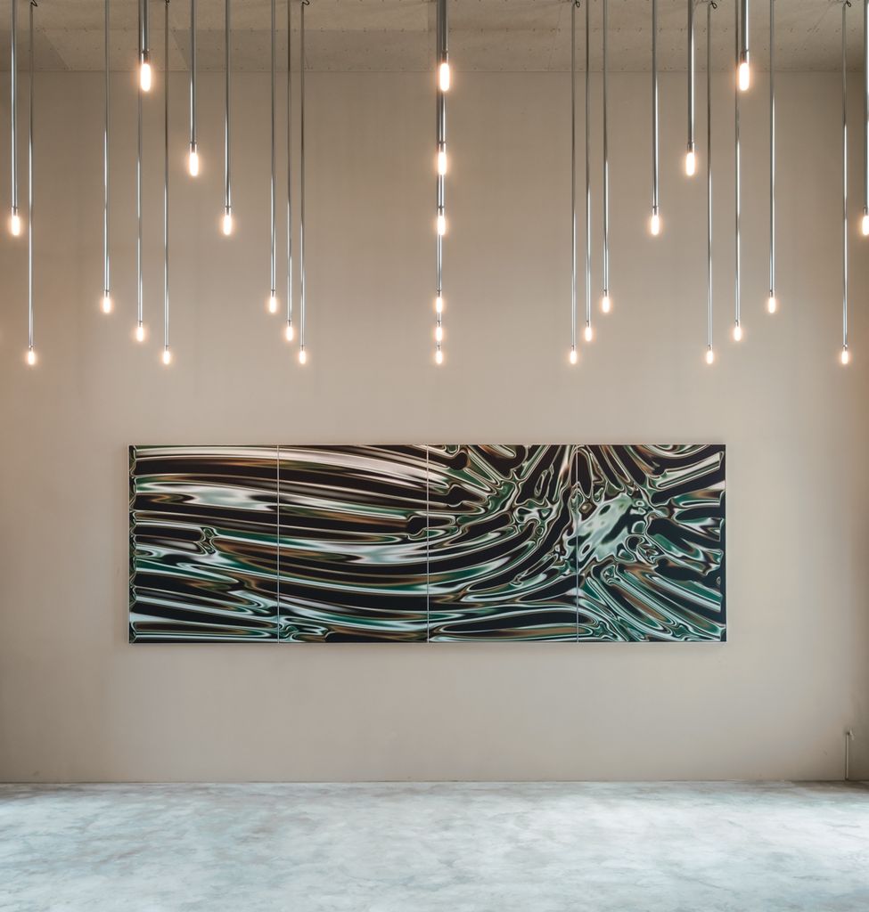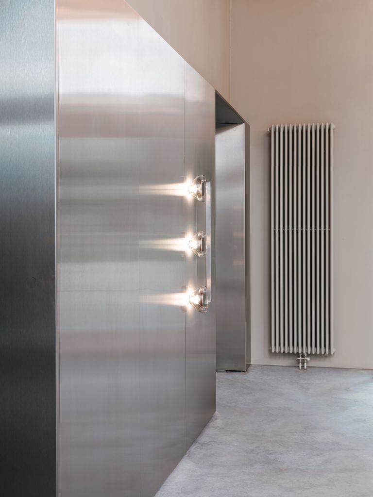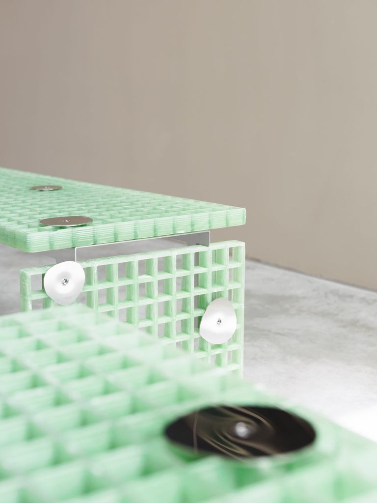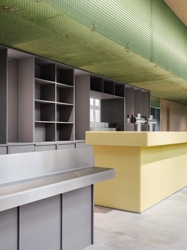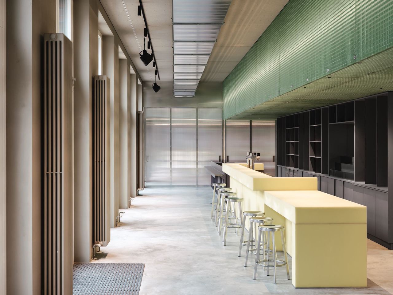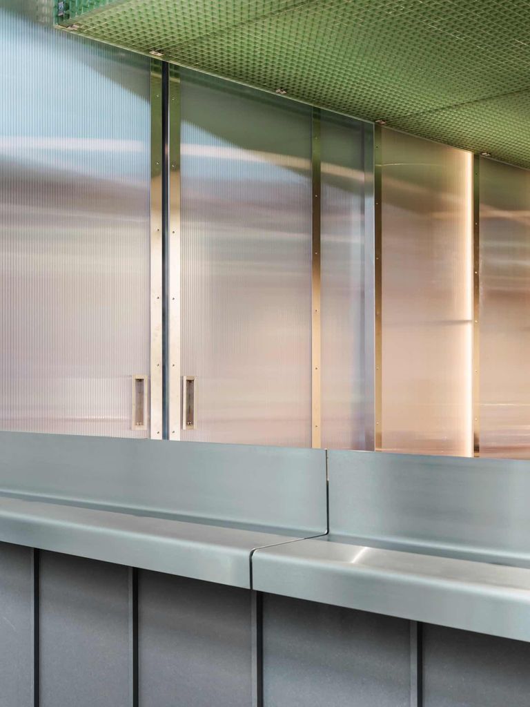 Durch eigens angefertigte Stellwände lässt sich der 400 Quadratmeter große Raum flexibel zonieren. Sie wurden speziell für das Projekt aus Aluminiumprofilen gefertigt und mit Polycarbonat gefüllt. Die Gummiverkleidung der Bar, die den Mittelpunkt des Raumes bildet, stammt aus der Förderbandindustrie. Aus Gitterrosten, die in Industriehallen als Deckenverkleidung zum Einsatz kommen, ließen sie eine DJ-Kabine bauen. Bandenabsperrnetze von Tennisplätzen dienen im als Vorhänge. Was alle Materialien gemeinsam haben: Sie sind transluzent und reagieren auf Lichtveränderungen.