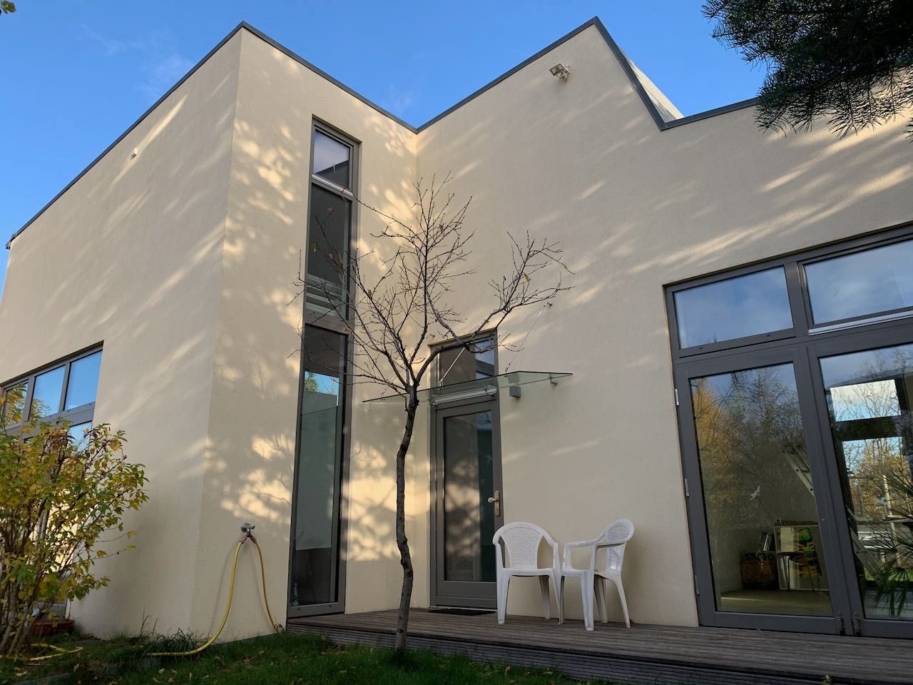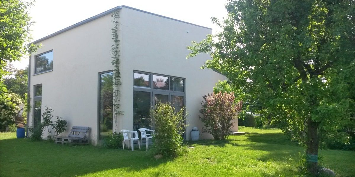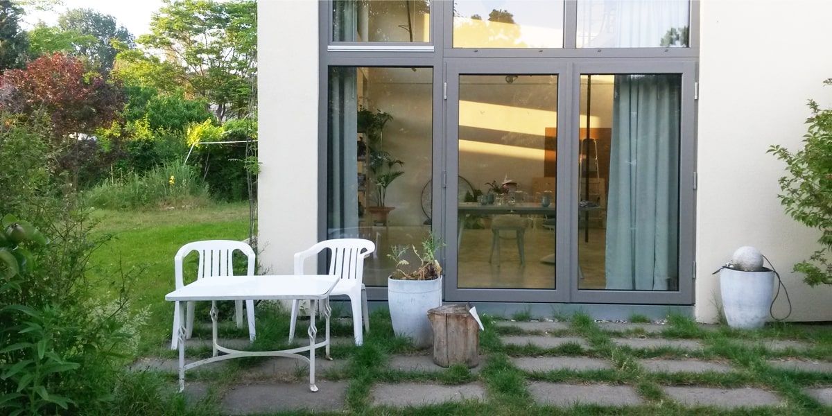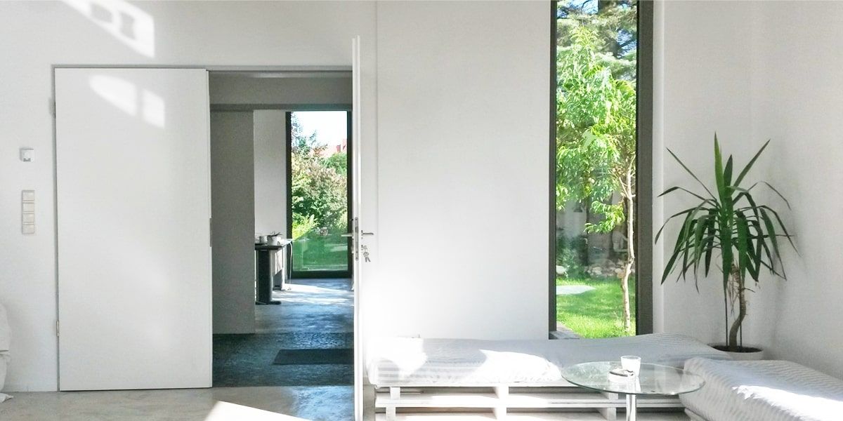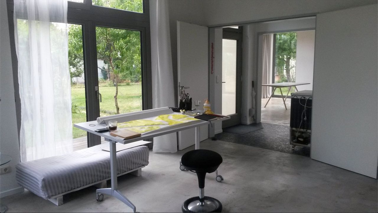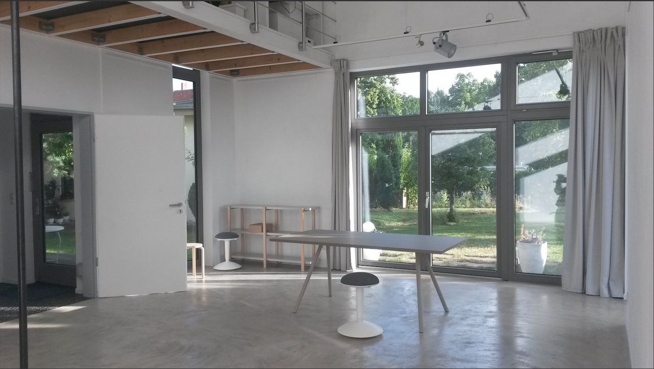 Zwei helle Ateliers 40 und 24 m², Decken hoch ansteigend bis auf 5,40 m, mit weiten Flügeltüren zum zentralen Empfang. Innerstädtisch, dennoch ruhig gelegen, barrierefrei mit guten Park- und Lademöglichkeiten. Teil eines Ensembles von Kreativstudios auf einem großen Gartengrundstück am Schiffahrskanal, mit Landurlaub-Atmosphäre. Verfügbarkeit auch einzeln, auf Anfrage